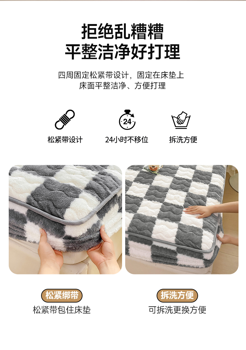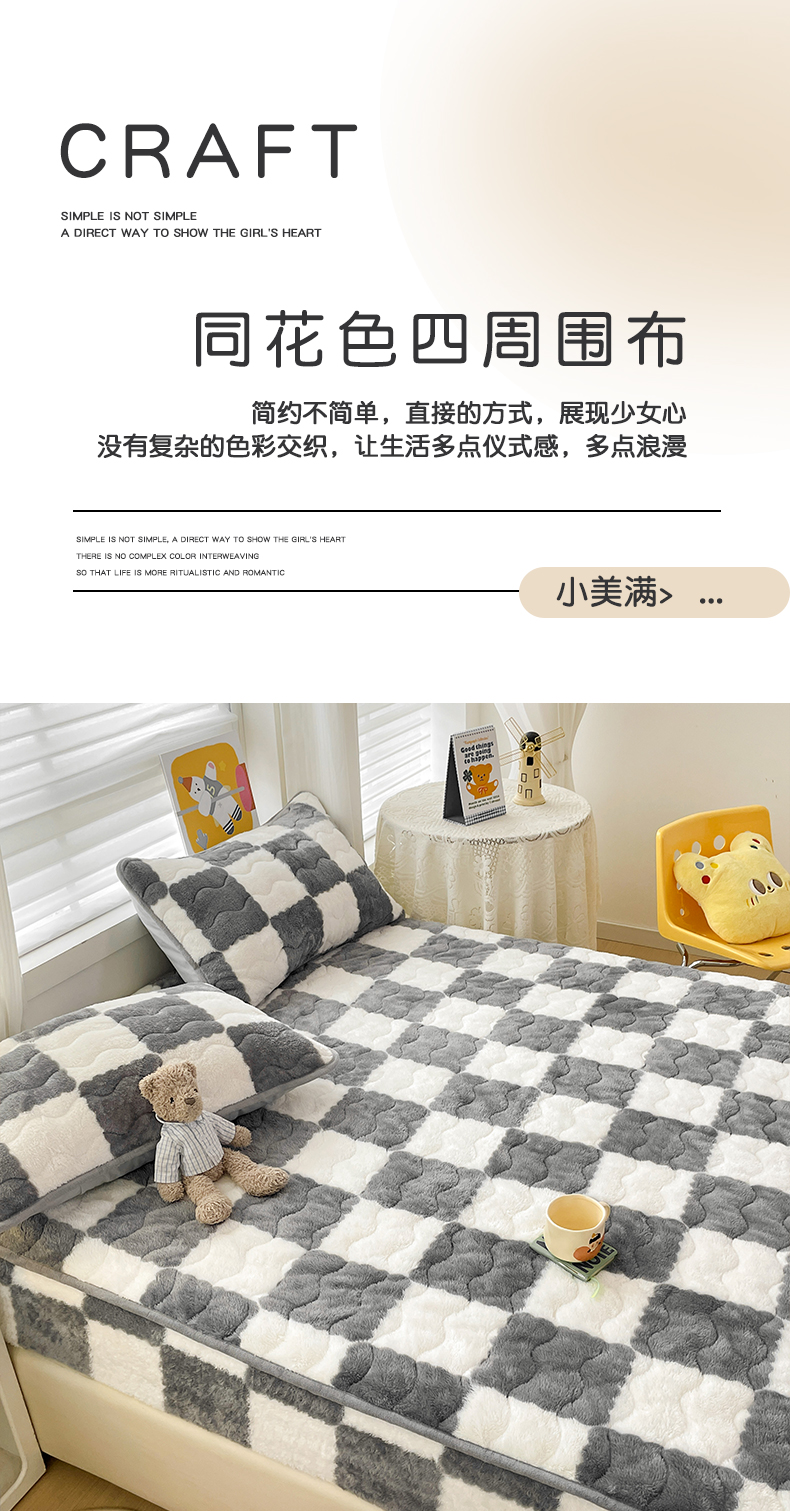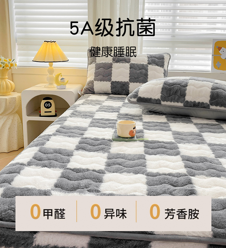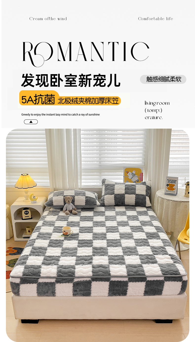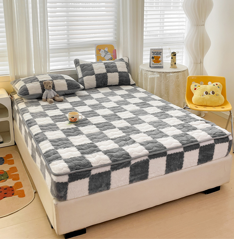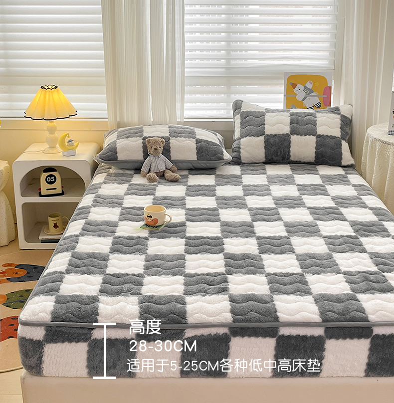 • 91家纺网 家纺一手货源 找家纺 叠派家纺 2024款秋冬北极绒加厚夹棉床笠三件套印花泰迪绒床垫保护罩-格子系列 灰