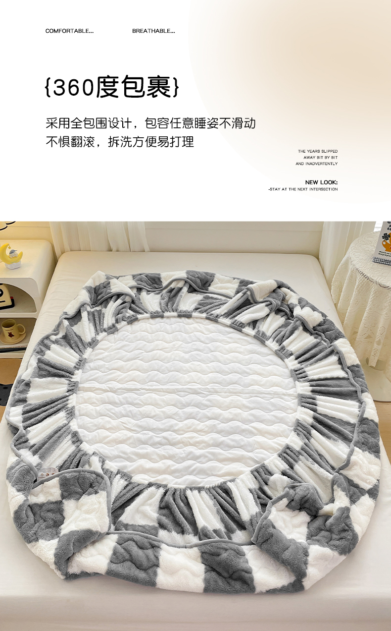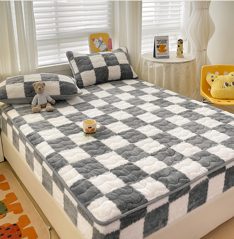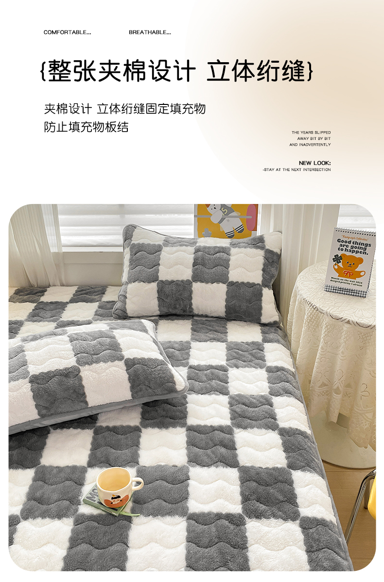 叠派家纺 2024款秋冬北极绒加厚夹棉床笠三件套印花泰迪绒床垫保护罩-格子系列 灰