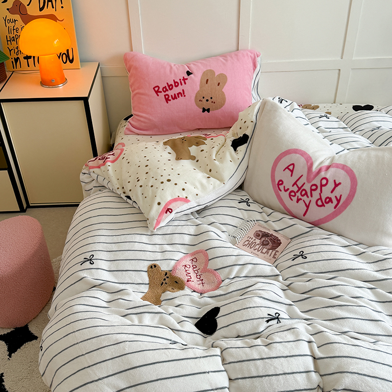 柚子YOUTH 2024新款加厚牛奶绒立体毛巾绣双面印花四件套 爱心小兔