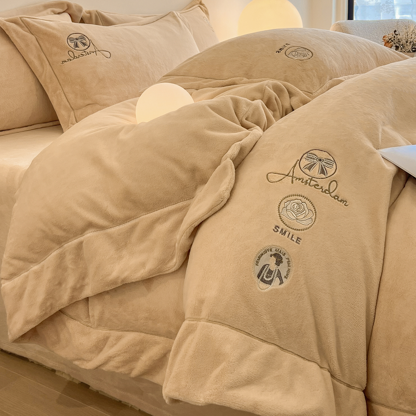 商品名称:新方向 2025新款全消光A类刺绣牛奶绒四件套-伊菲 伊菲-香槟