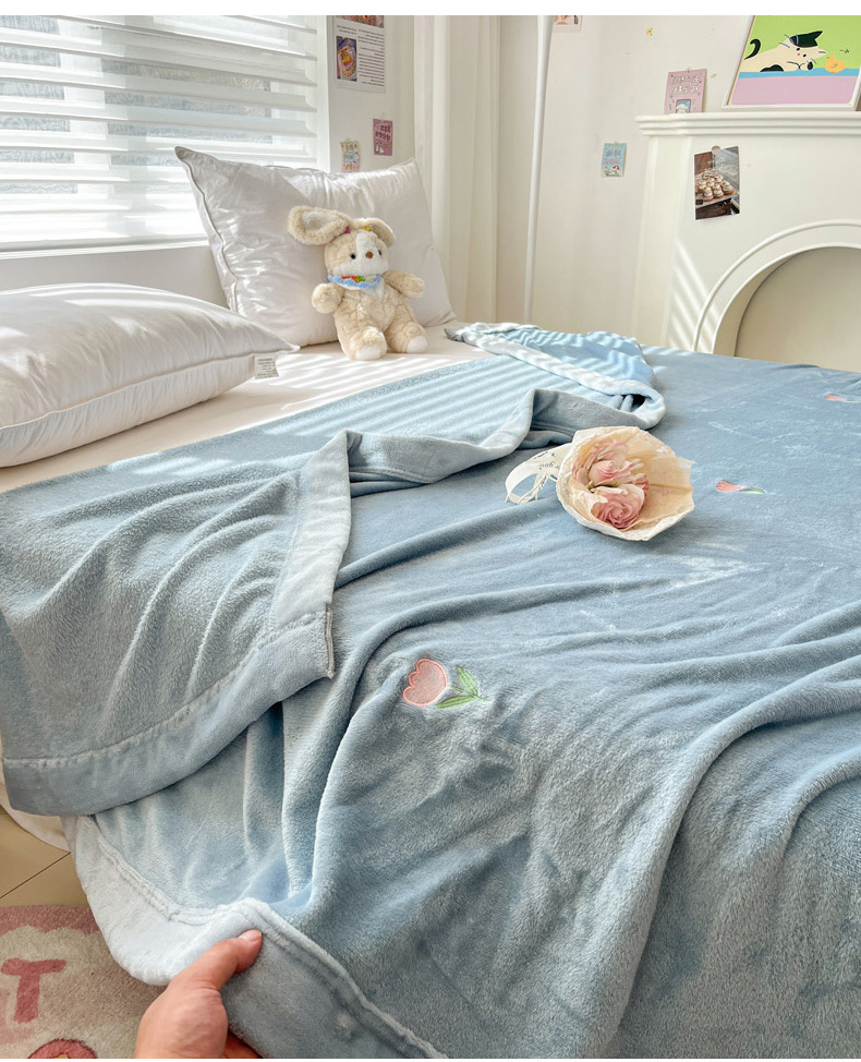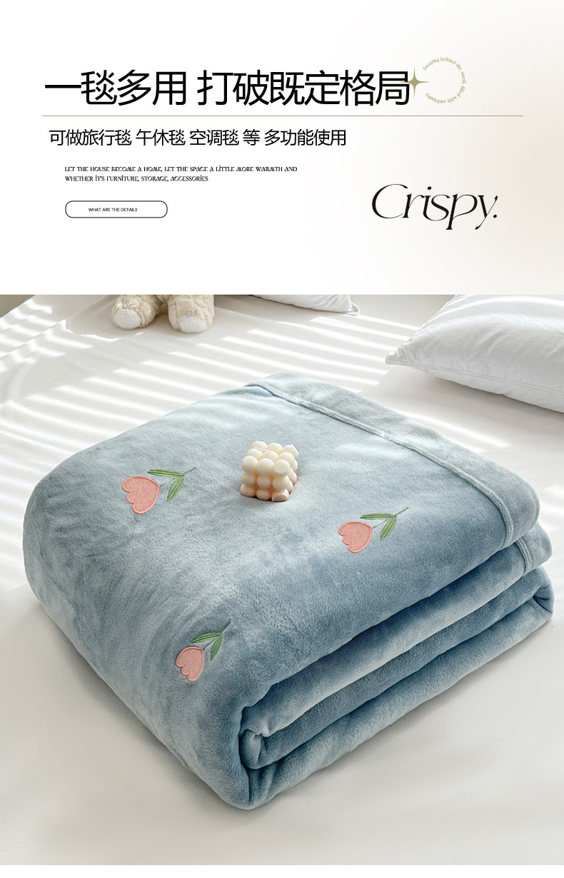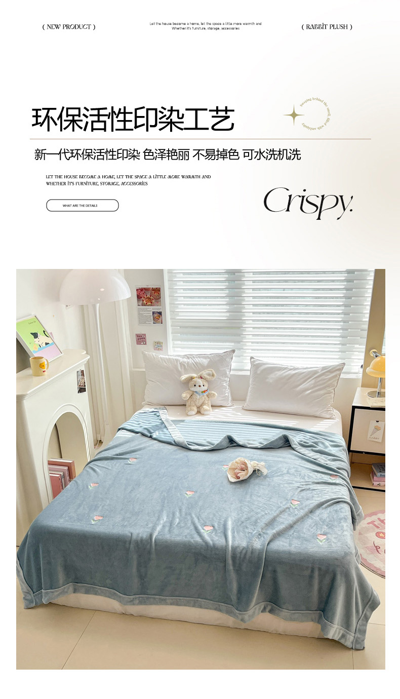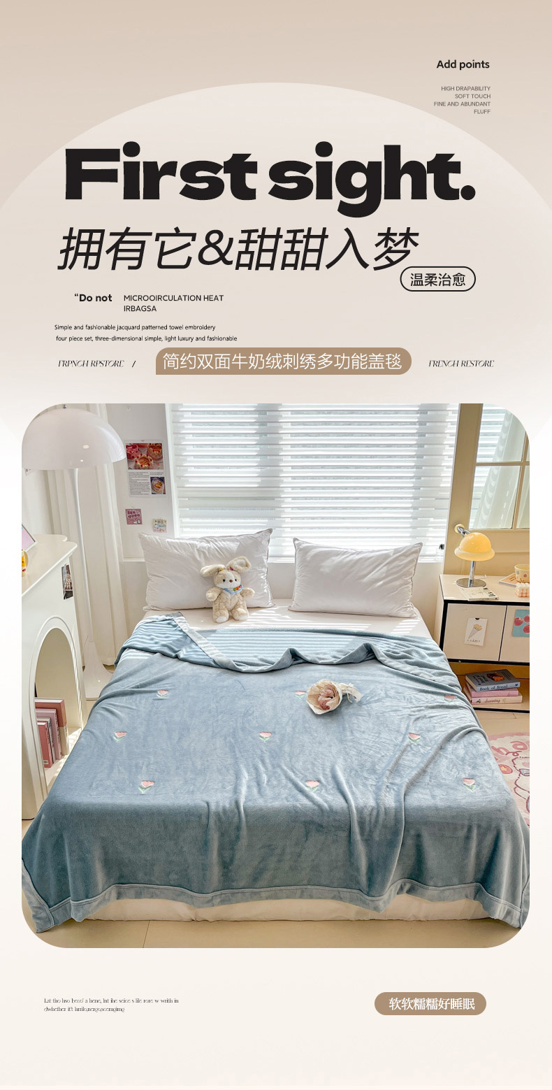 慕尚 2025新款简约双面牛奶绒刺绣多功能盖毯-郁金香 郁金香-蓝