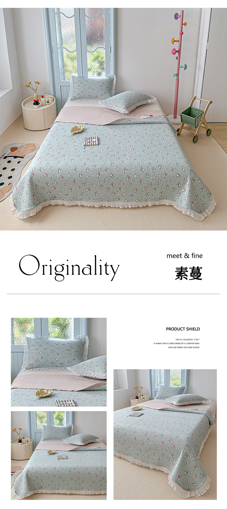 (总)源舜家纺 2025新款色织棉简约韩系花边床盖三件套,简约灰,简约粉,简约绿,简约驼,简约蓝