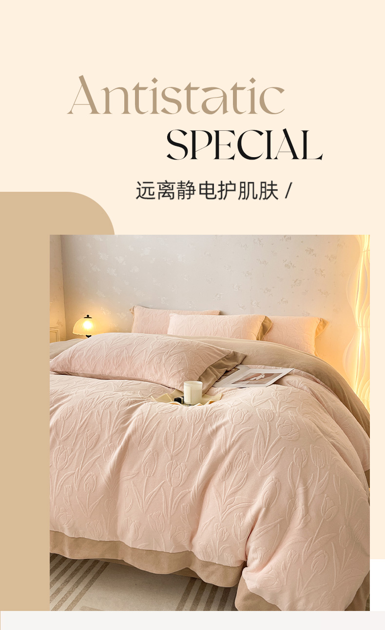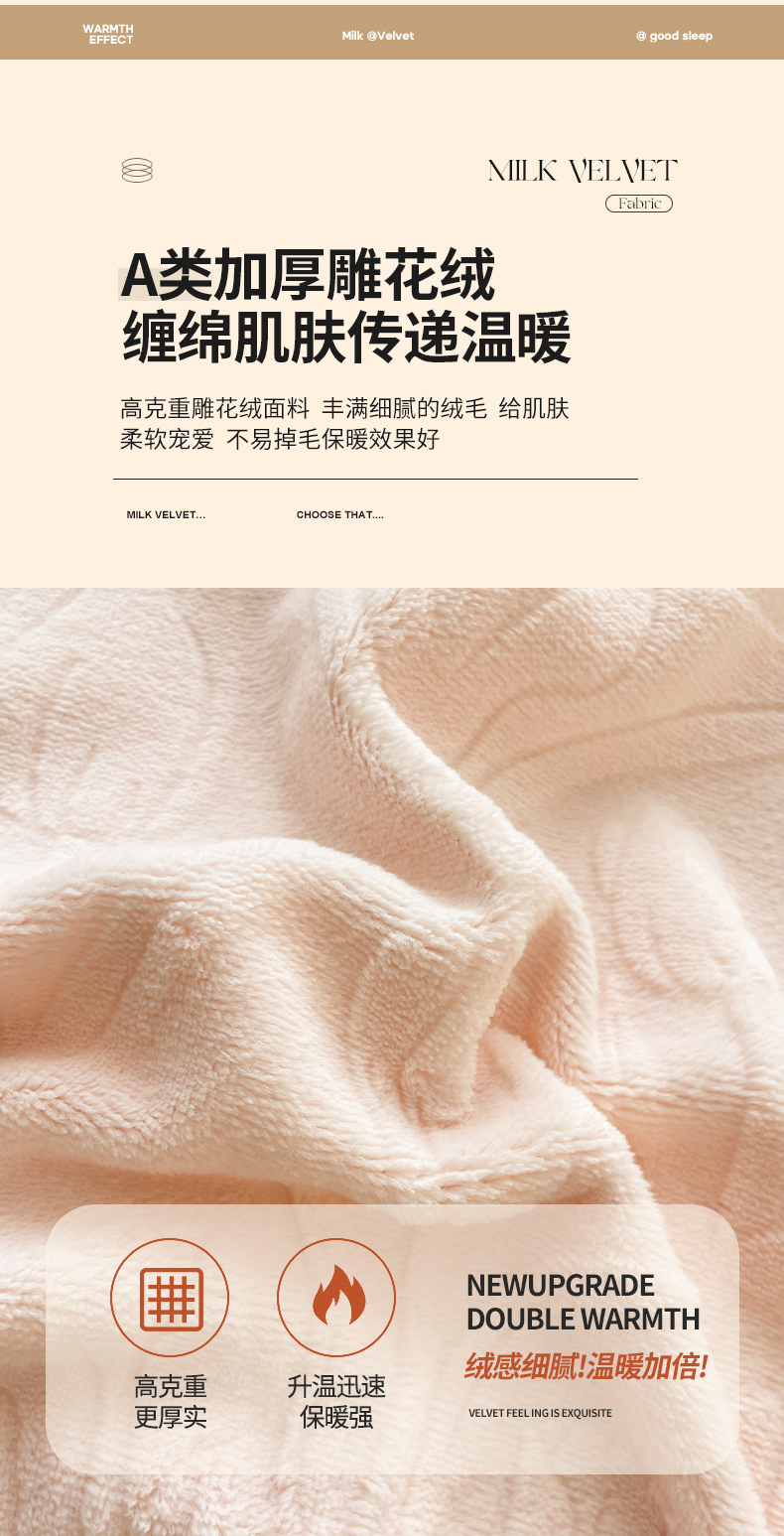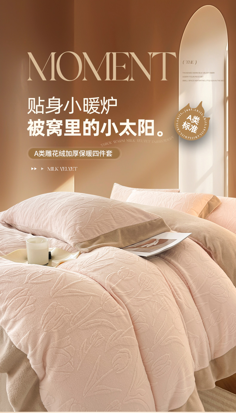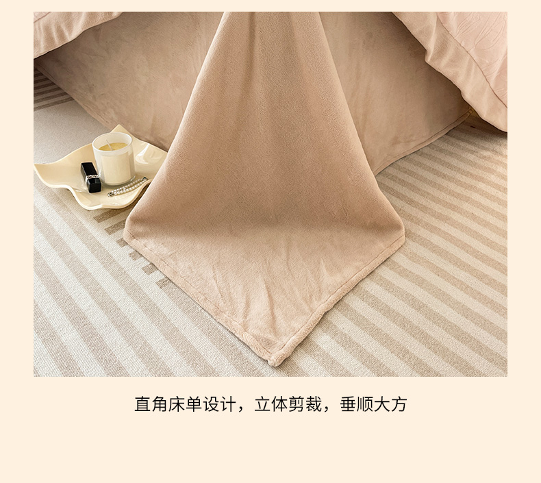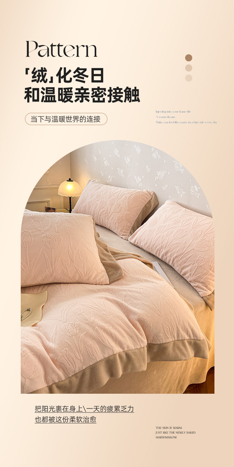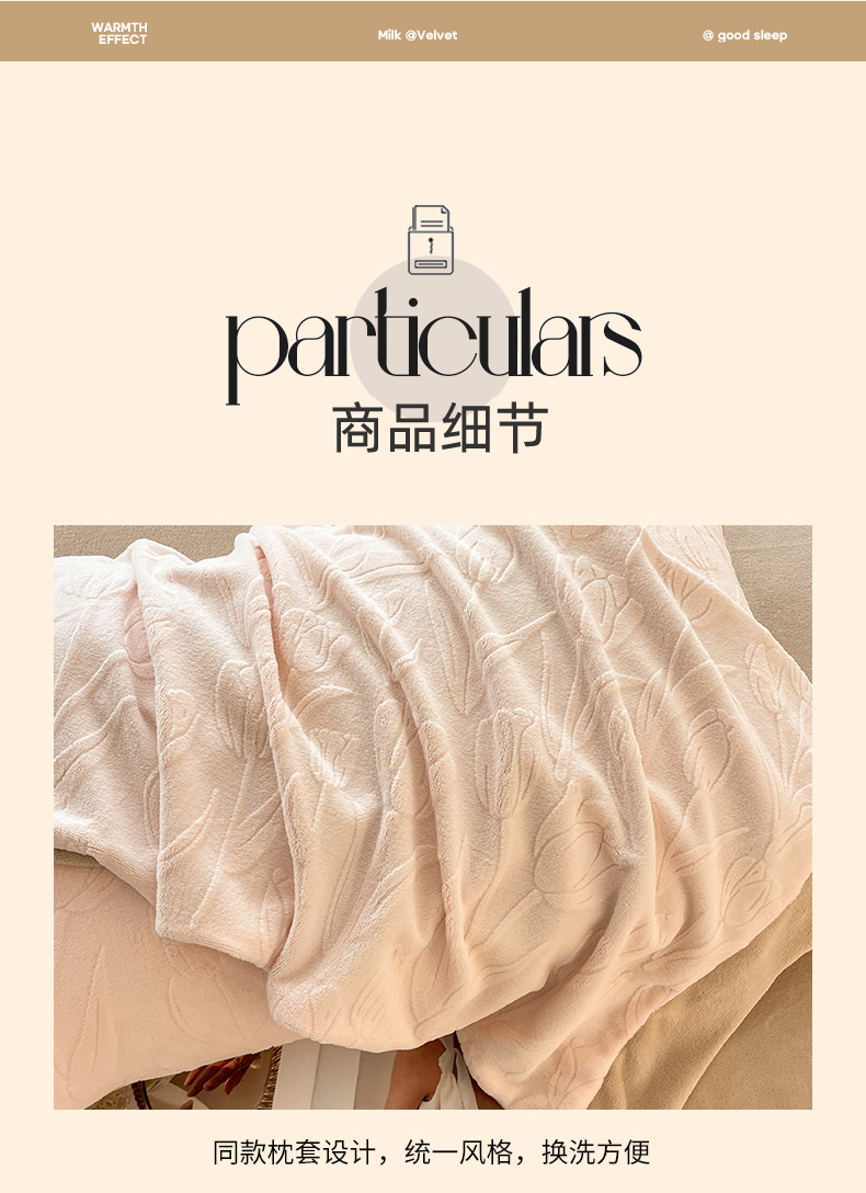 商品名称: 2024秋冬款9斤重高级感雕花牛奶绒四件套加厚珊瑚绒加绒被套床单床笠床上用品-郁金秘语 白桃色