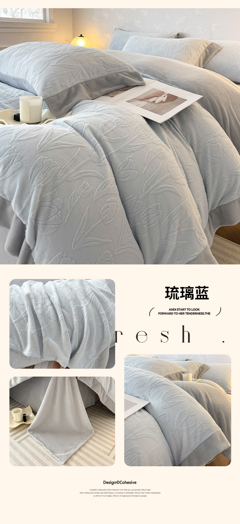 2024秋冬款9斤重高级感雕花牛奶绒四件套加厚珊瑚绒加绒被套床单床笠床上用品-郁金秘语 白桃色