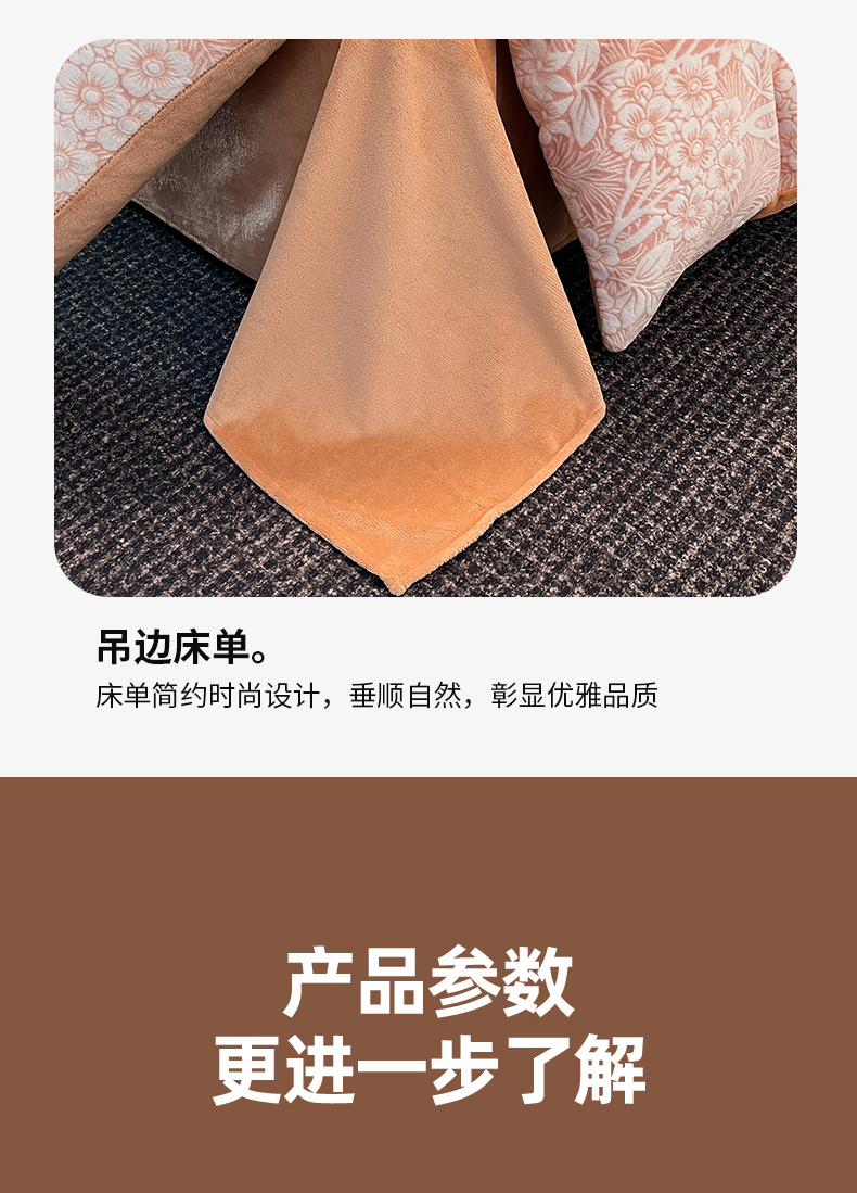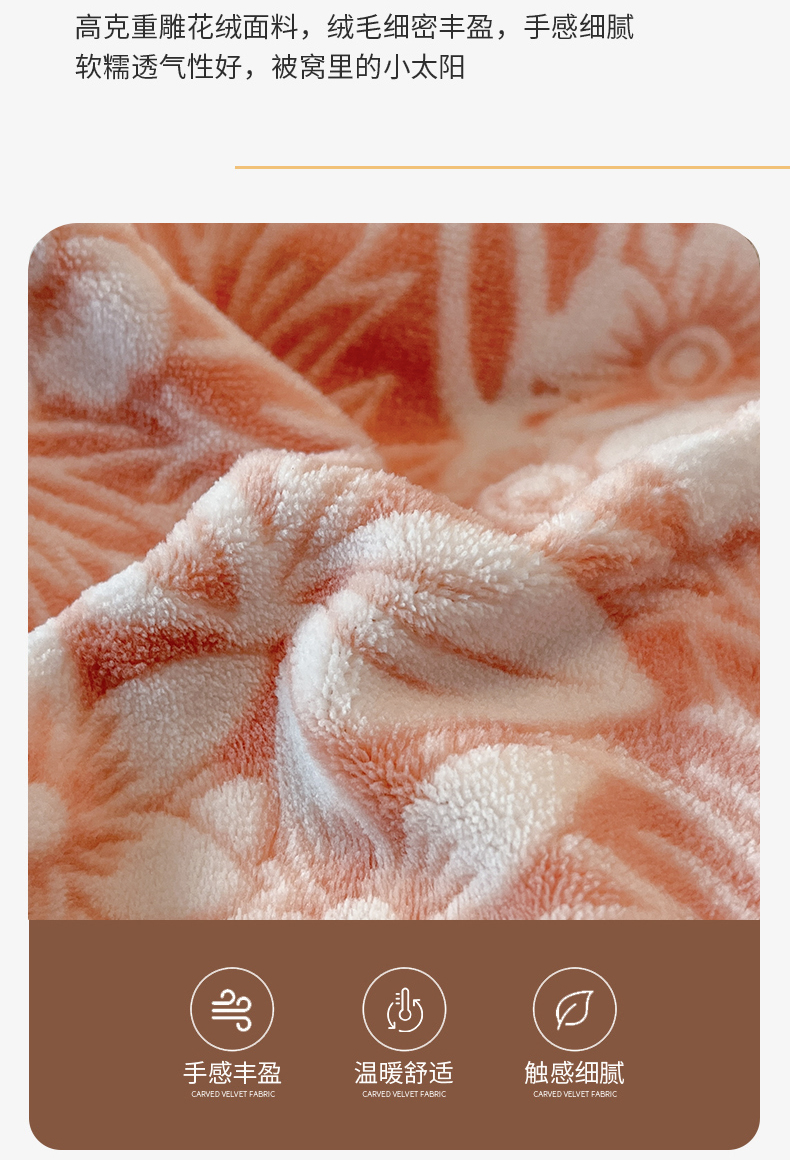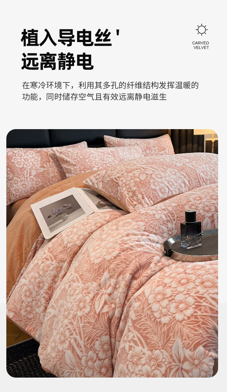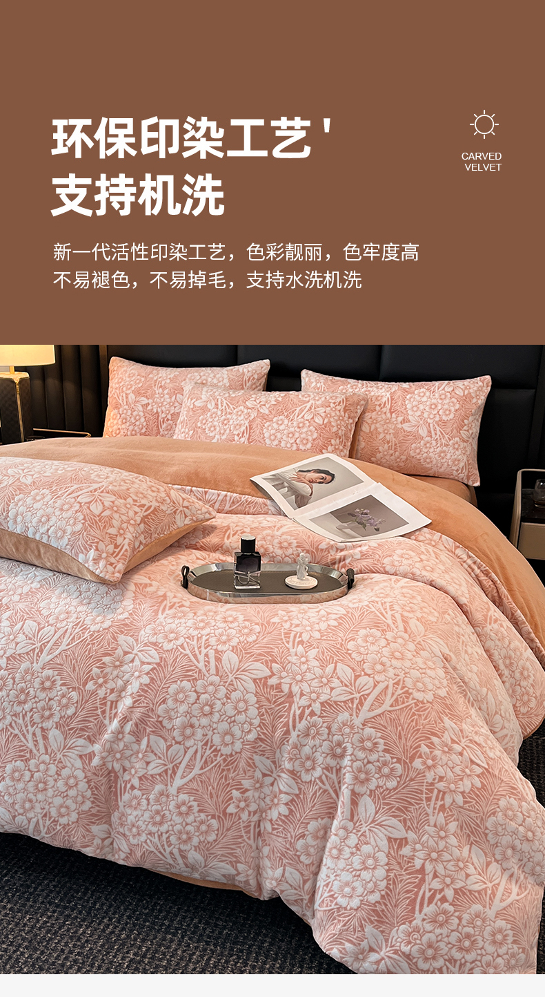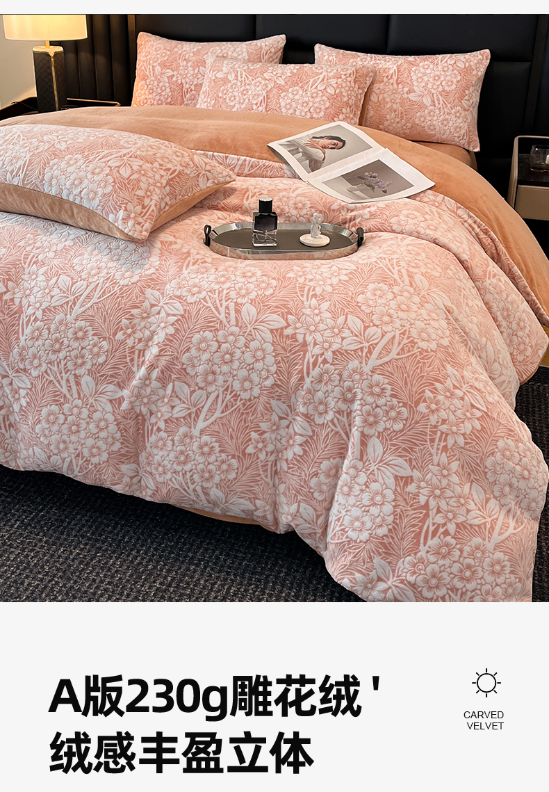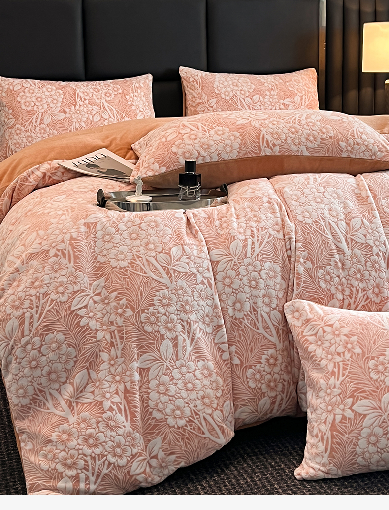 商品名称:玉海棠家纺 2024新款5D立体雕花绒四件套 繁花奶桔
