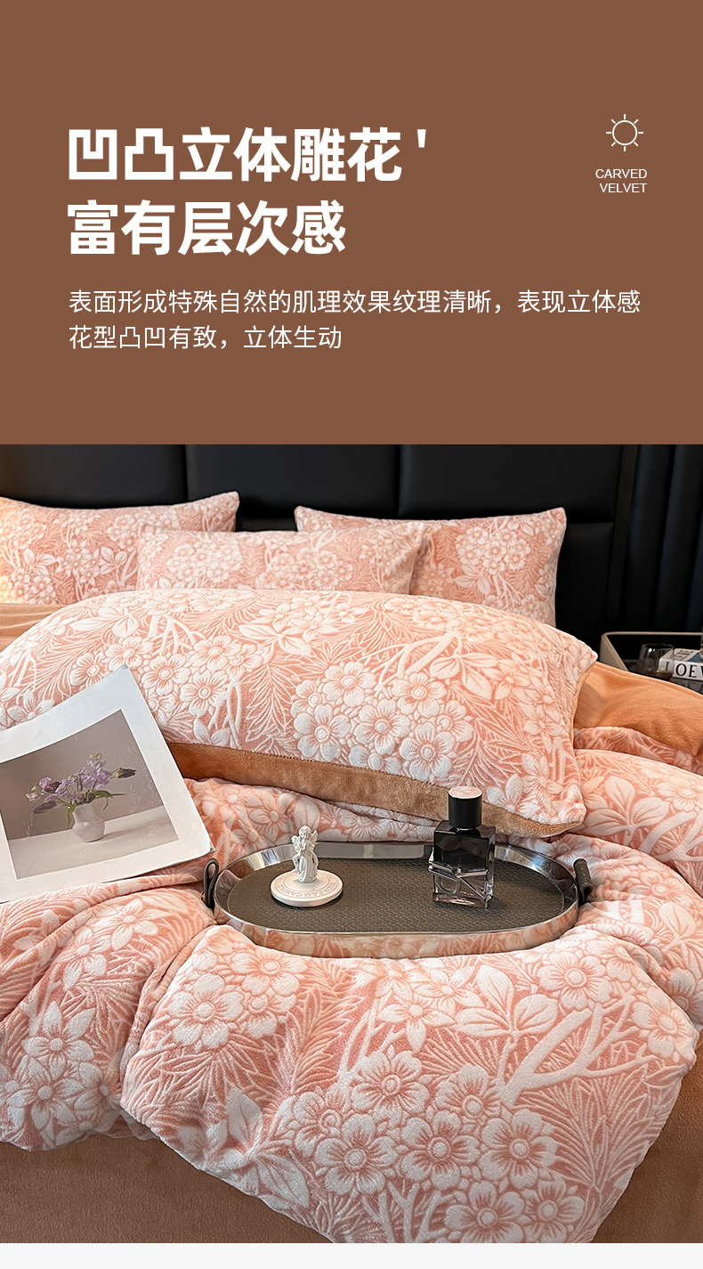 玉海棠家纺 2024新款5D立体雕花绒四件套 繁花奶桔