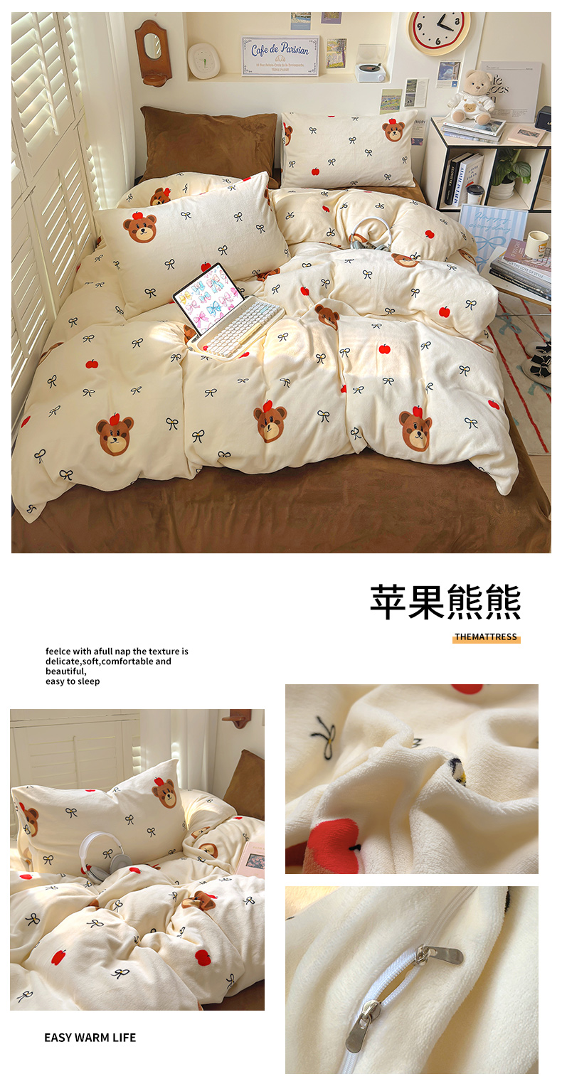 商品名称:山茶家纺 2024新款高克重牛奶绒印花四件套-蝴蝶结系列 苹果熊熊