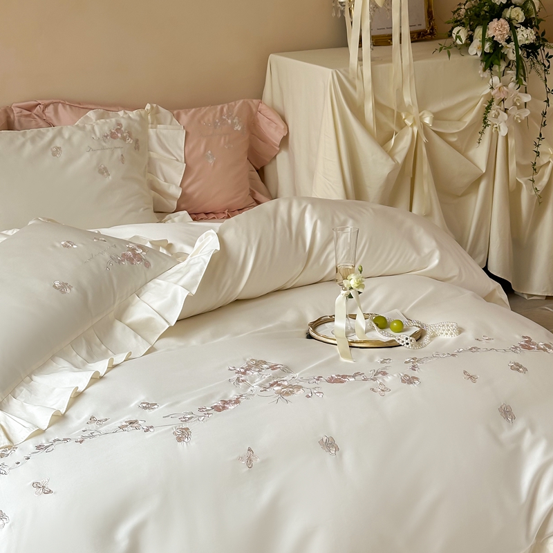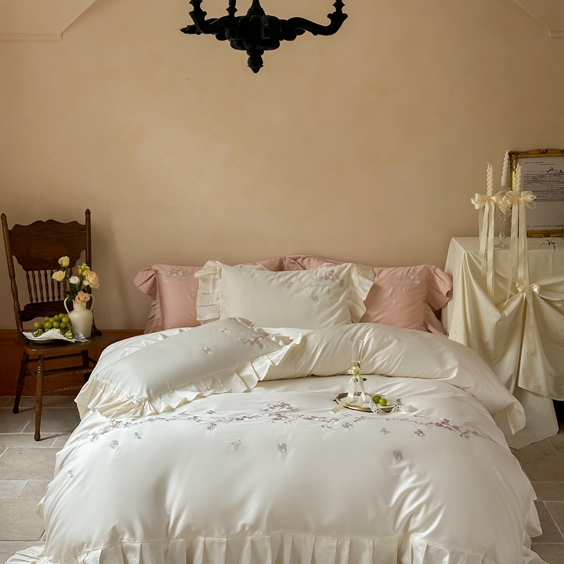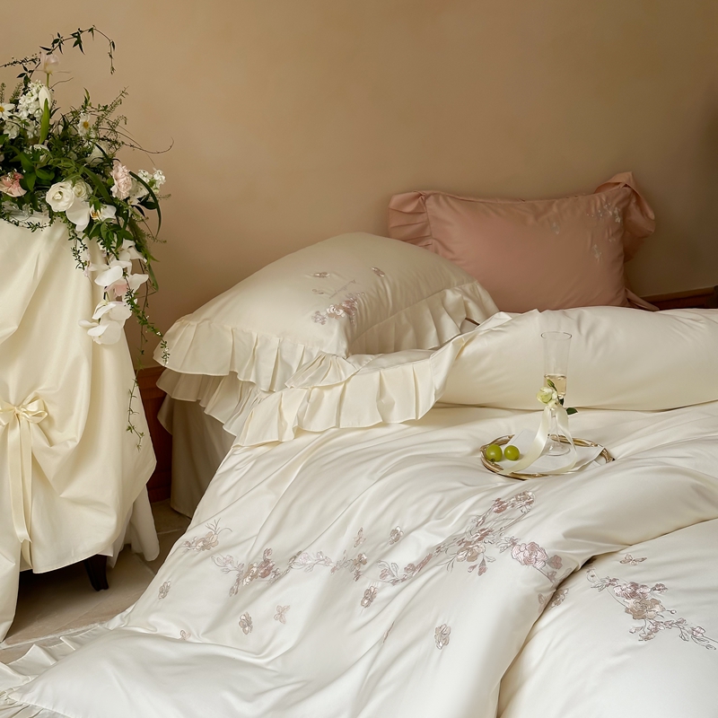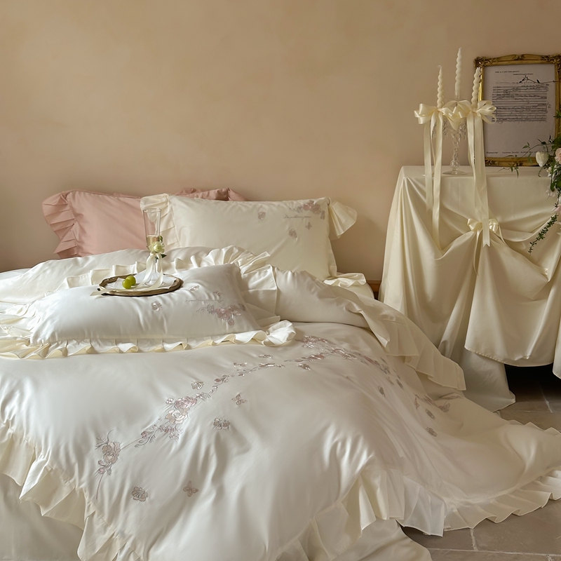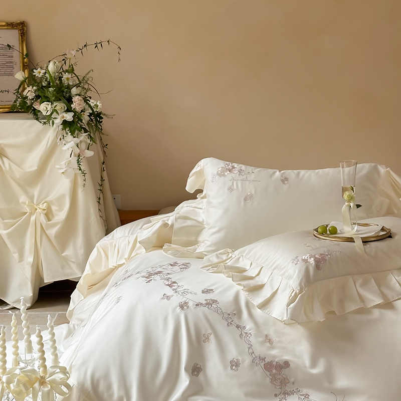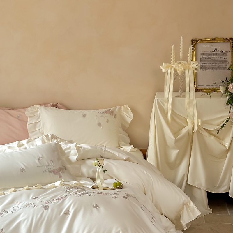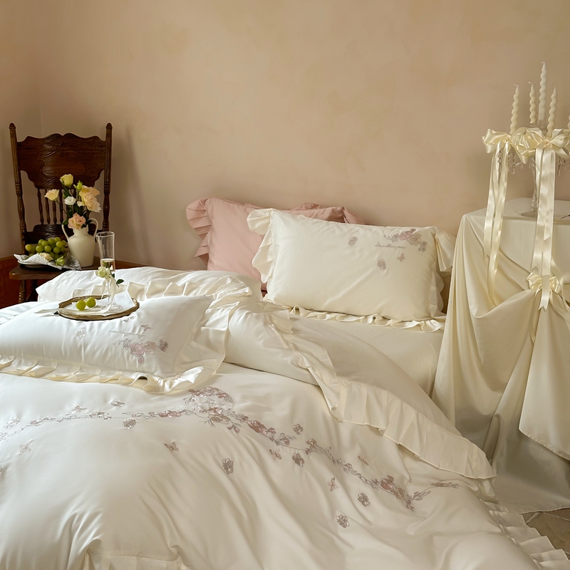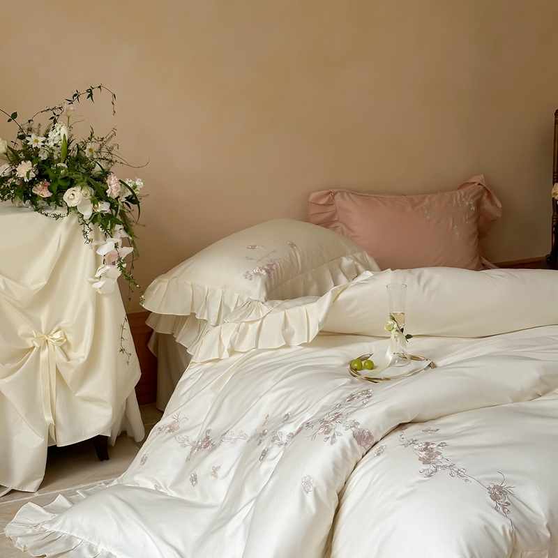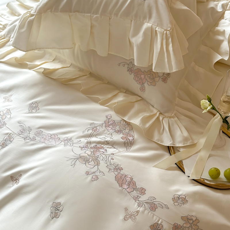 窝米 2025长绒荷叶边100支刺绣工艺款四件套(玫瑰园) 玫瑰园-奶白