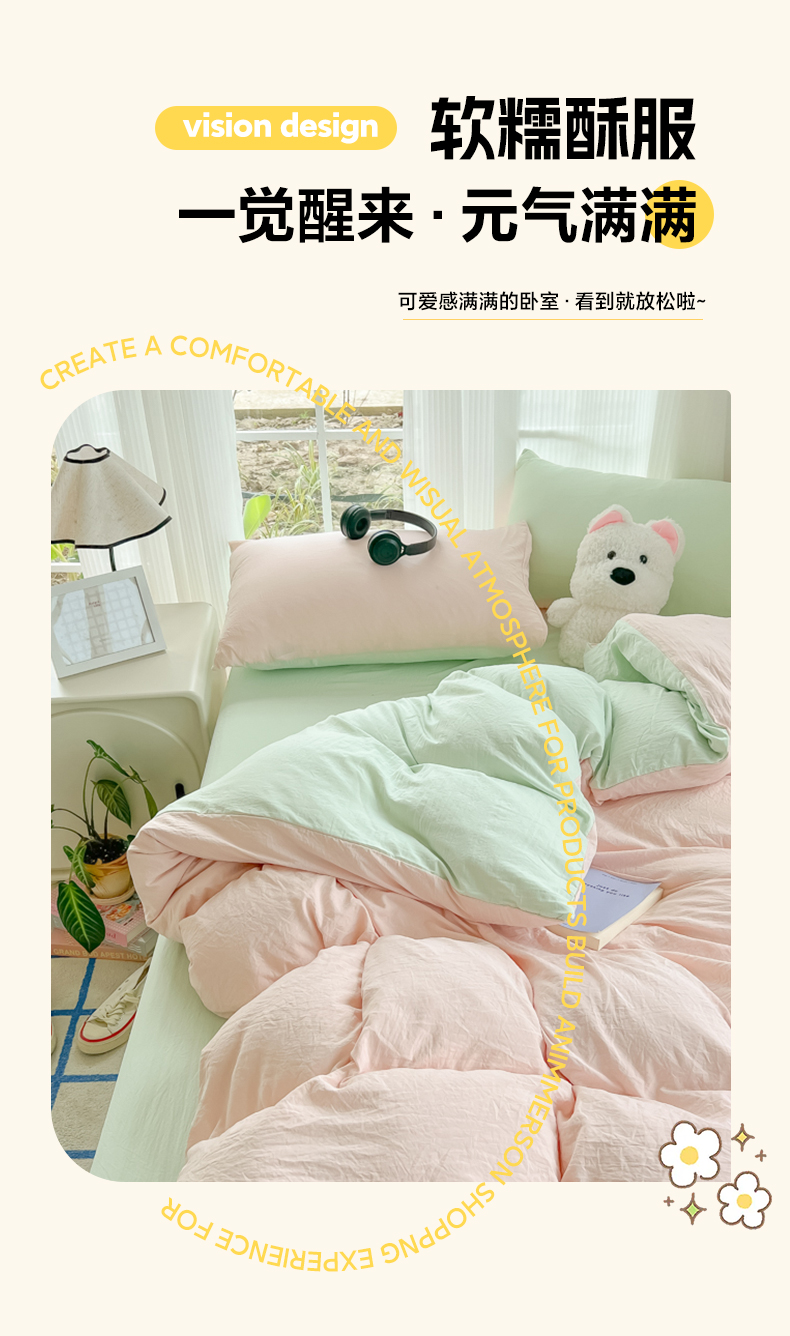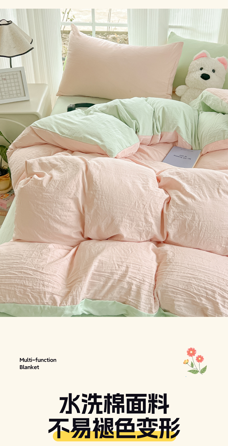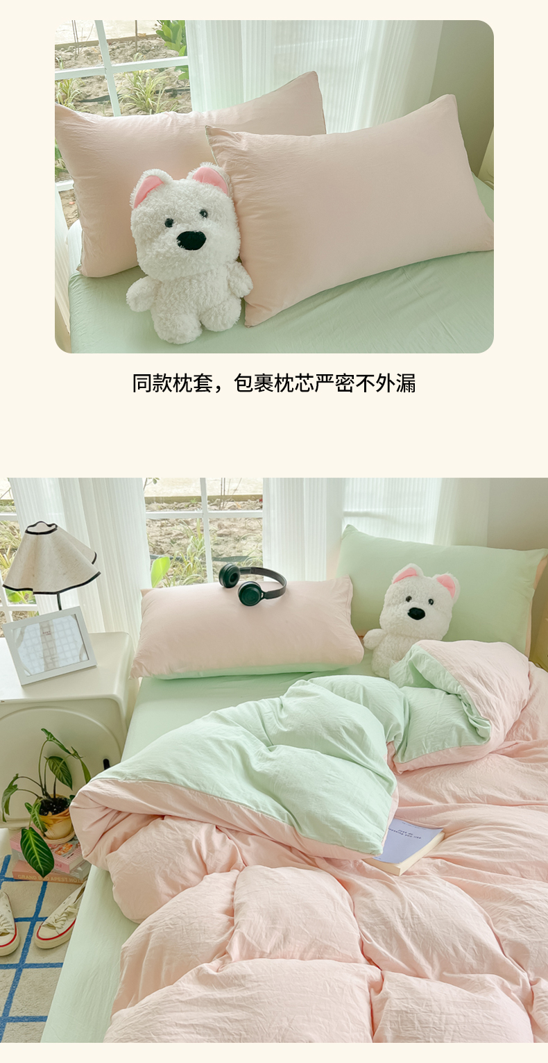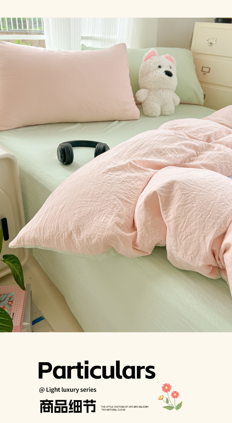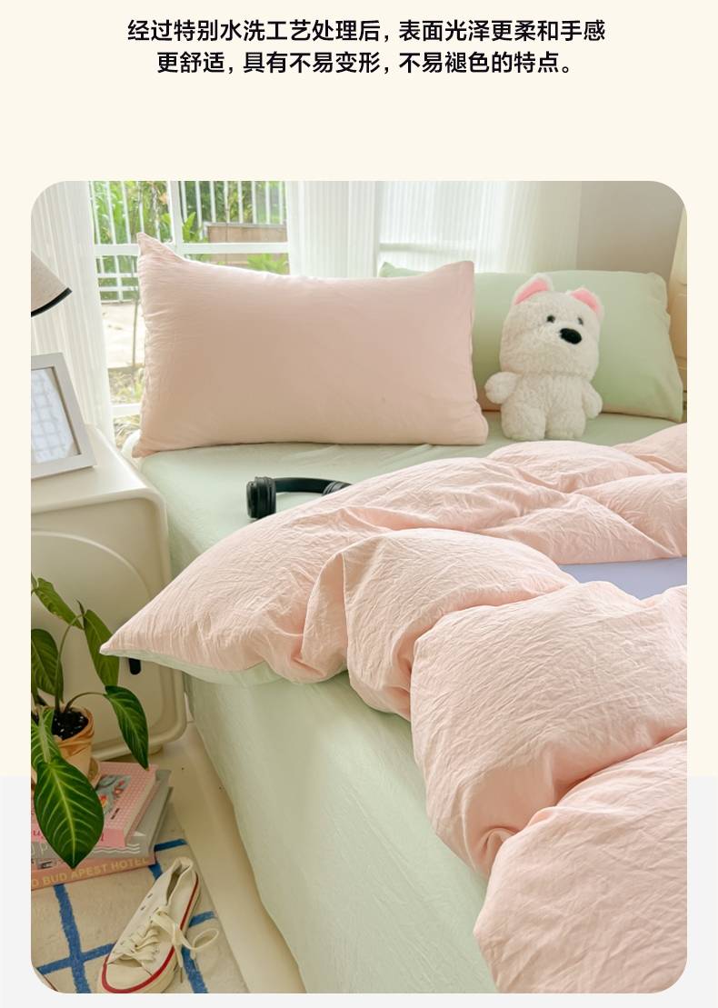 当前位置: 91家纺网 > 商品网购 > 床品套件 > 四件套 > 水洗棉四件套 > 韩巢家纺 2025新款ins风超柔水洗棉四件套-纯色双拼系列(提供卖家秀) 水洗棉浅粉绿