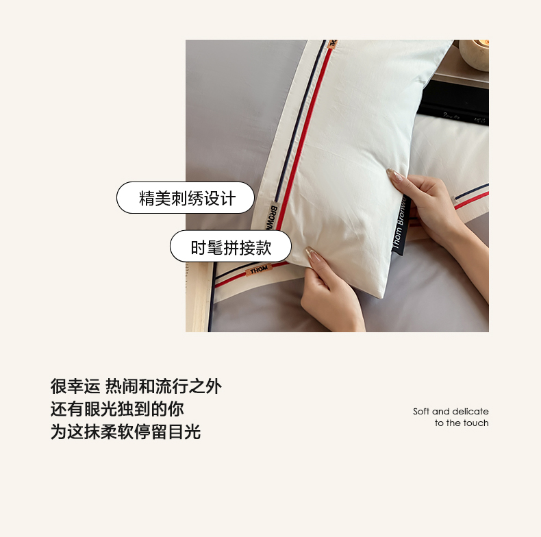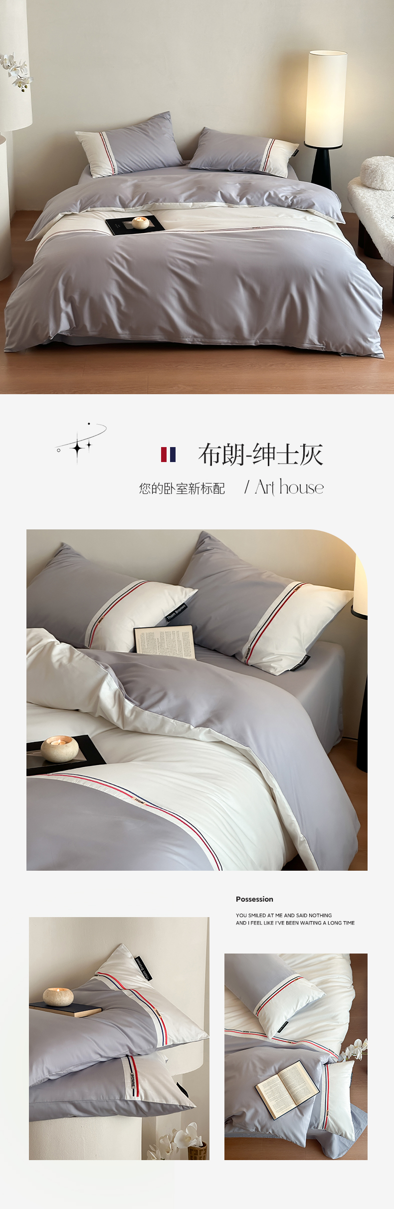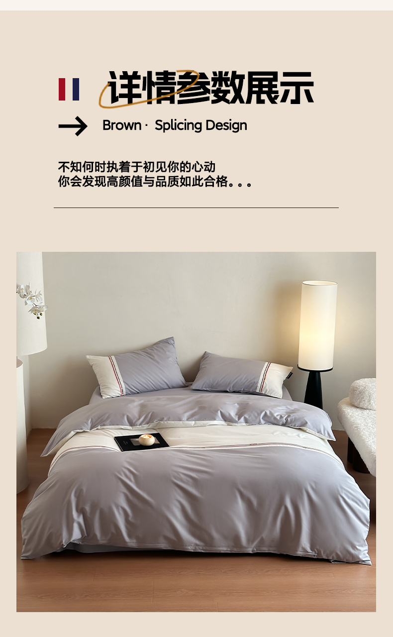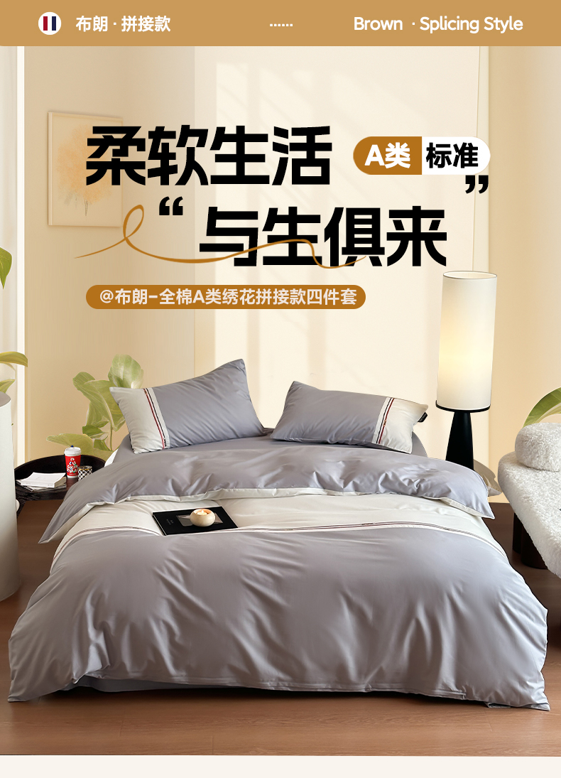 商品名称:卡巴伦家纺 2025新款全棉A类绣花拼接款四件套-布朗 布朗-绅士灰