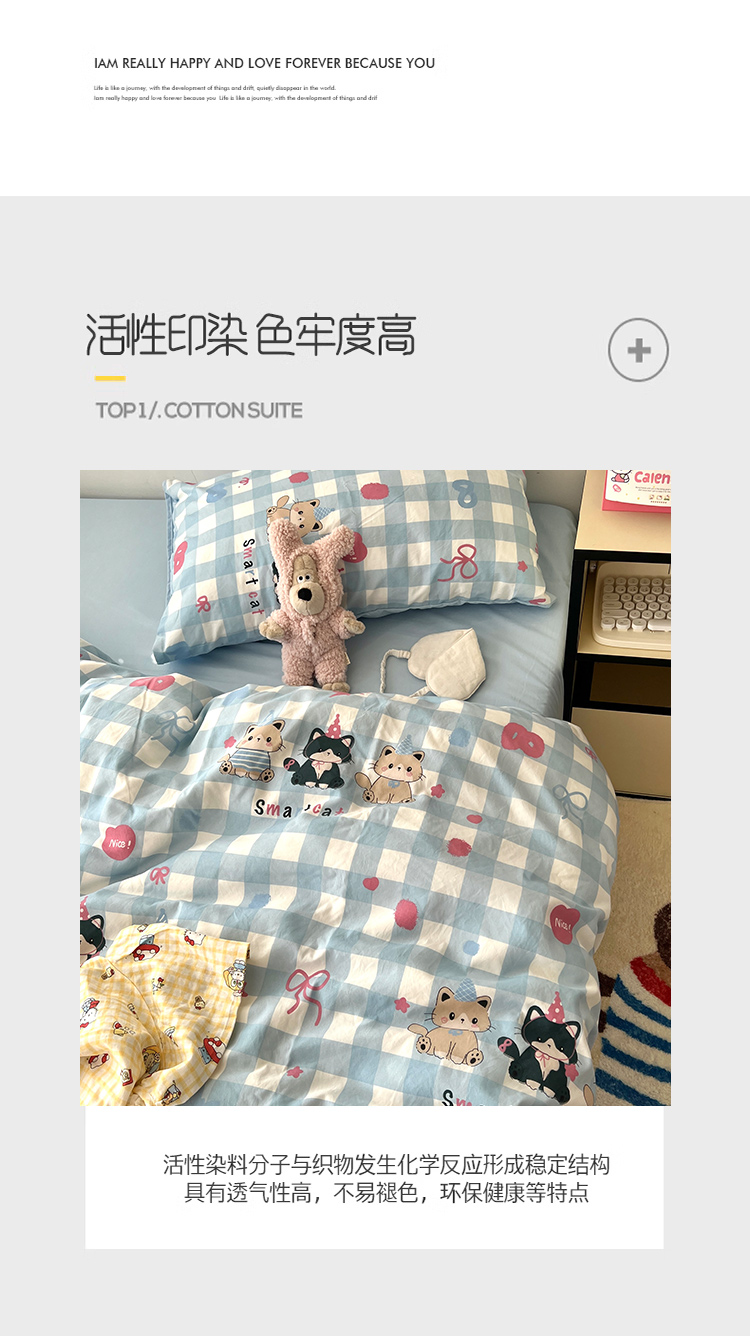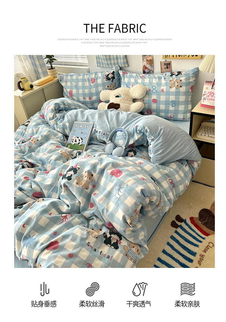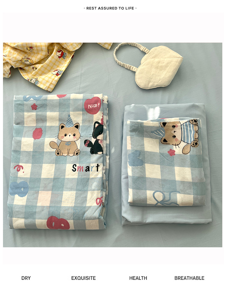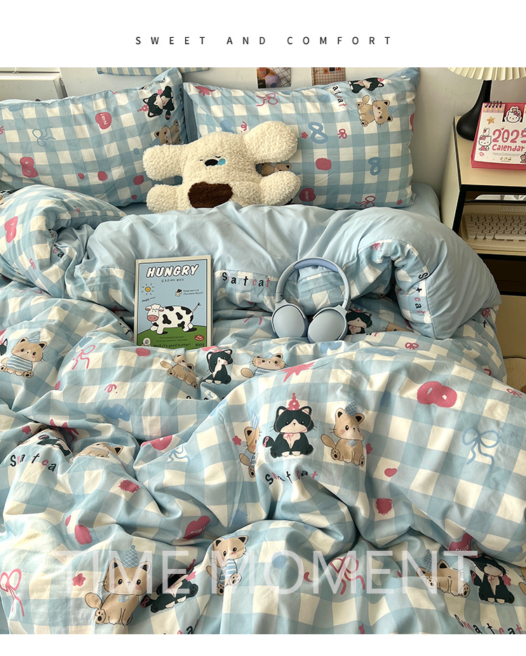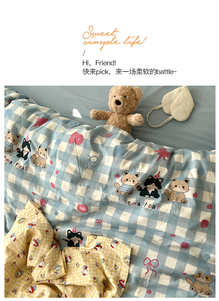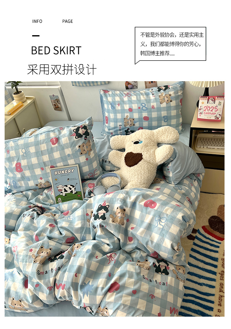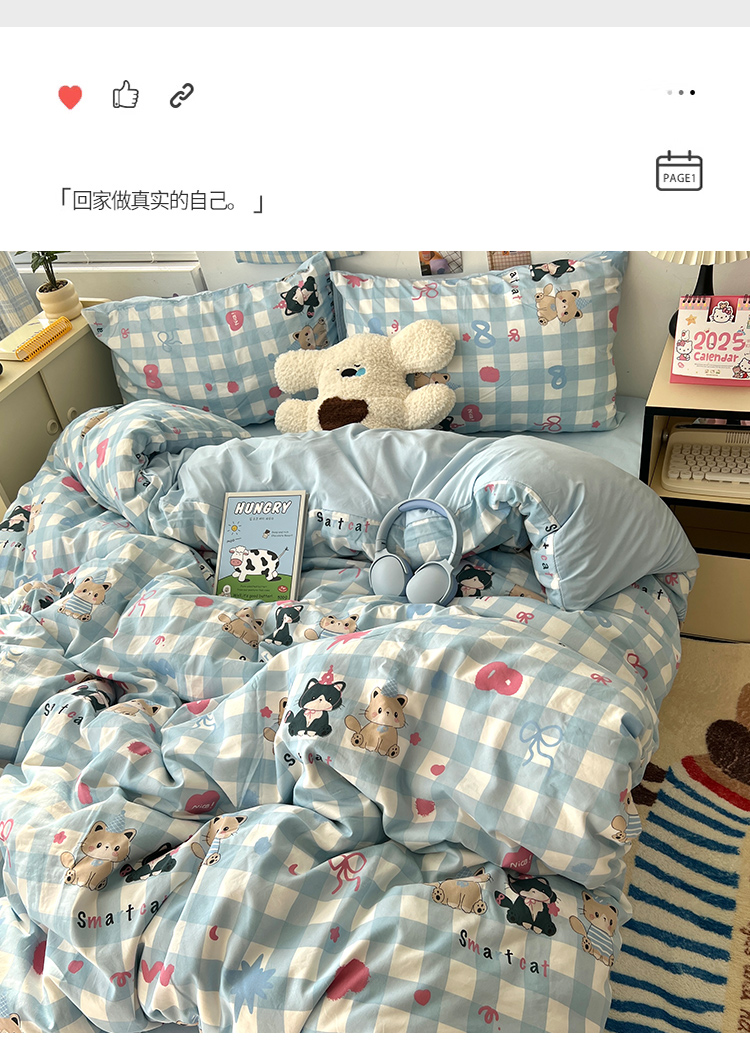 当前位置: 91家纺网 > 商品网购 > 床品套件 > 四件套 > 其它四件套 > 原素 2025软绵绵的双拼印花水洗棉四件套 蓝格萌萌猫