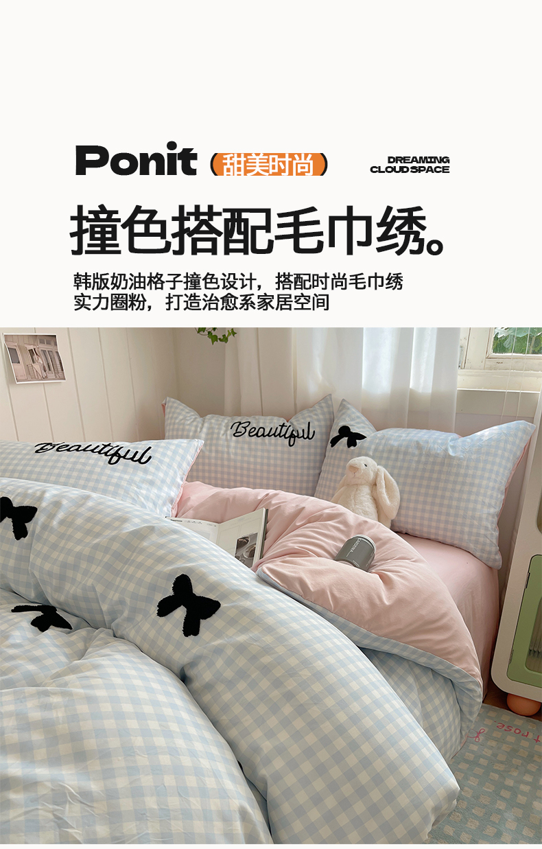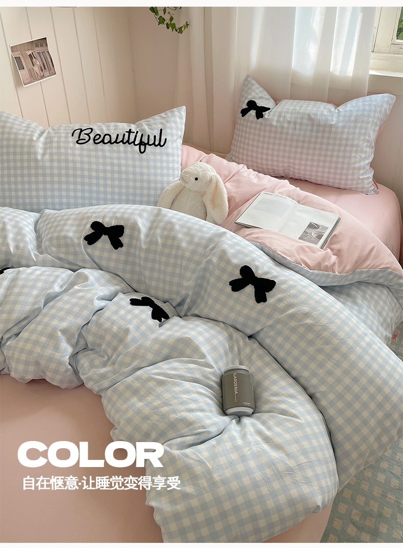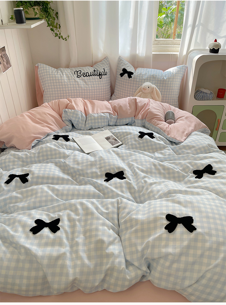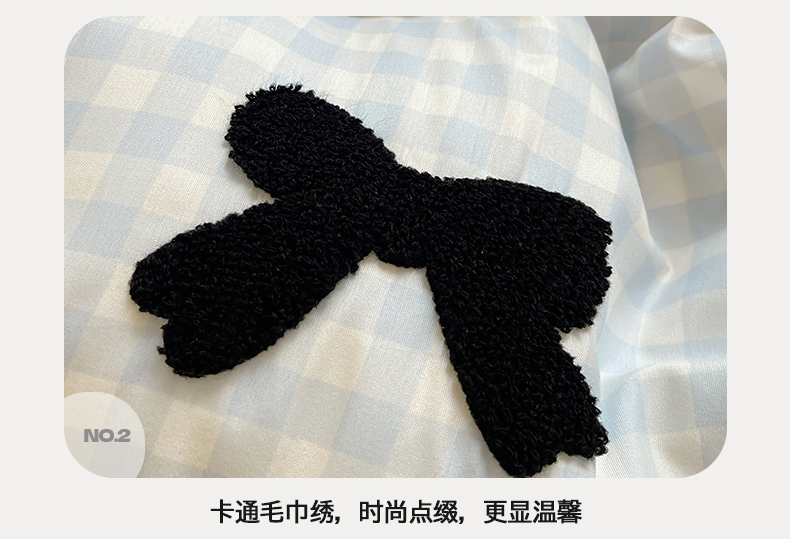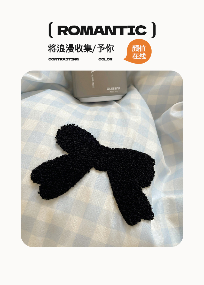 当前位置: 91家纺网 > 商品网购 > 床品套件 > 四件套 > 水洗棉四件套 > 桃心家居 2025新款A类亲肤舒适软糯云柔水洗棉奶油格子撞色毛巾绣猫咪蝴蝶结水洗棉系列四件套 云柔水洗棉-少女蝴蝶结蓝黑
