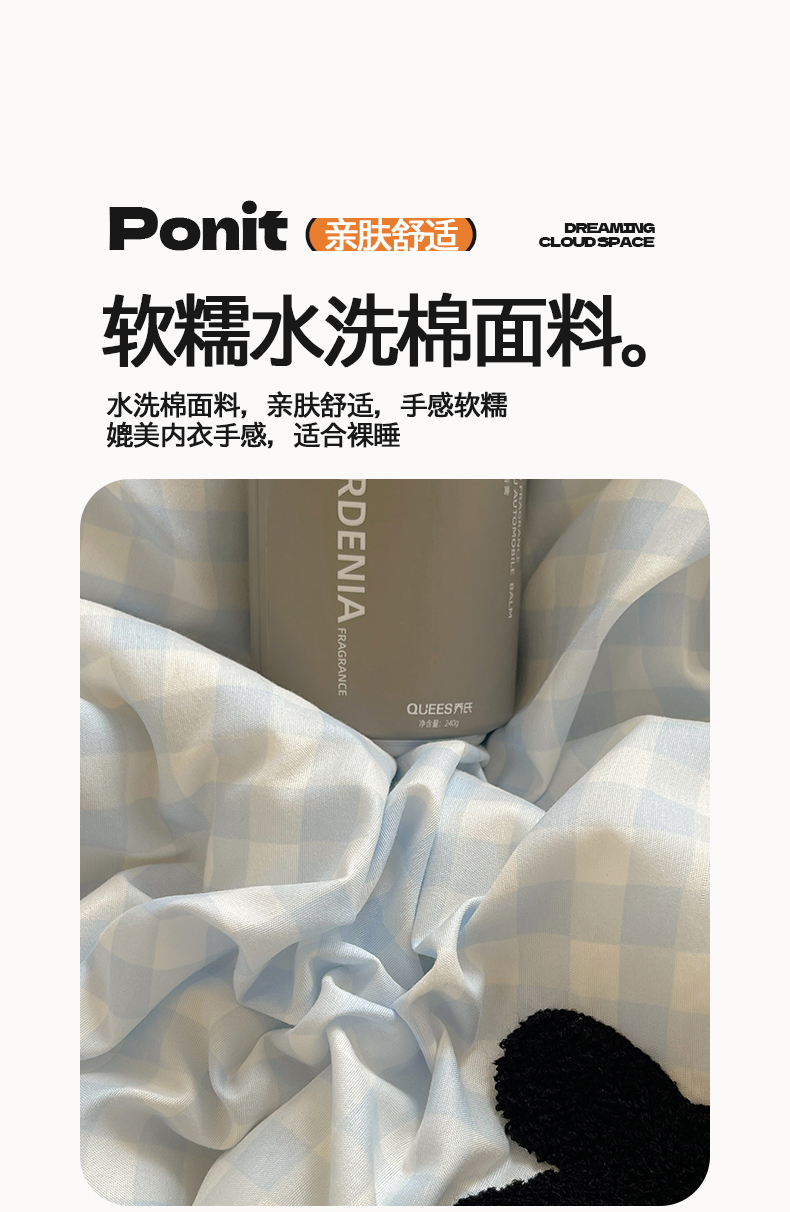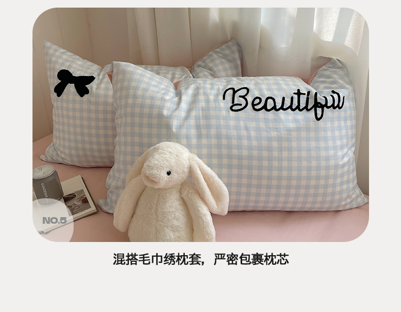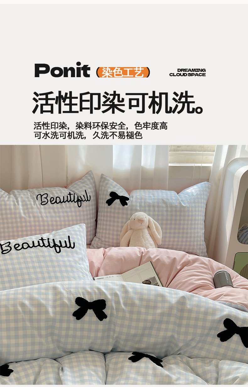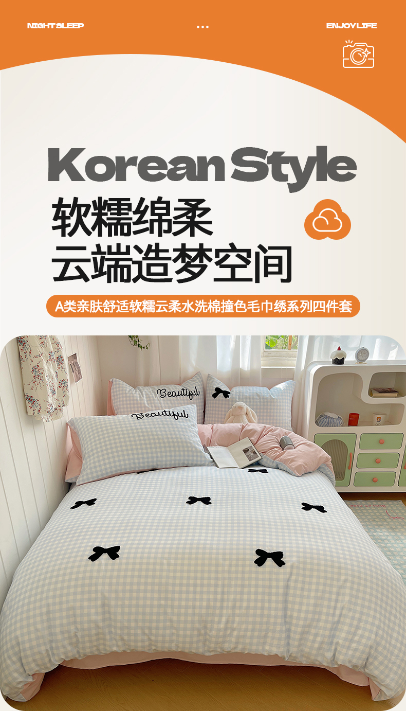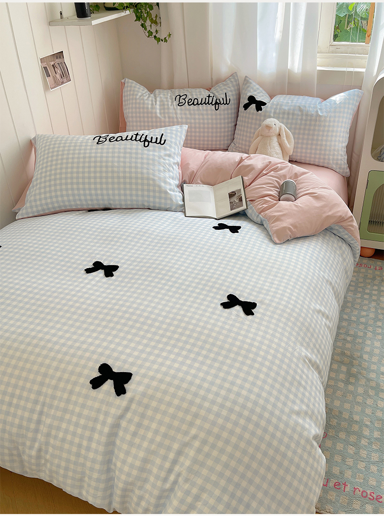 当前位置: 91家纺网 > 商品网购 > 床品套件 > 四件套 > 水洗棉四件套 > 桃心家居 2025新款A类亲肤舒适软糯云柔水洗棉奶油格子撞色毛巾绣猫咪蝴蝶结水洗棉系列四件套 云柔水洗棉-少女蝴蝶结蓝黑