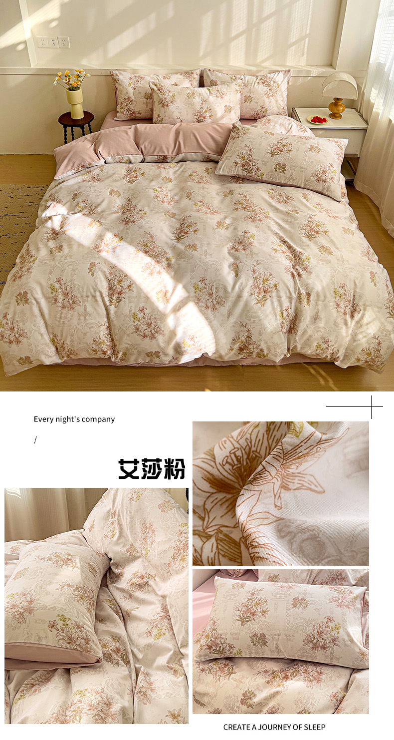 商品名称:庭彤 2025春夏新款莱赛尔天丝印花三件套四件套 艾莎粉