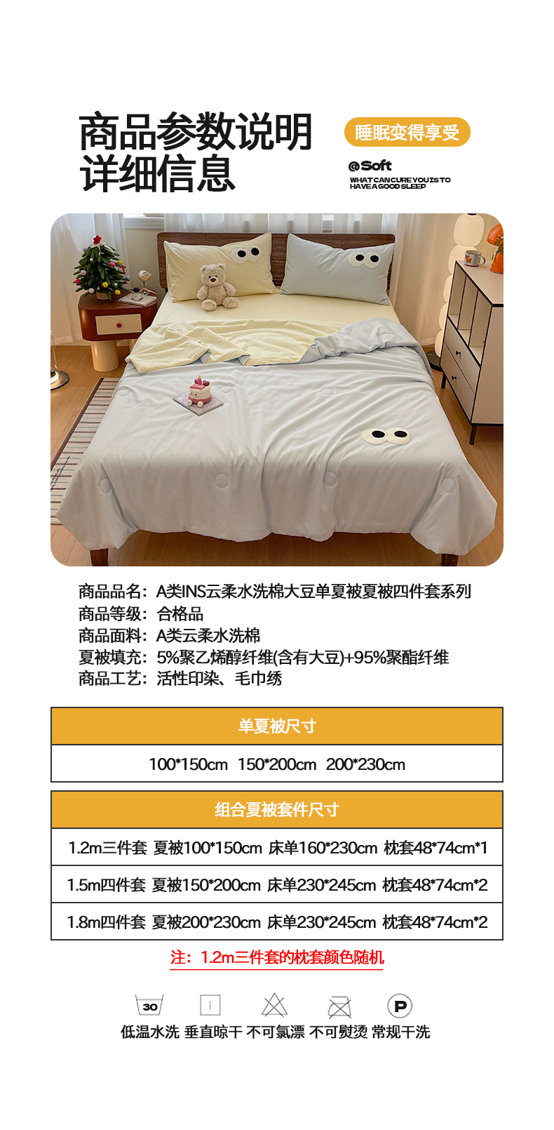 • 91家纺网 家纺一手货源 找家纺 桃心家居 2025新款云柔水洗棉毛巾绣大豆单夏被夏被四件套 水洗棉-大眼睛夏被海盐奶黄