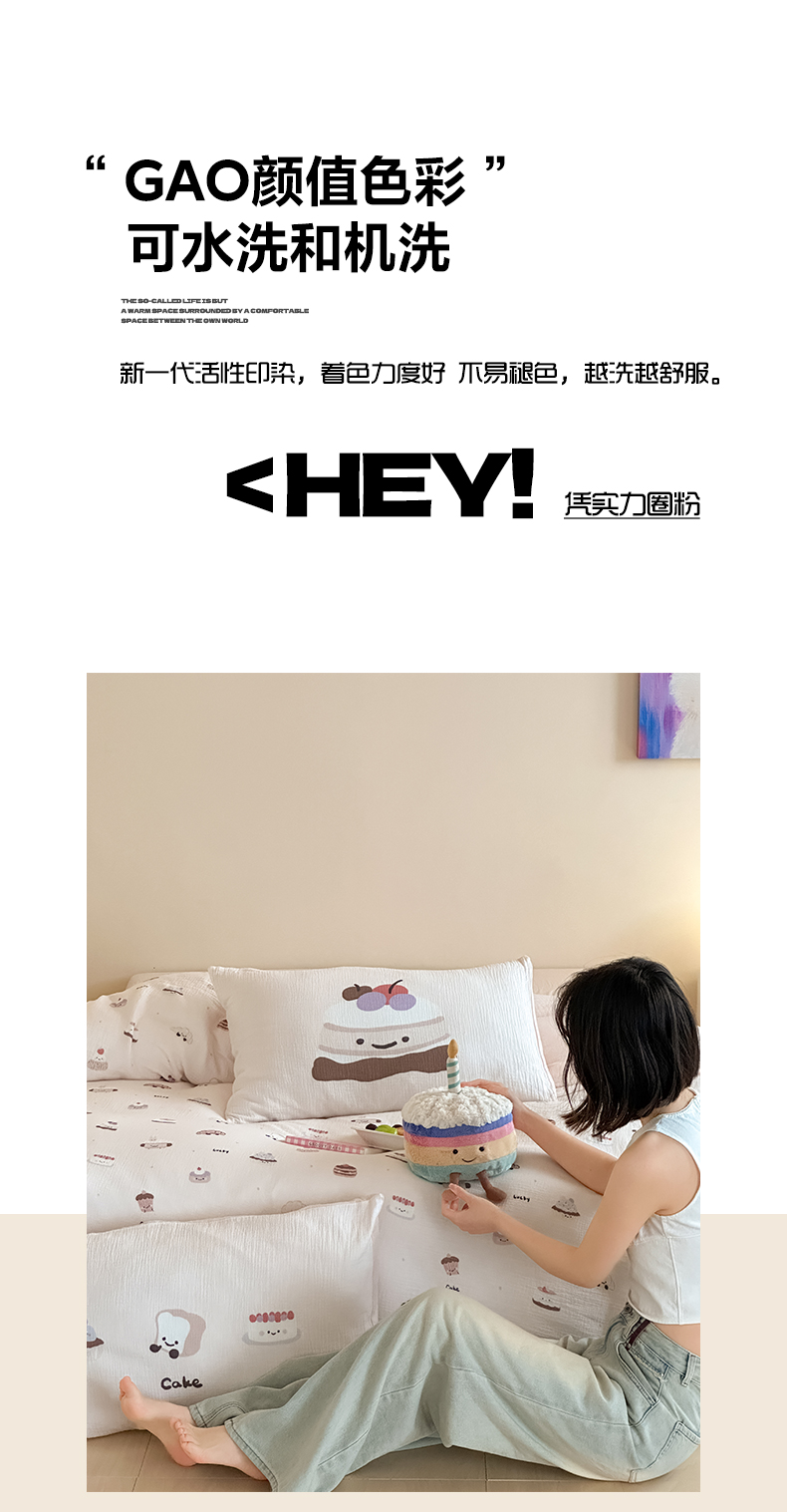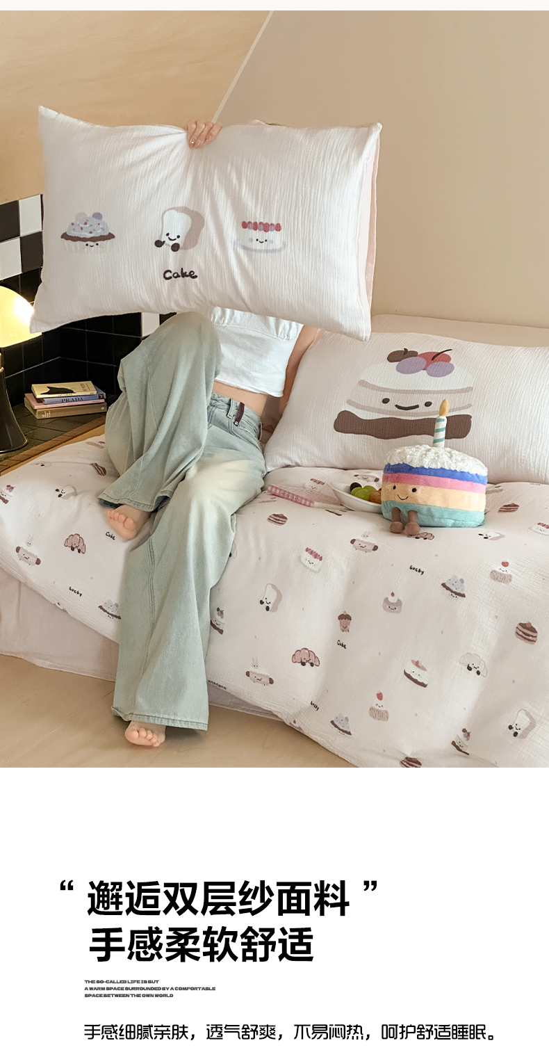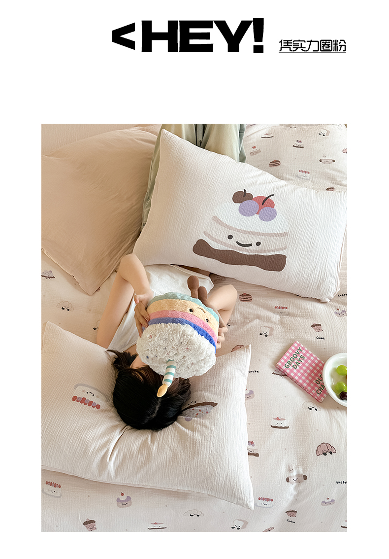 商品名称:卡巴伦家纺 2025新款全棉皱皱纱大版卡通数码印花款四件套二 生日万岁-粉