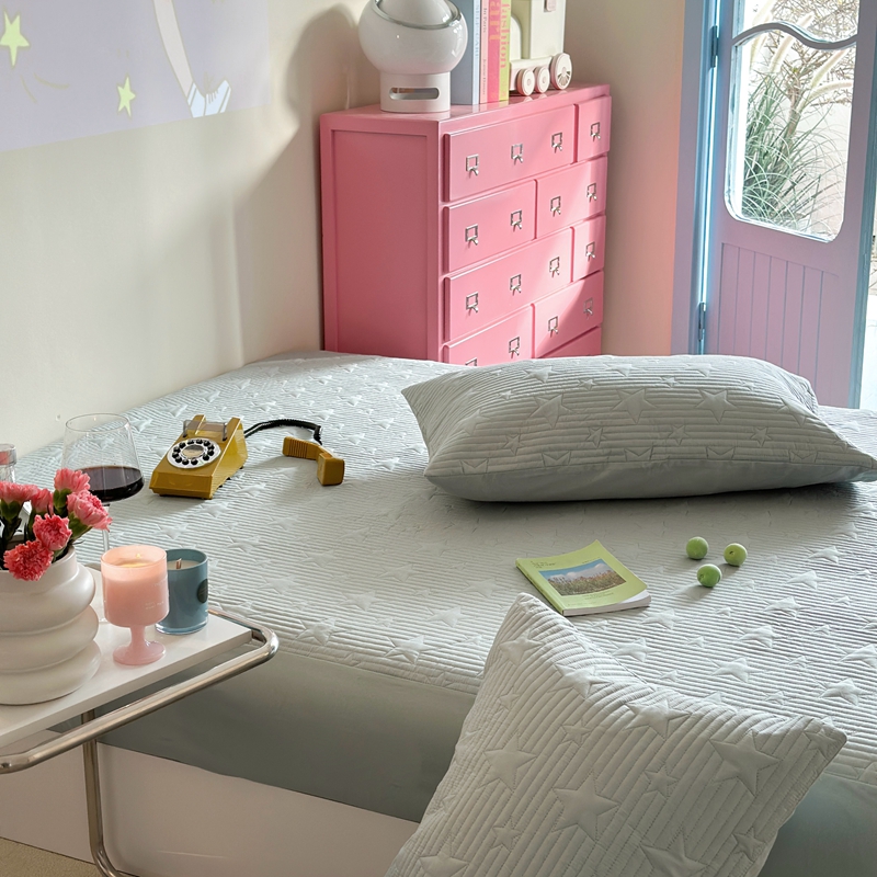 (总)漫调家纺 2025新款繁星绗缝夏被 复古风实拍,繁星白,繁星粉,繁星灰,繁星咖,繁星绿,繁星杏