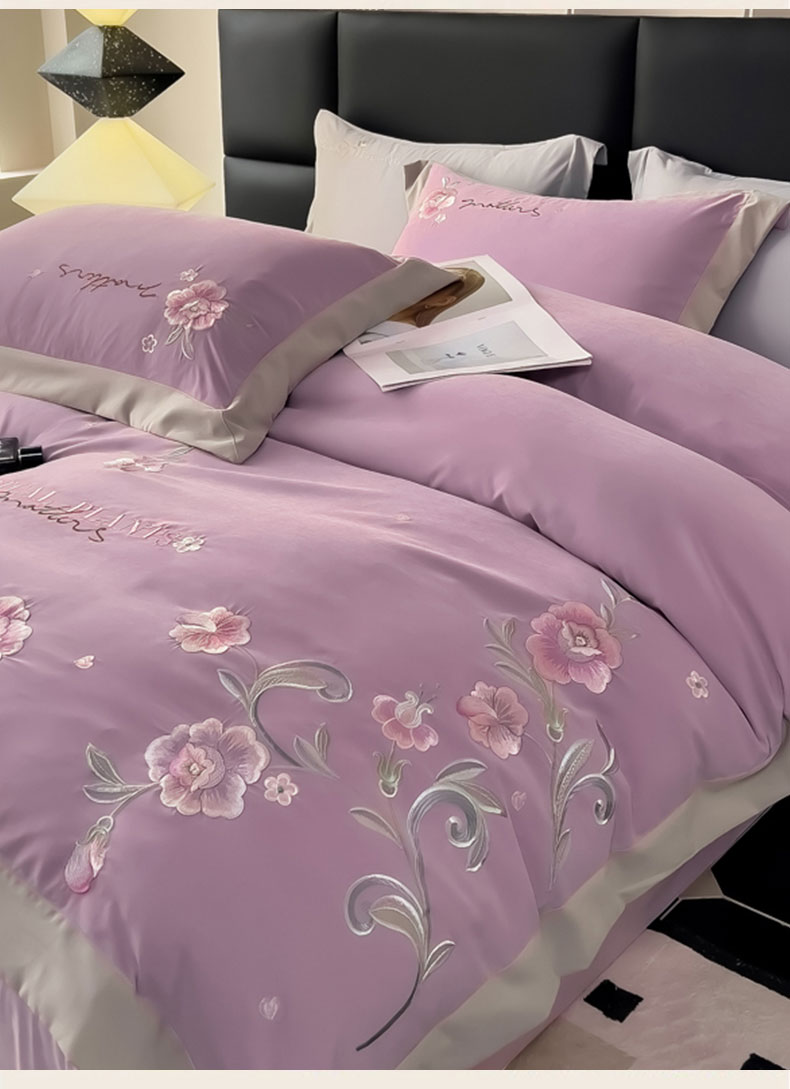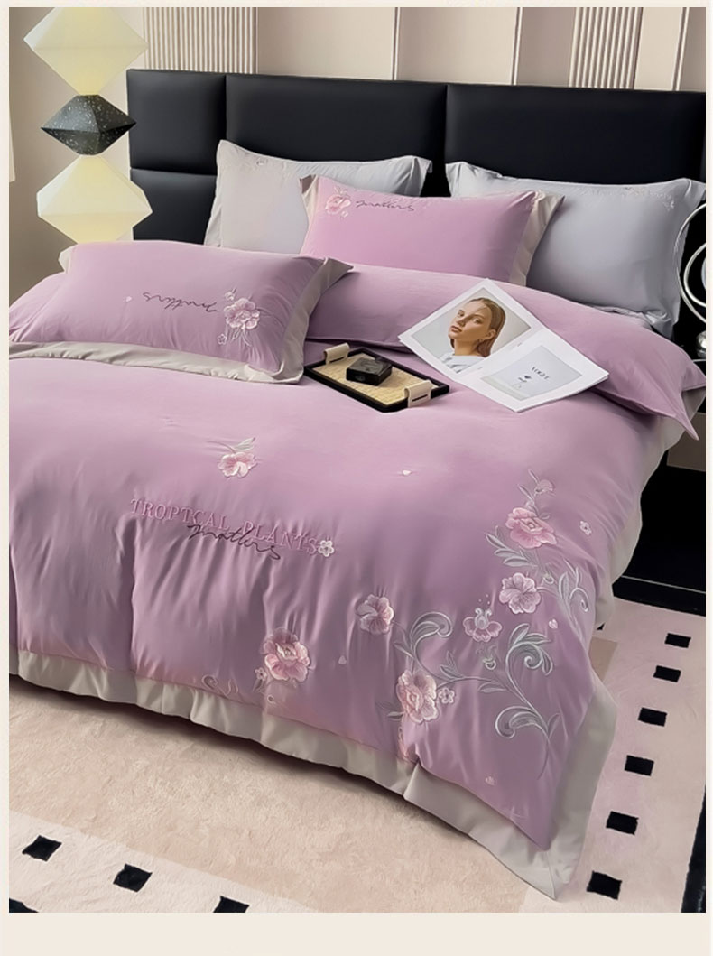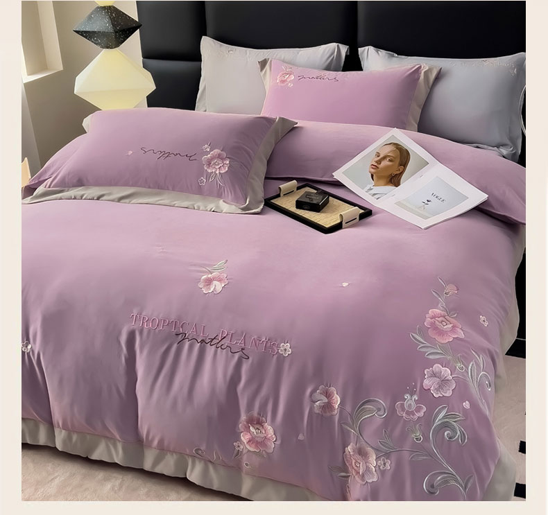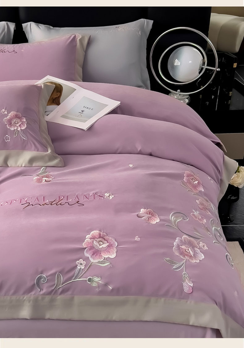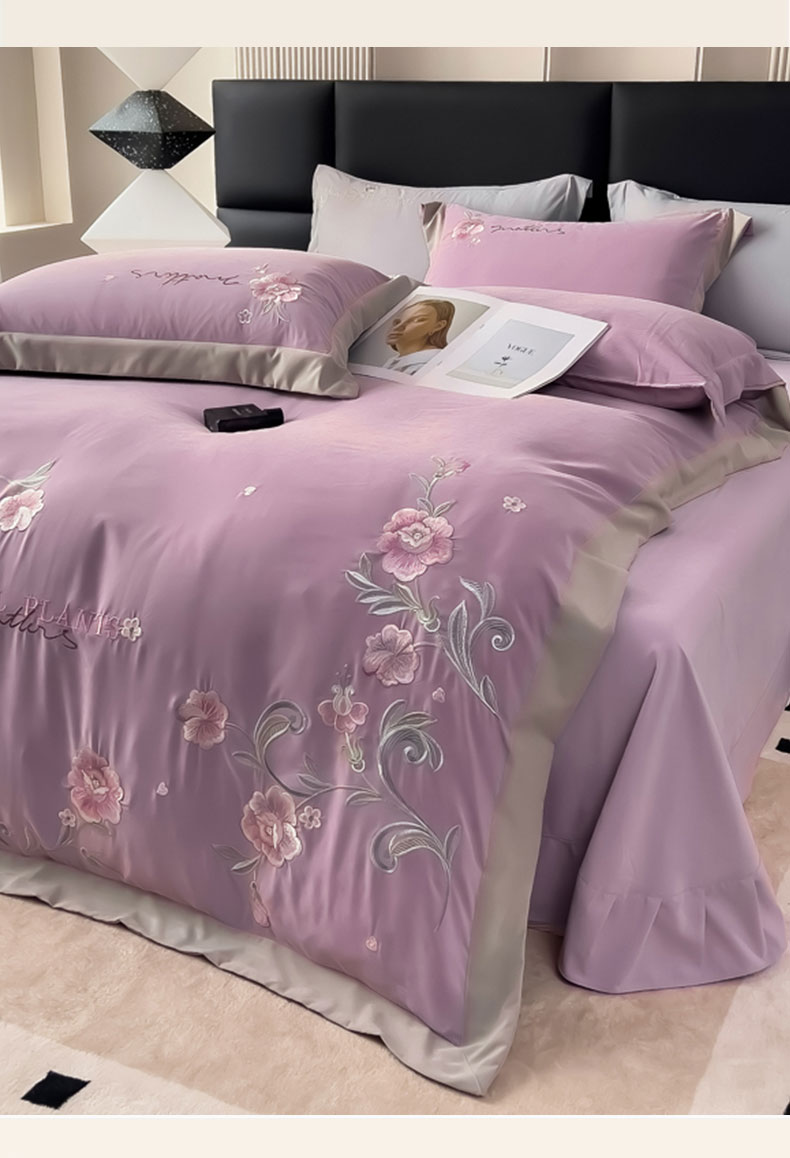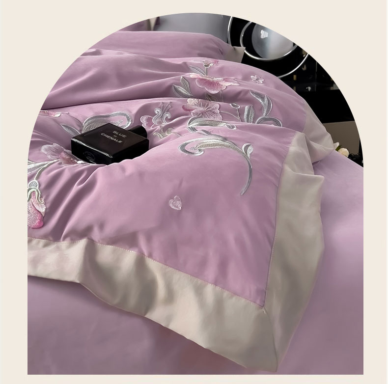 曲之慕 2025新品四季款高端刺绣四件套简约可水洗轻奢纯色刺绣四件套 馨花漫舞烟紫