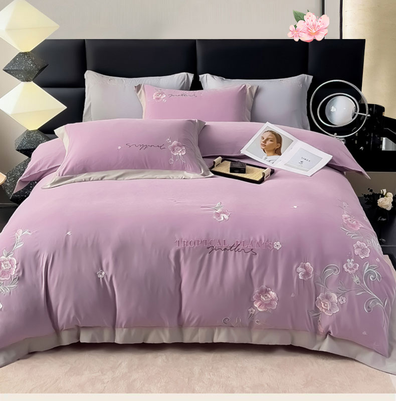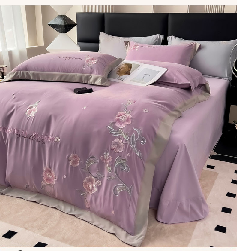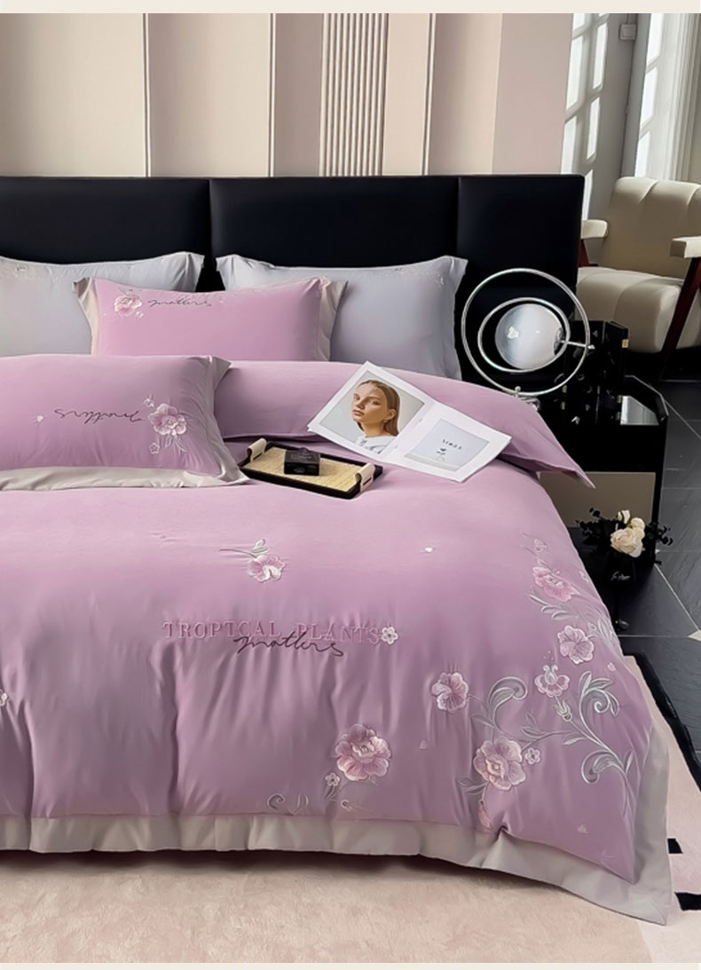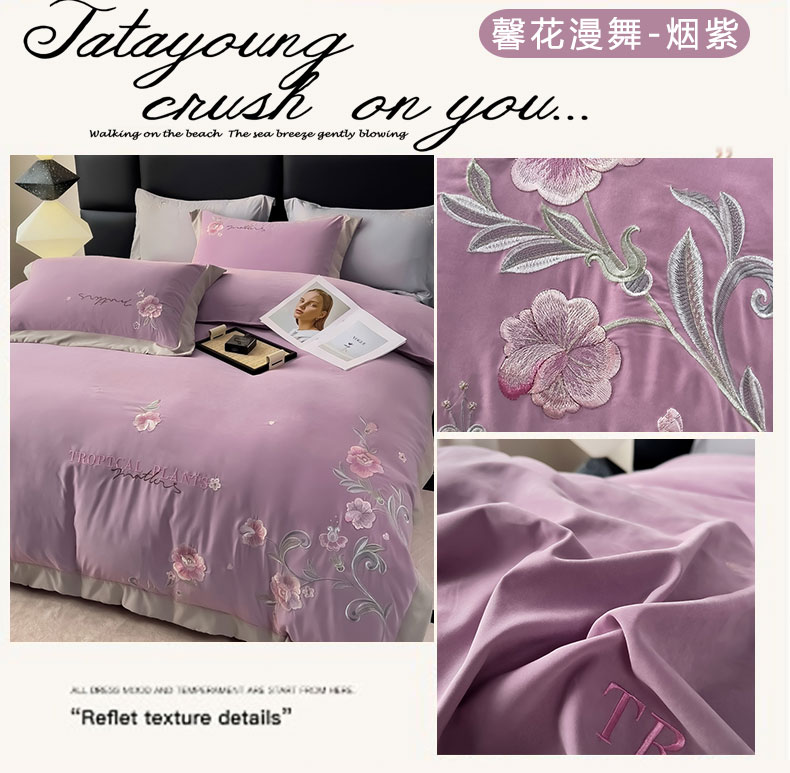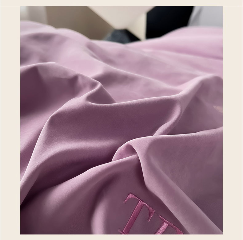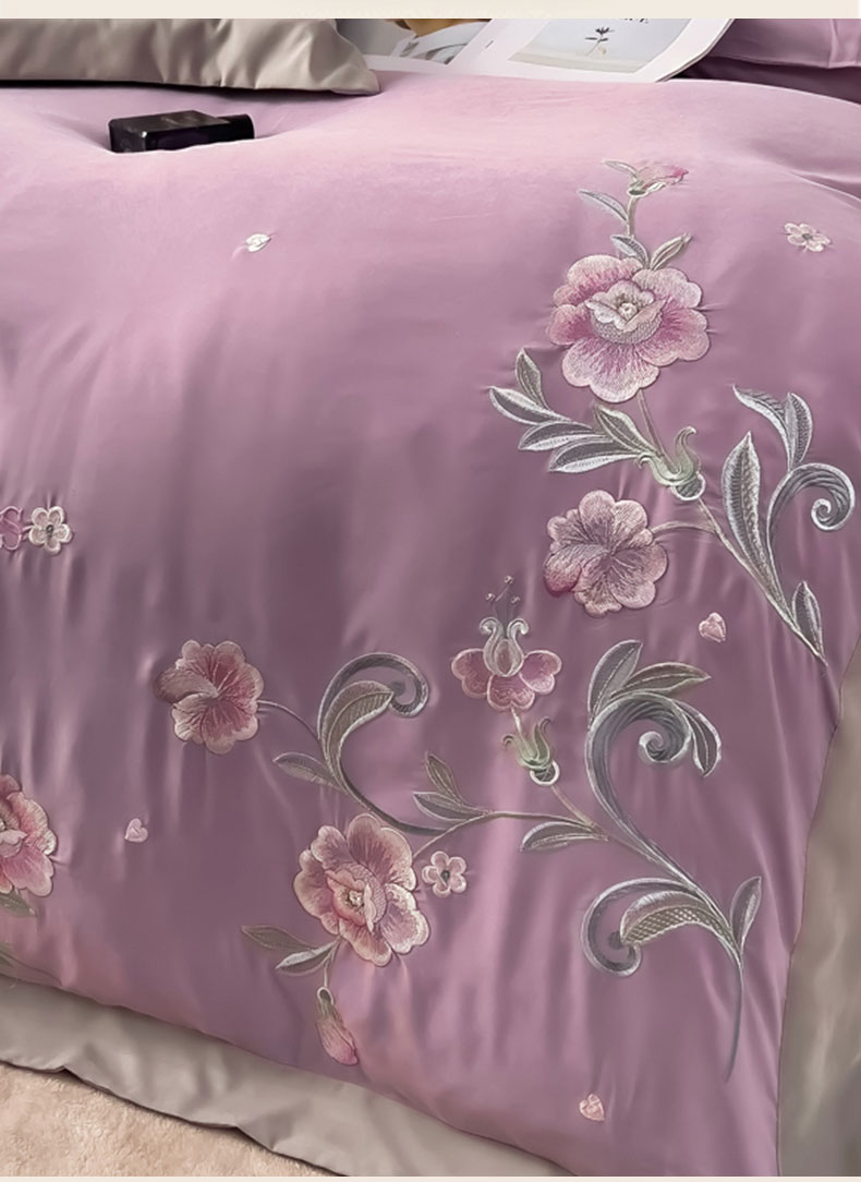 曲之慕 2025新品四季款高端刺绣四件套简约可水洗轻奢纯色刺绣四件套 馨花漫舞烟紫
