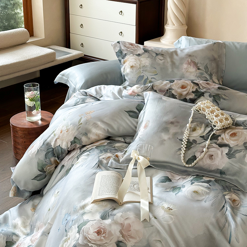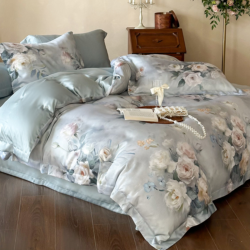 (总)2025春夏新品数码印花60兰精天丝宽边工艺款四件套,奥菲娜-粉,奥菲娜-灰,莫丽花园-灰,楠风-咖,倾城-豆沙,倾城-灰,莫丽花园-紫