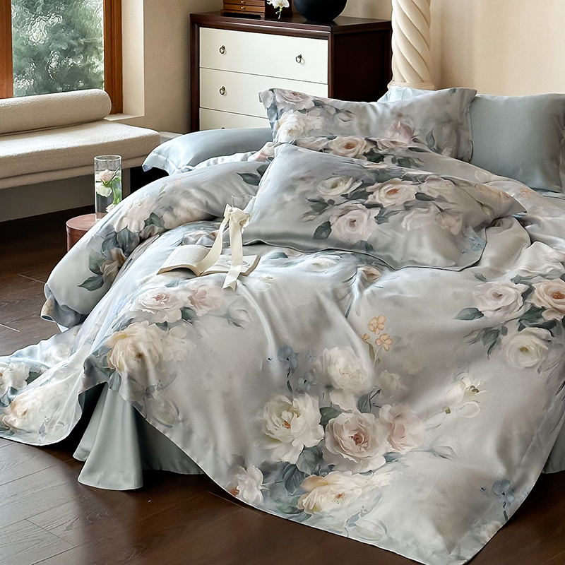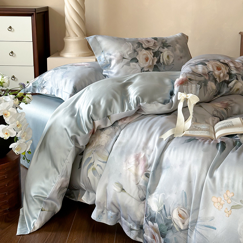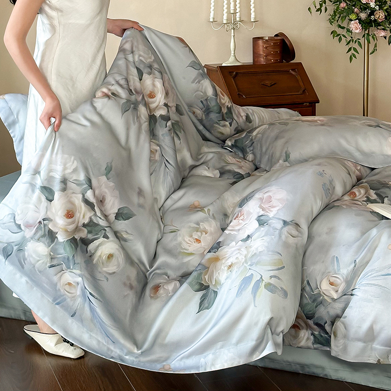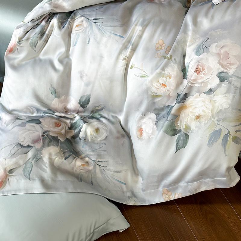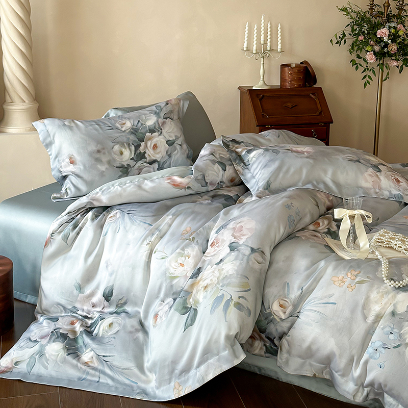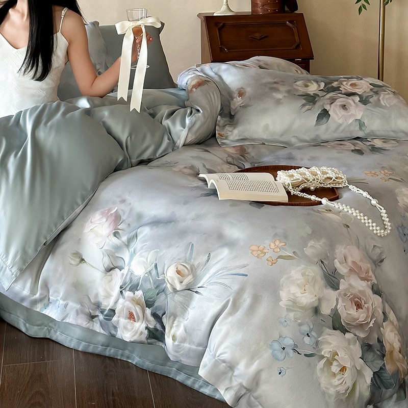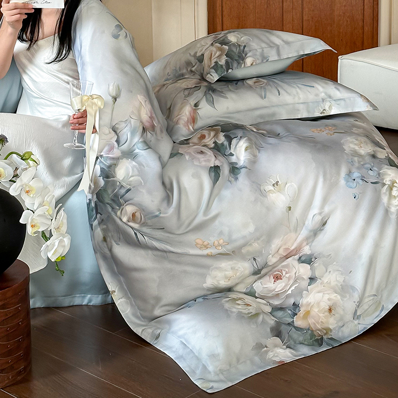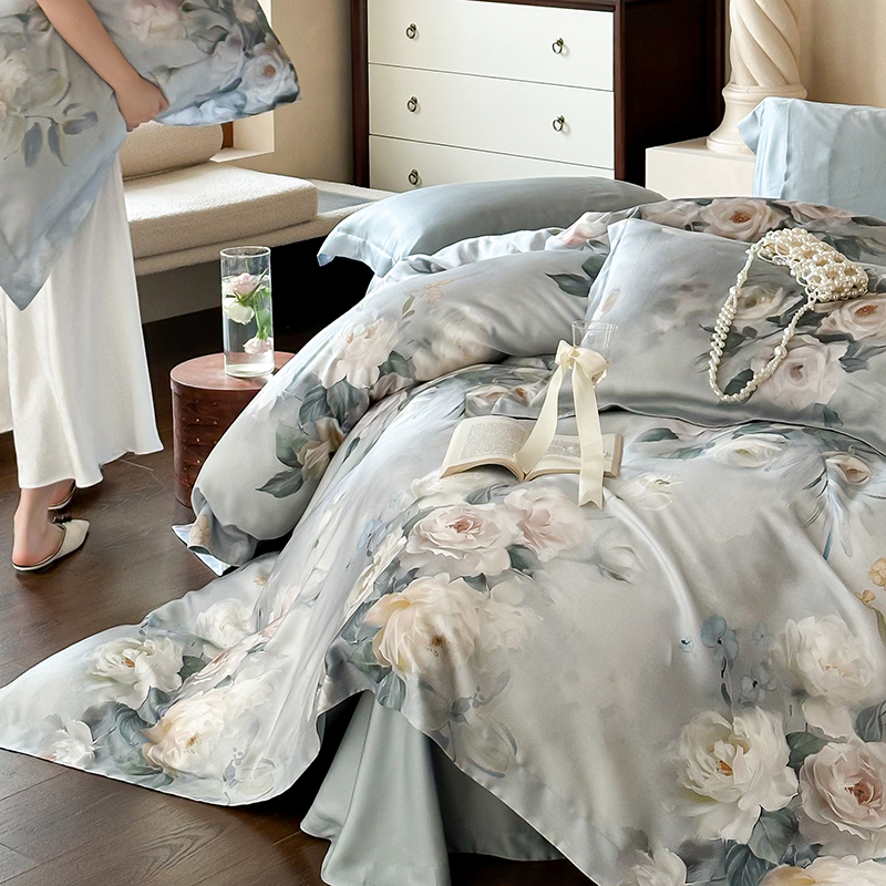 商品名称:2025春夏新品数码印花60兰精天丝宽边工艺款四件套 倾城-灰