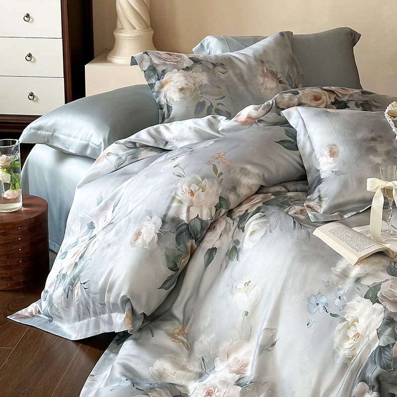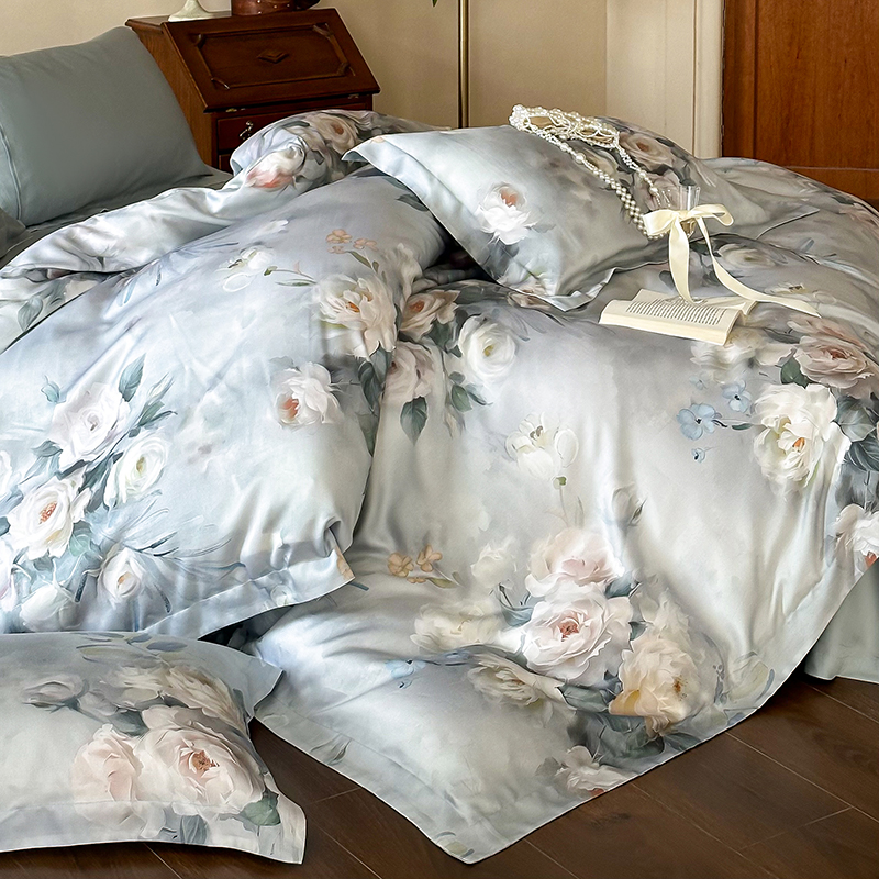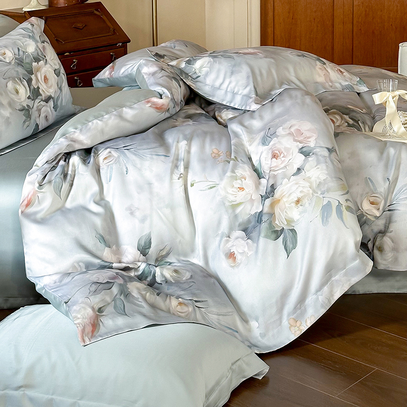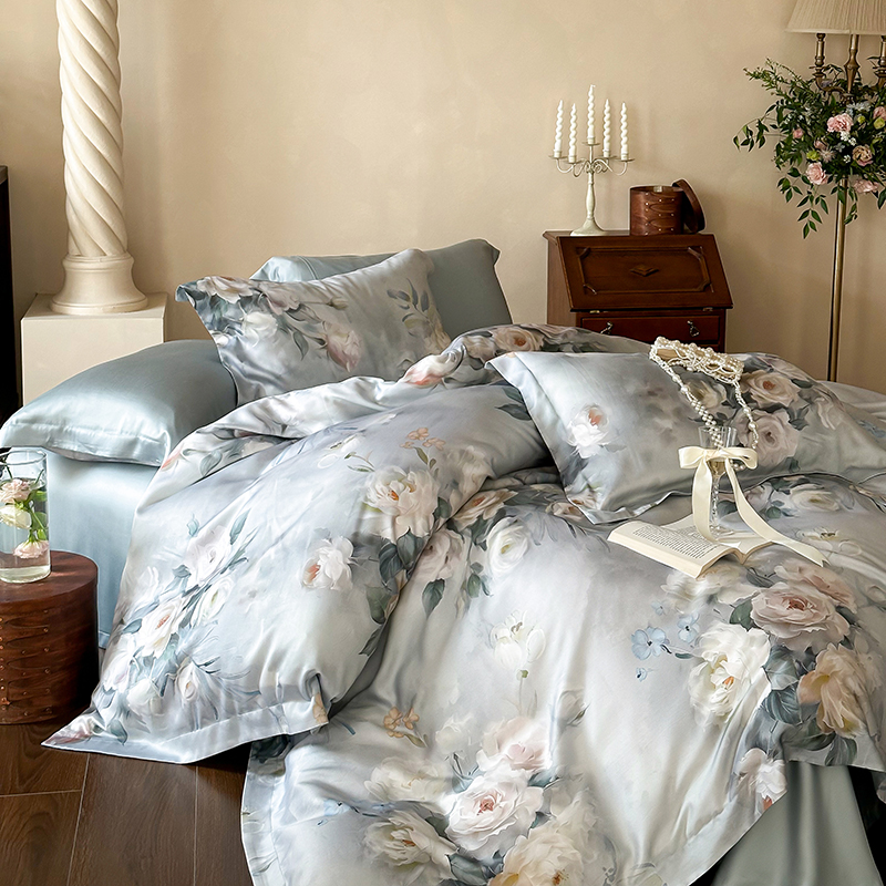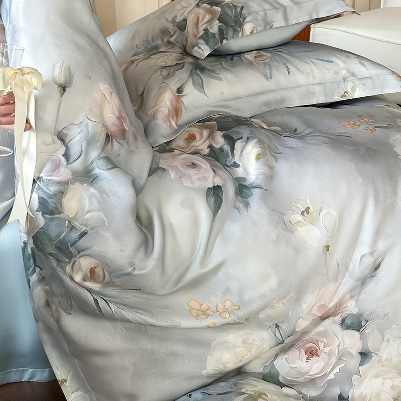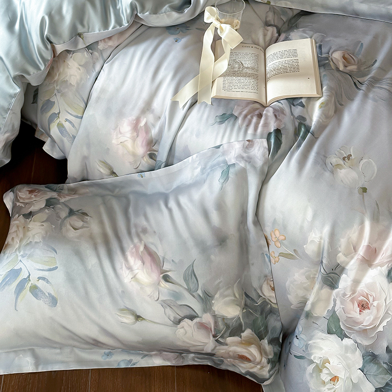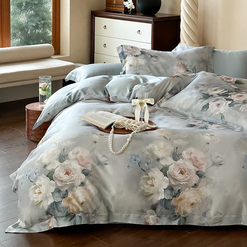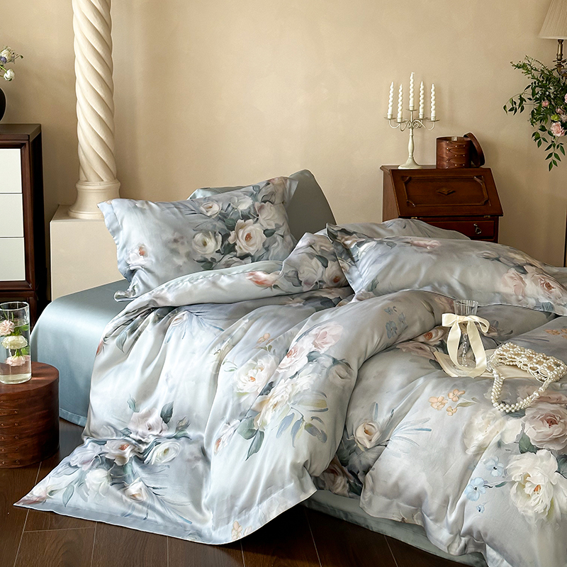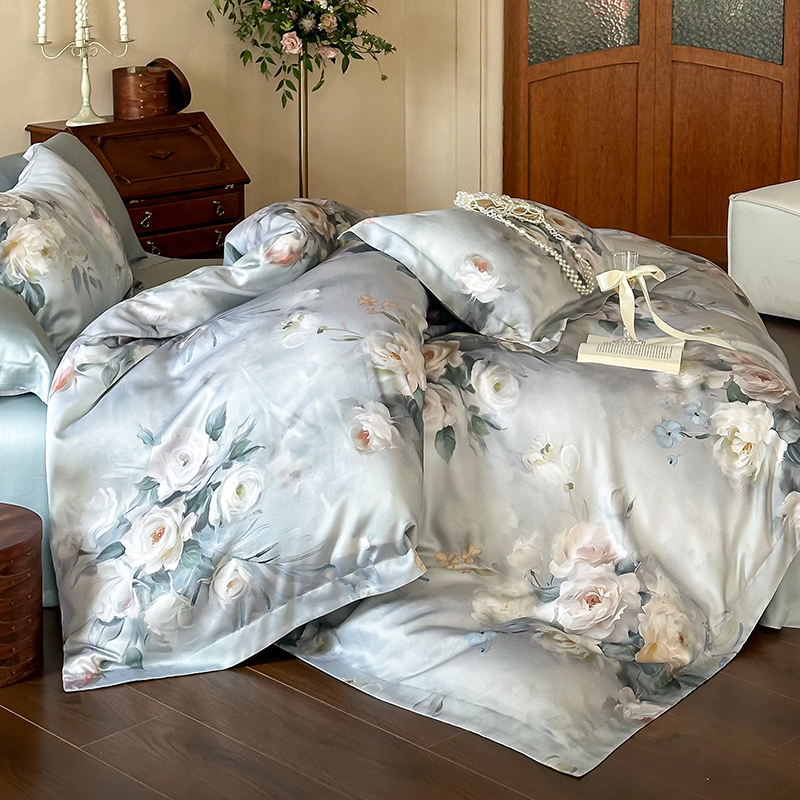 商品名称:2025春夏新品数码印花60兰精天丝宽边工艺款四件套 倾城-灰