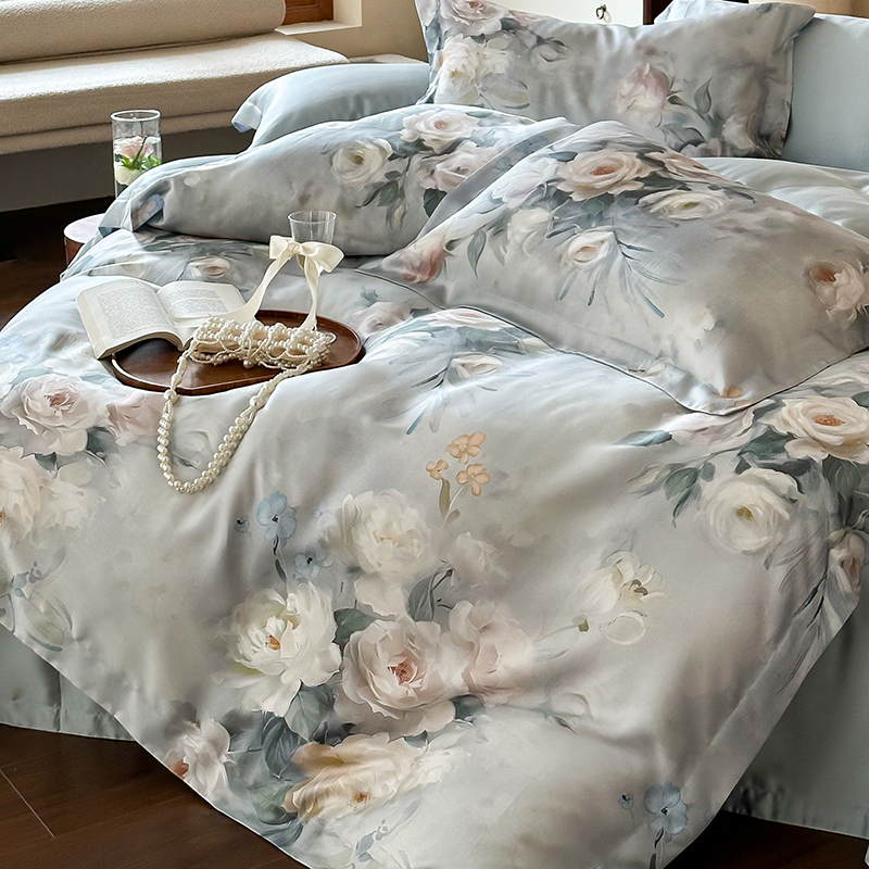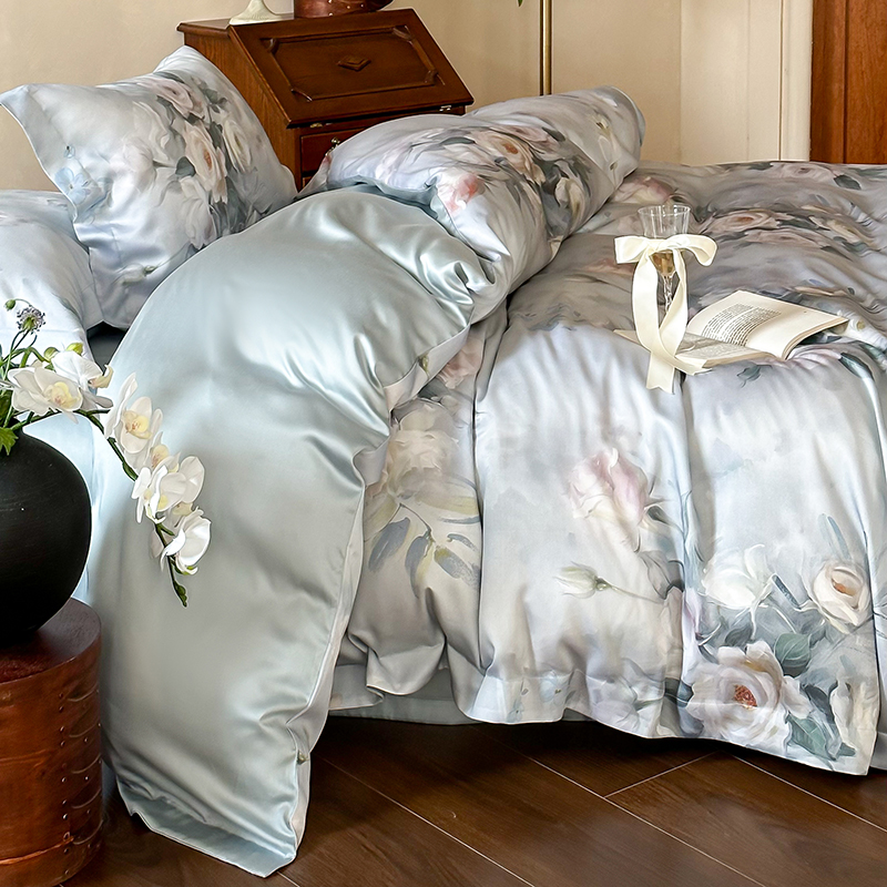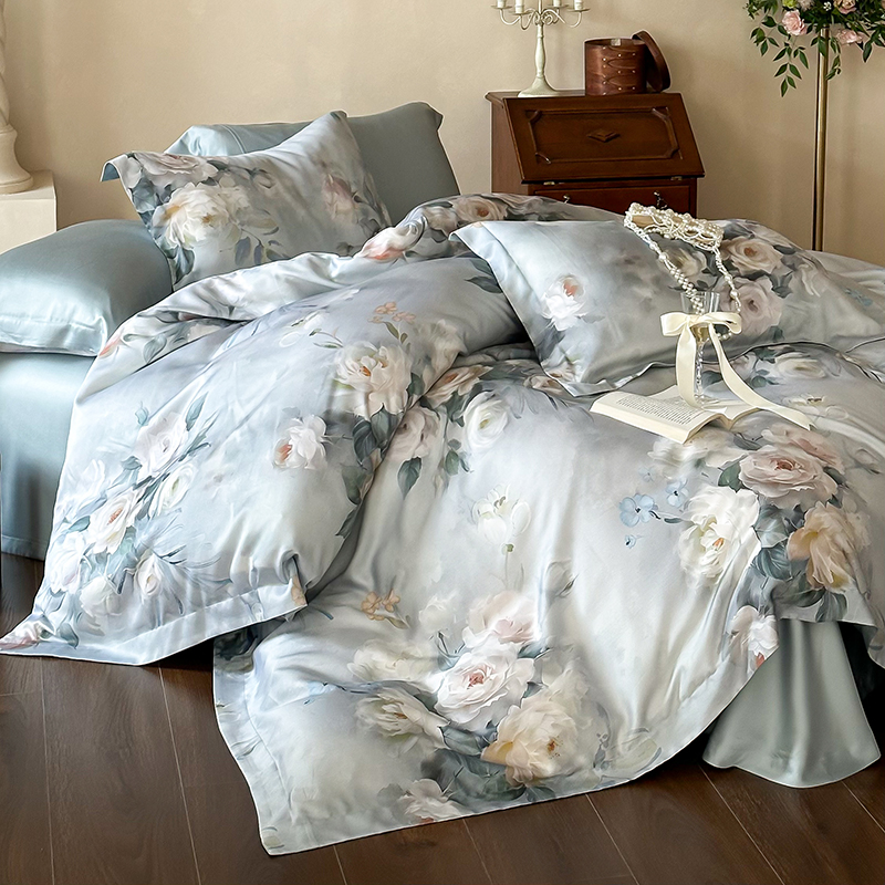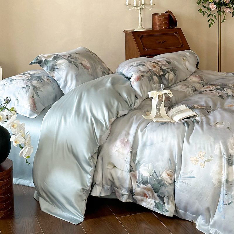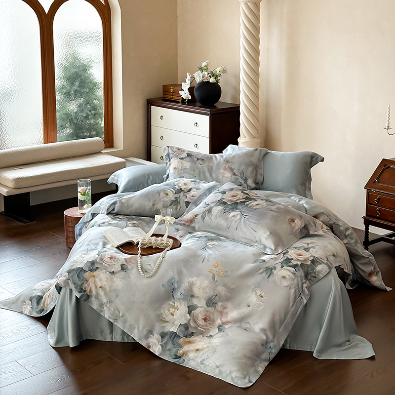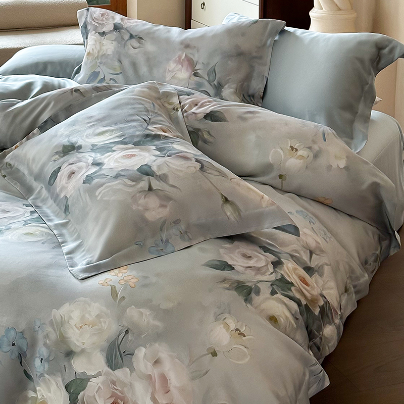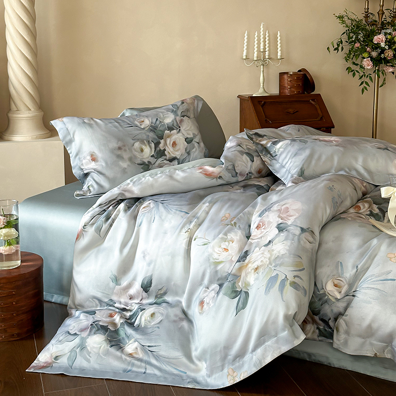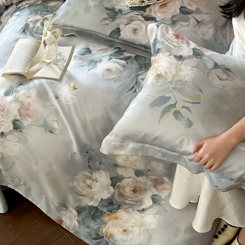商品名称:2025春夏新品数码印花60兰精天丝宽边工艺款四件套 倾城-灰
