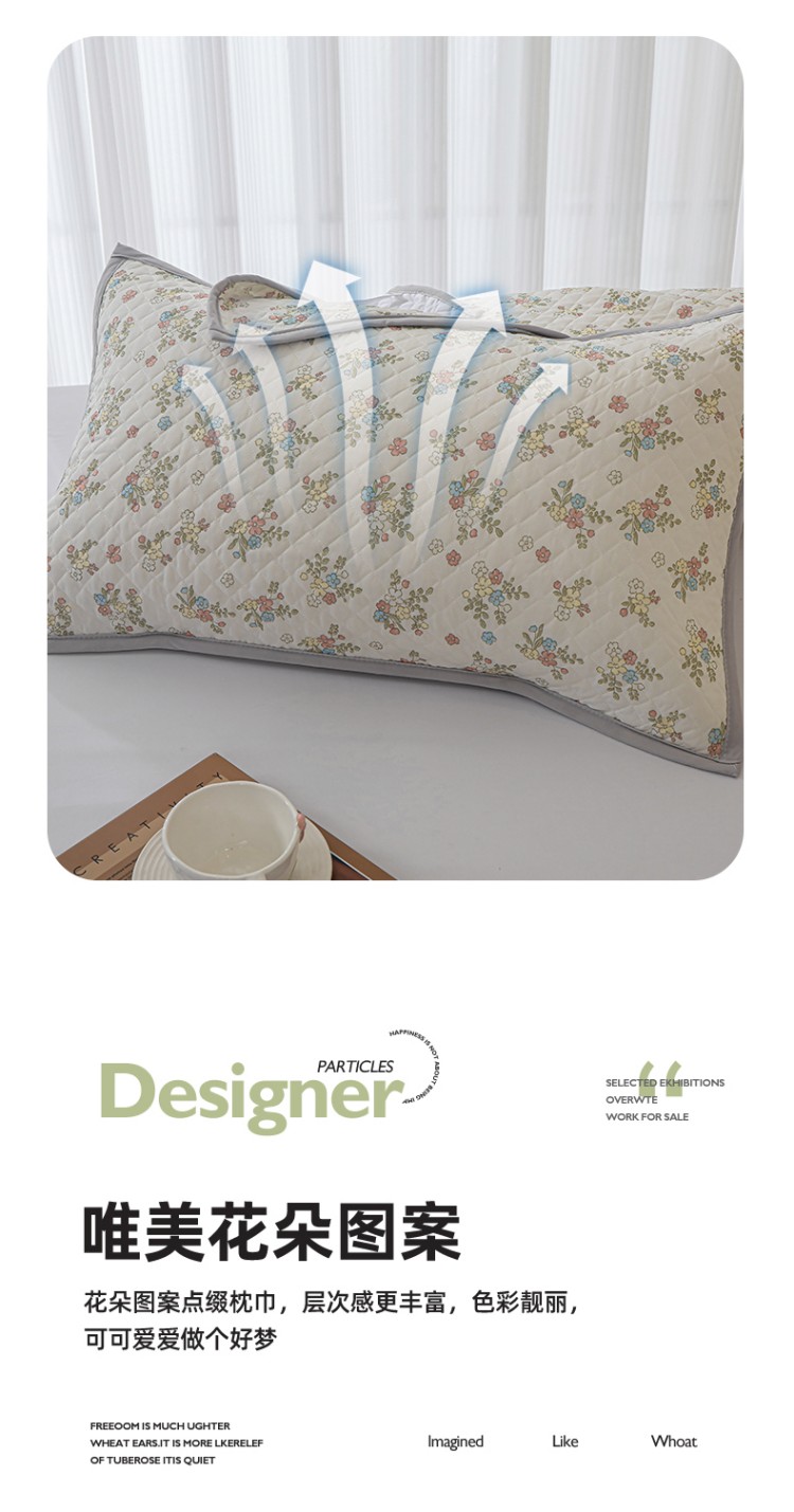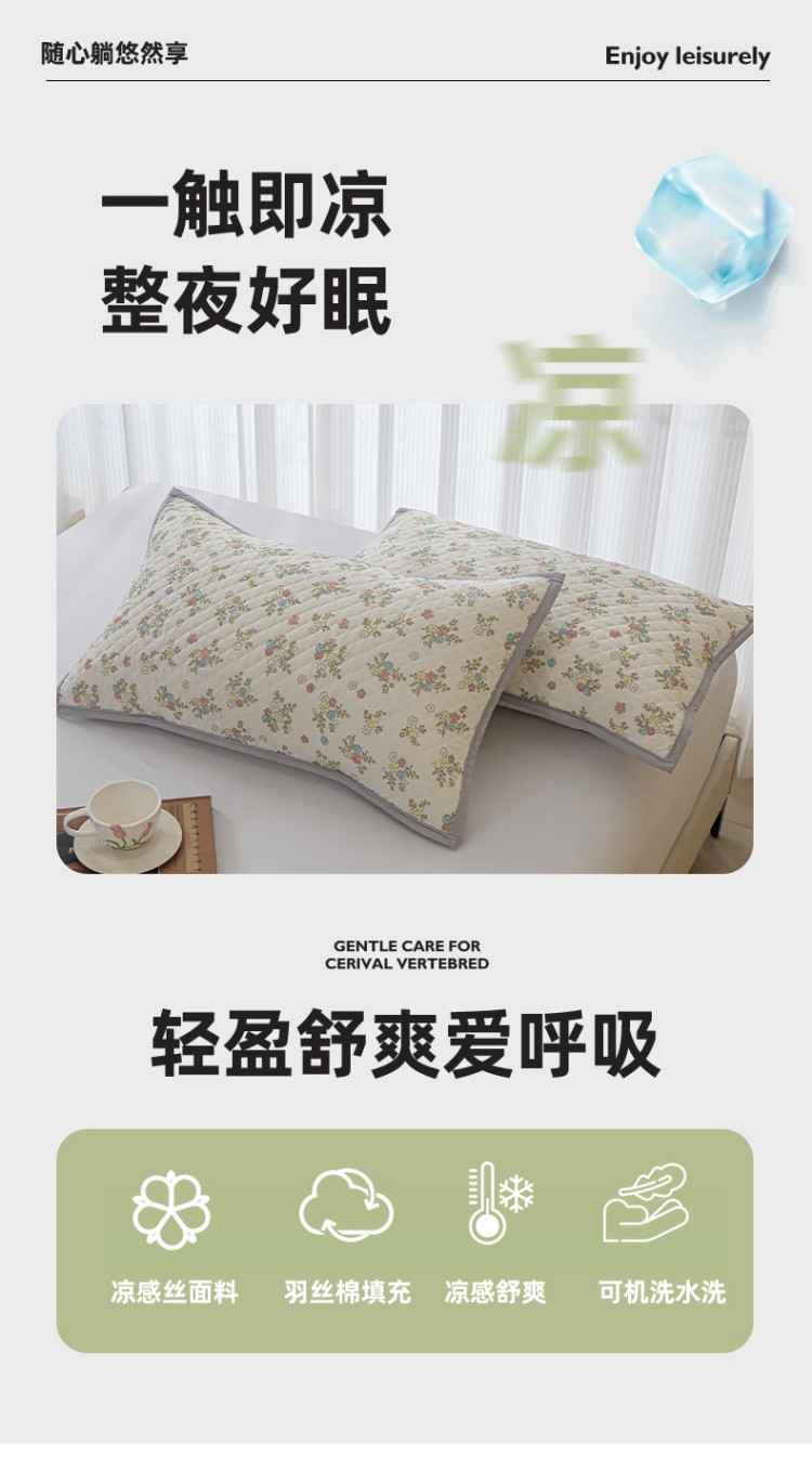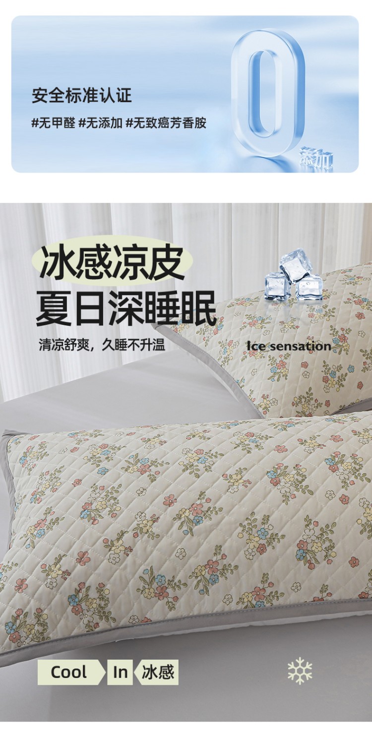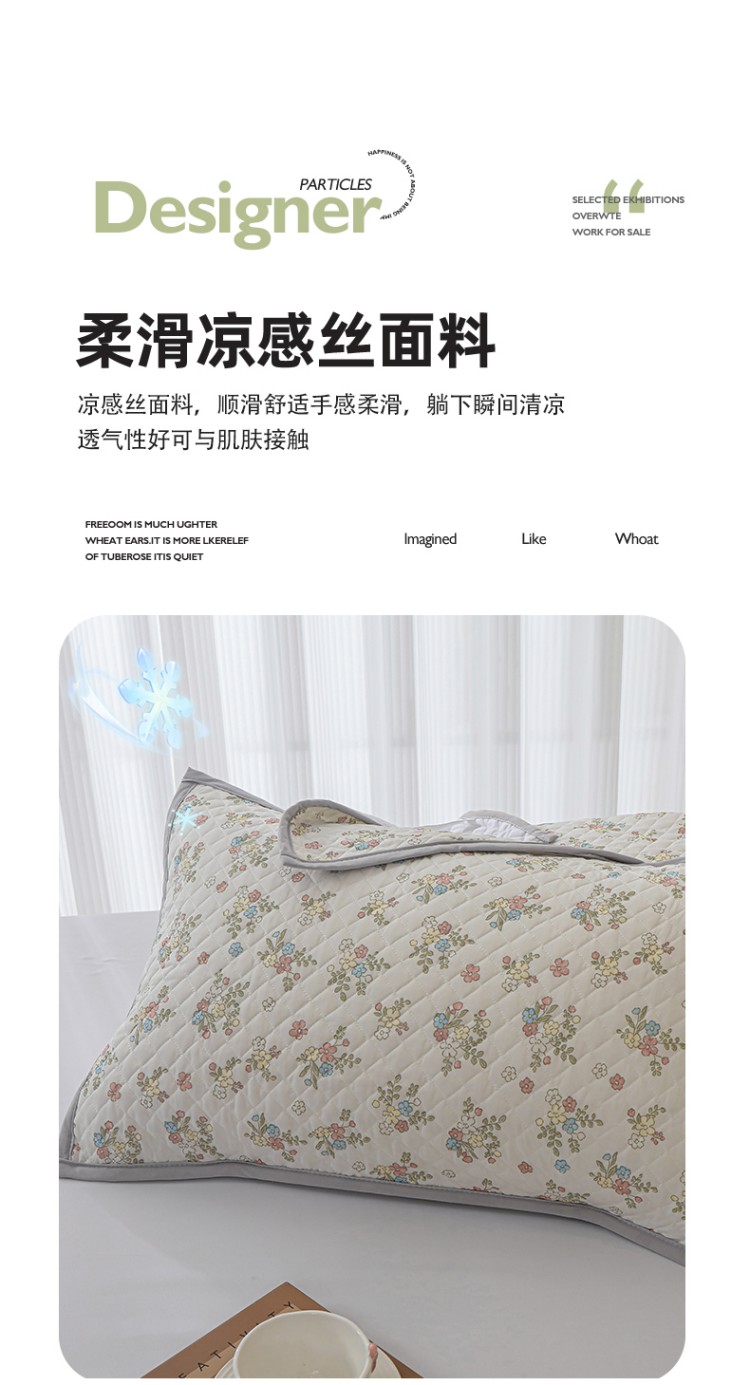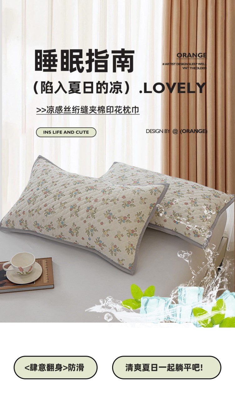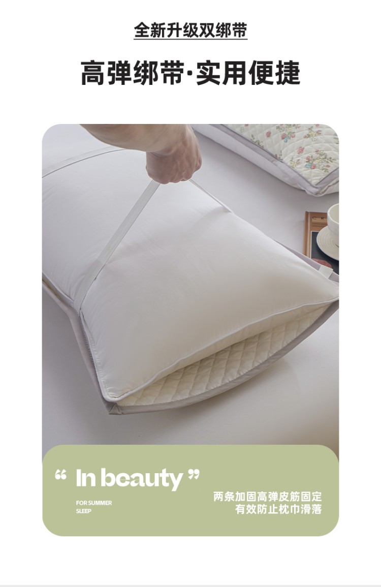 商品名称:美宜家 2025新款夏季凉感丝绗缝绑带枕巾隔脏吸汗冰丝枕巾 硕果 一只