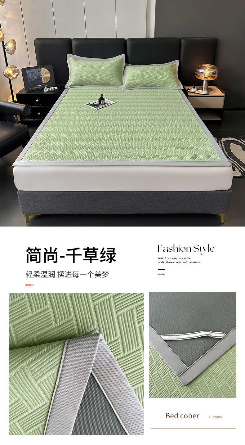 商品名称:雯豆家纺 2025夏季新款PE中分子凉感凉席三件套冰丝凉感席子纯色素色成人平铺绑带款 简尚-千草绿