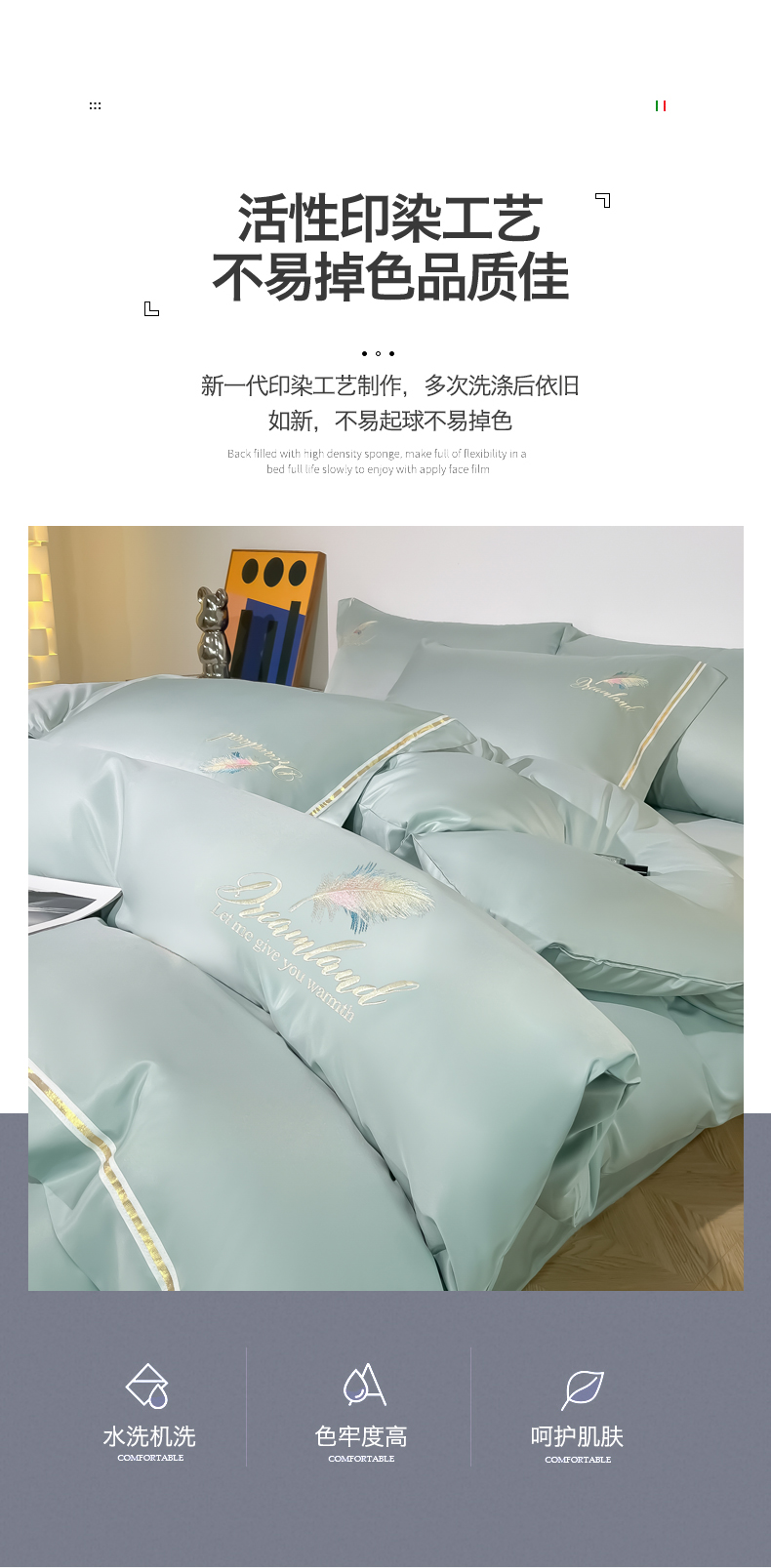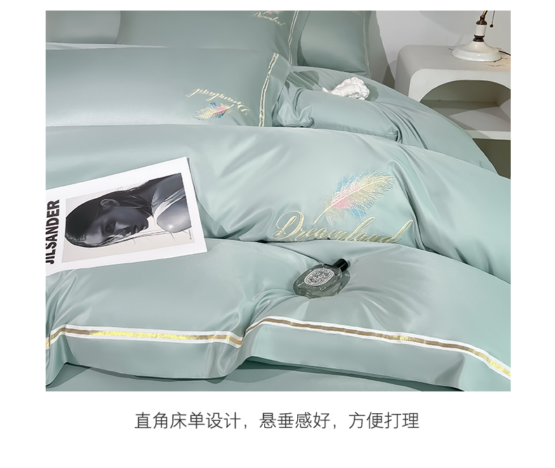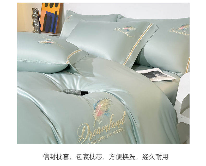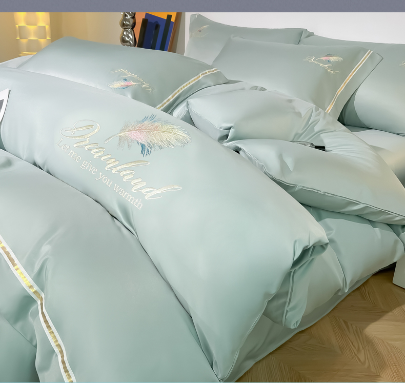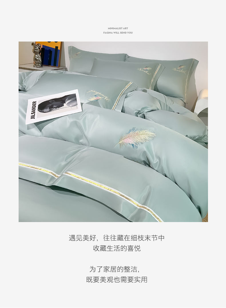 当前位置: 91家纺网 > 商品网购 > 床品套件 > 四件套 > 2025新款水洗冰丝刺绣四件套羽毛系列轻奢时尚北欧风床上用品学生宿舍三四件套 羽毛-浅水绿