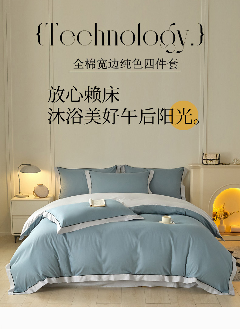 商品名称:万盛家纺 2025新款全棉宽边麻绳拼角四件套 天青兰-梧桐灰