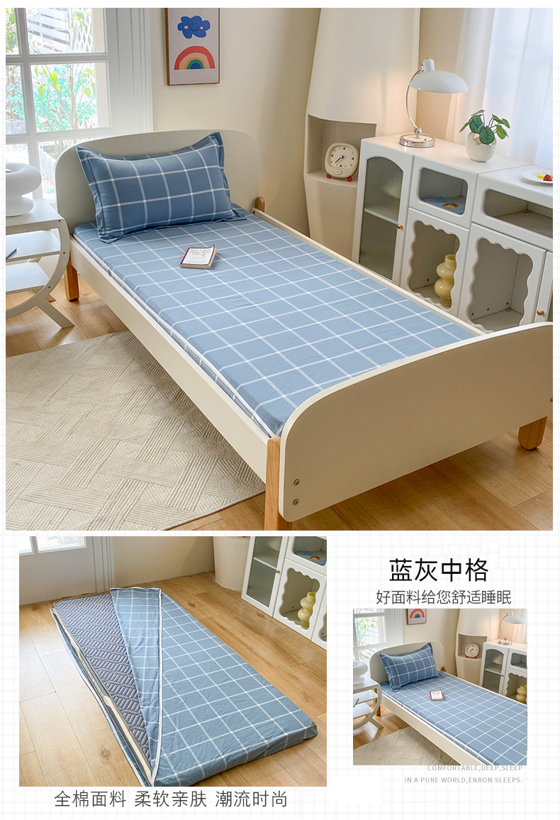 • 91家纺网 家纺一手货源 找家纺 凌云家纺 2025新款A类全棉水洗棉床垫套 蓝灰中格
