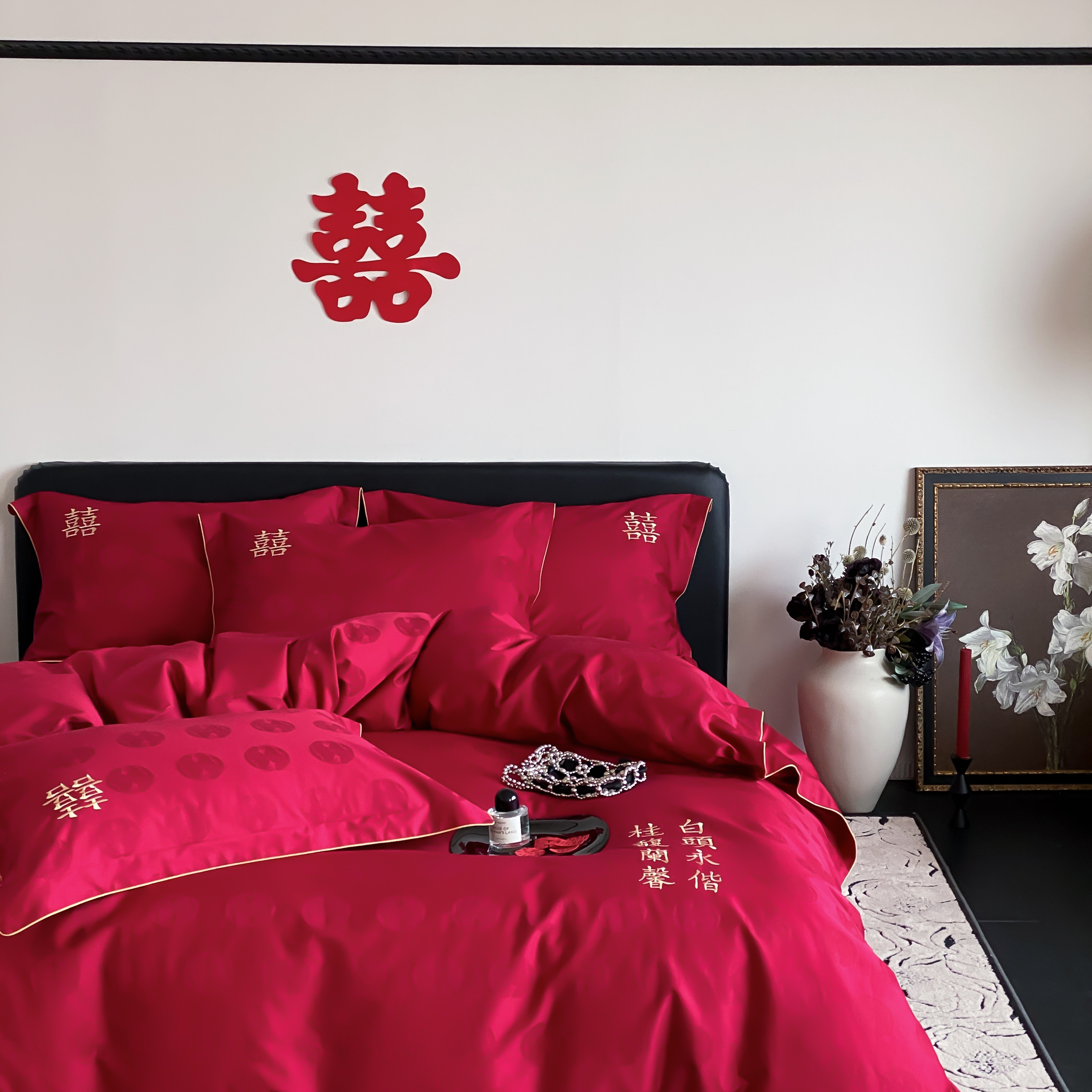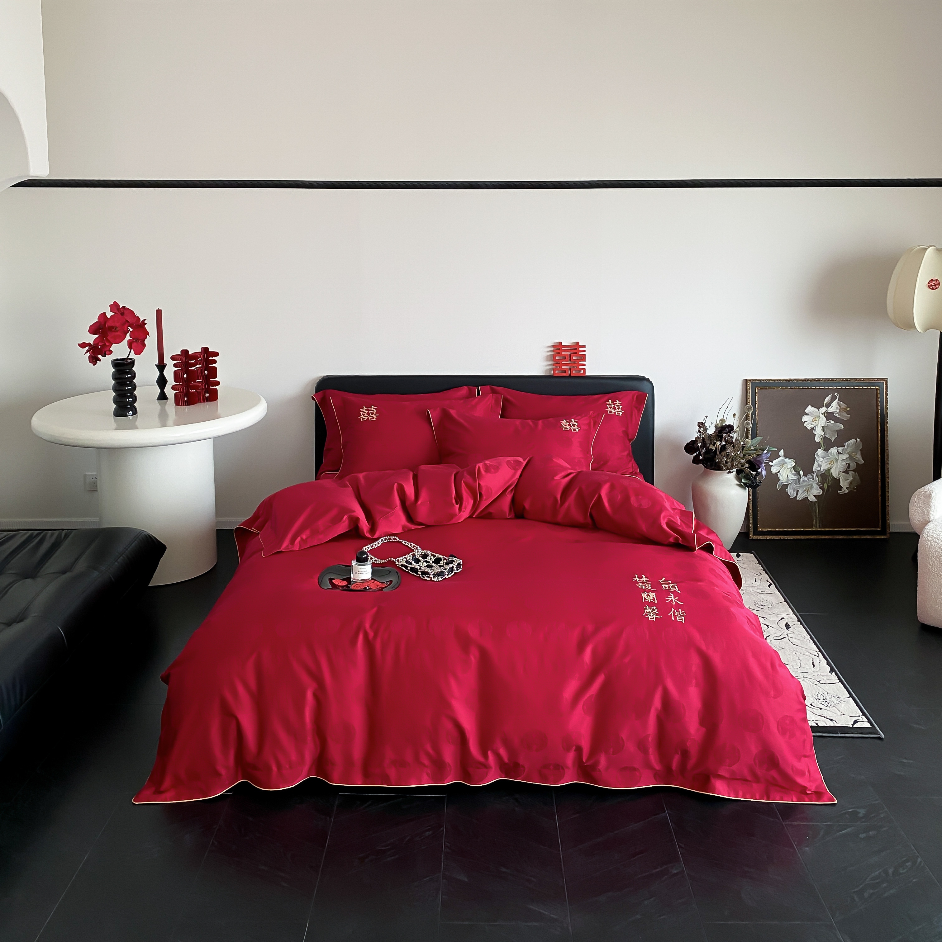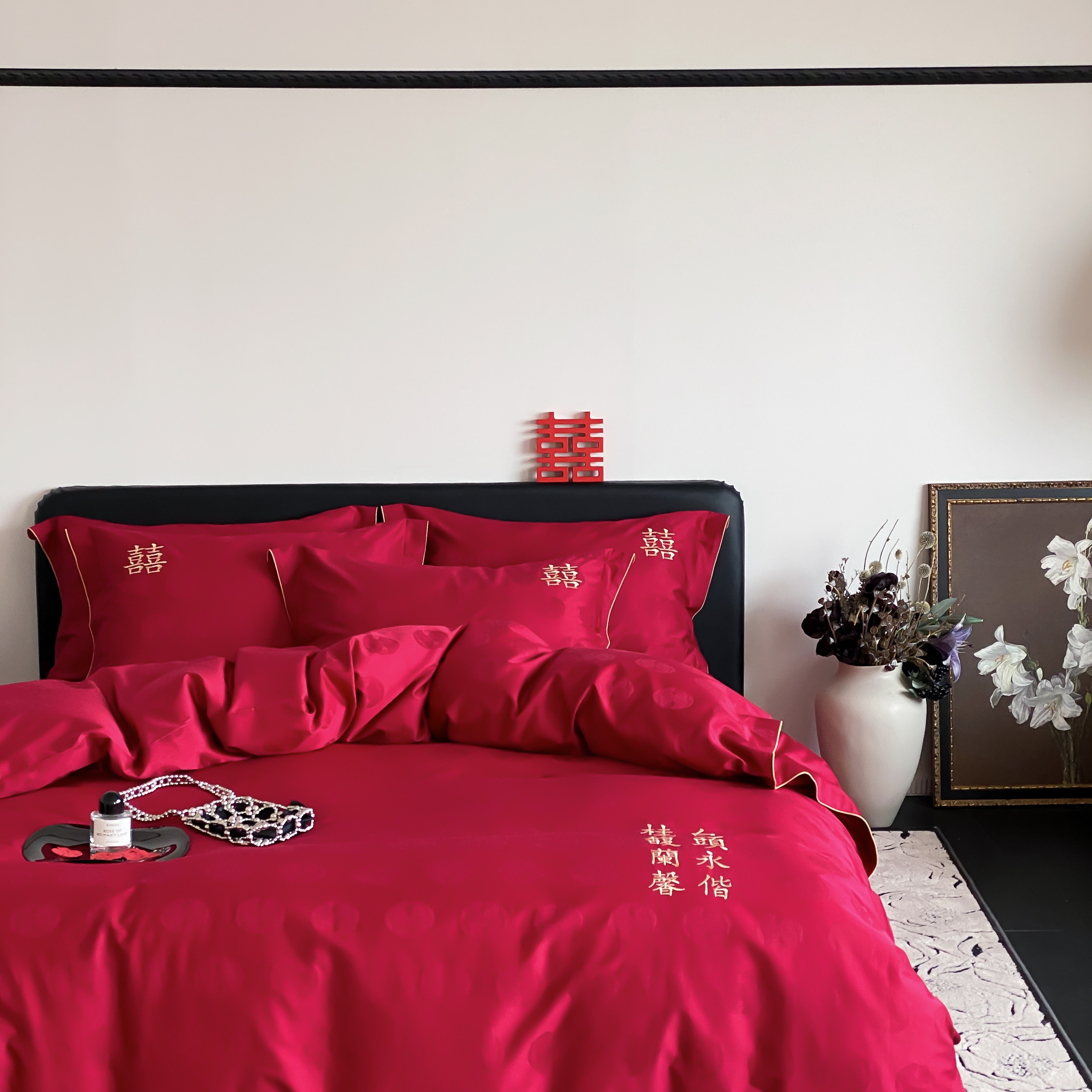 (总)江涞 2025新款高克重牛奶绒刺绣四件套-花月,花月-高级红