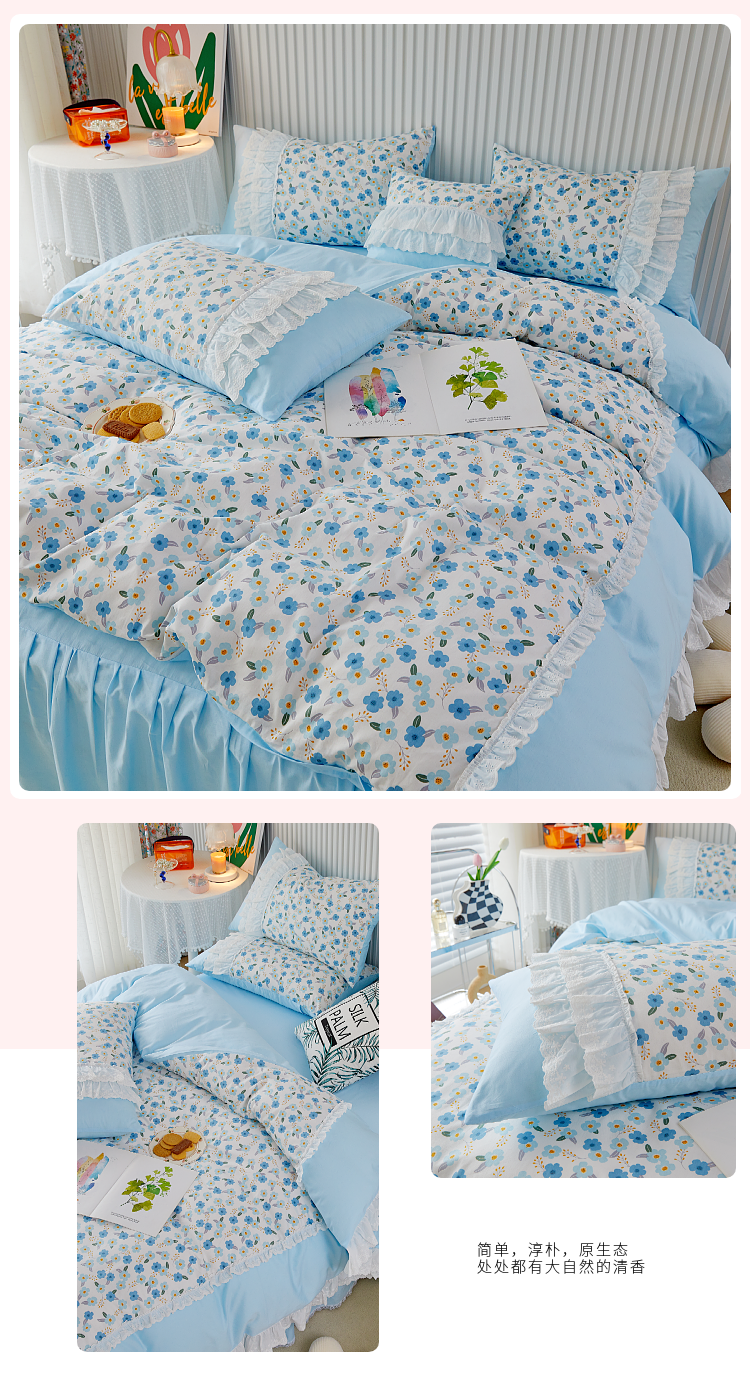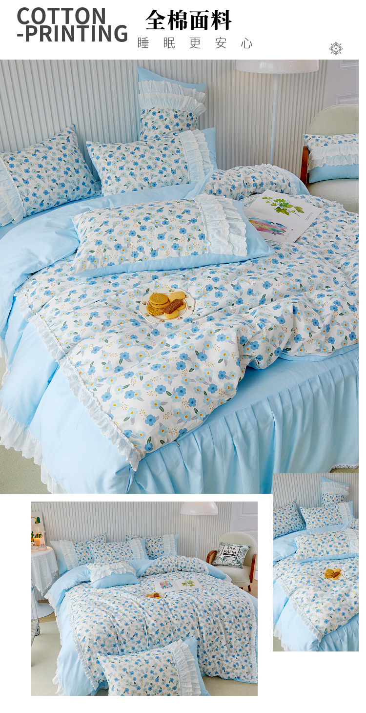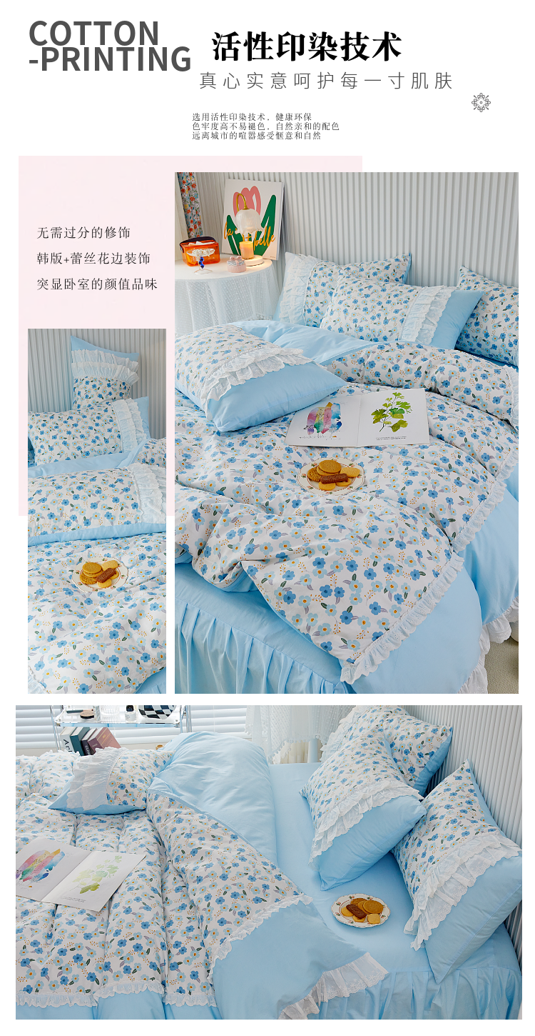 商品名称:亲亲公主 2025全棉蕾丝花边床裙公主风四件套 甜心花园-蓝色