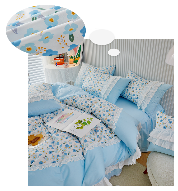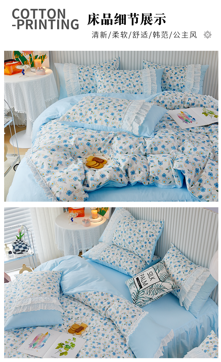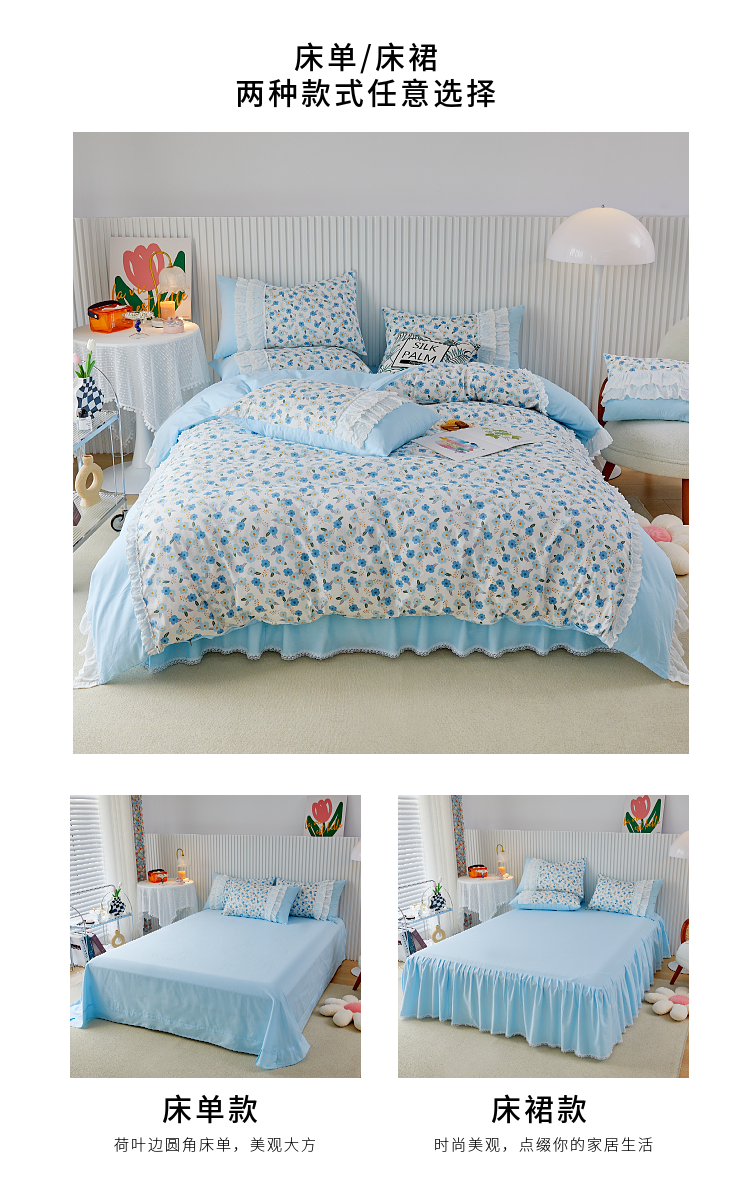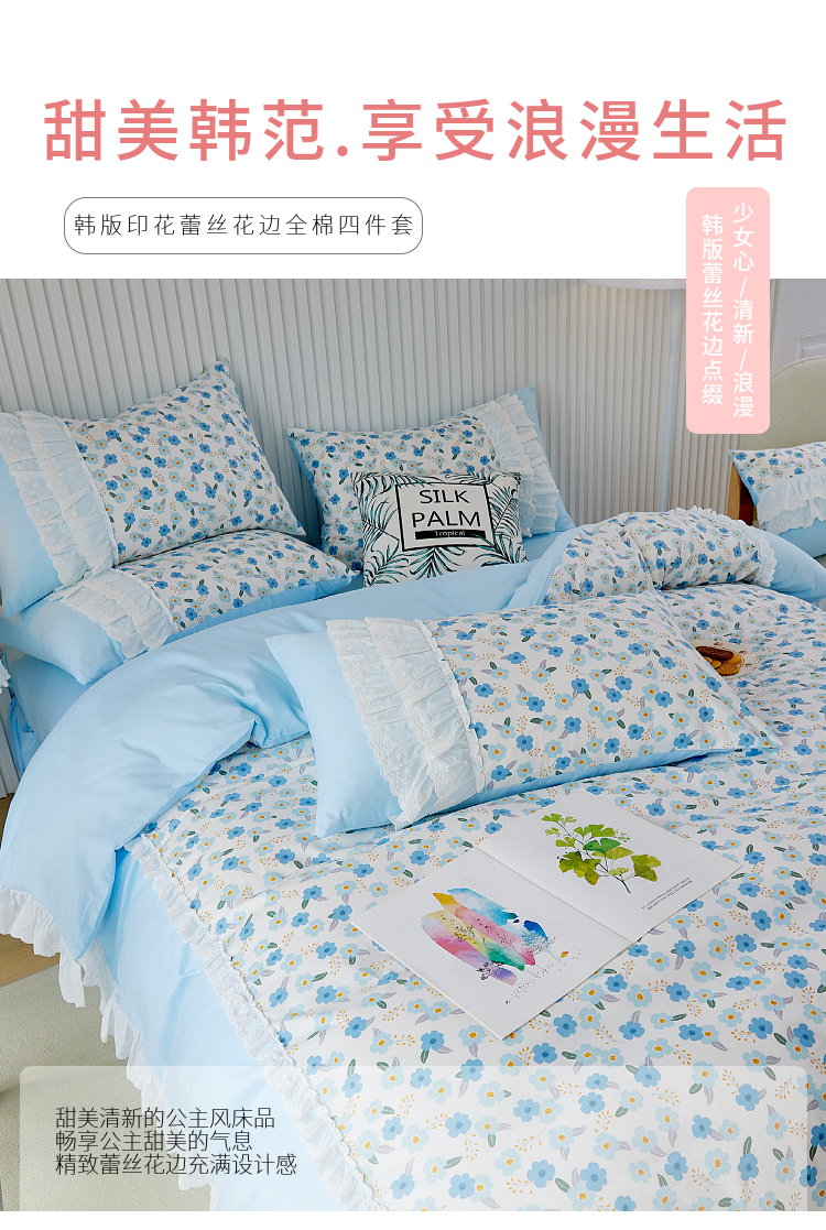 商品名称:亲亲公主 2025全棉蕾丝花边床裙公主风四件套 甜心花园-蓝色