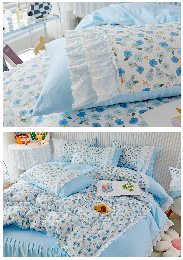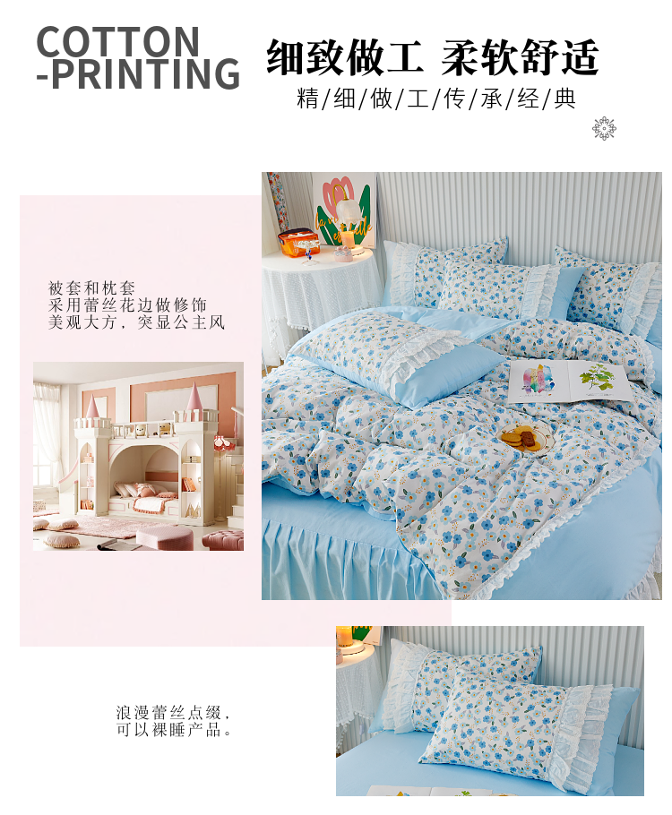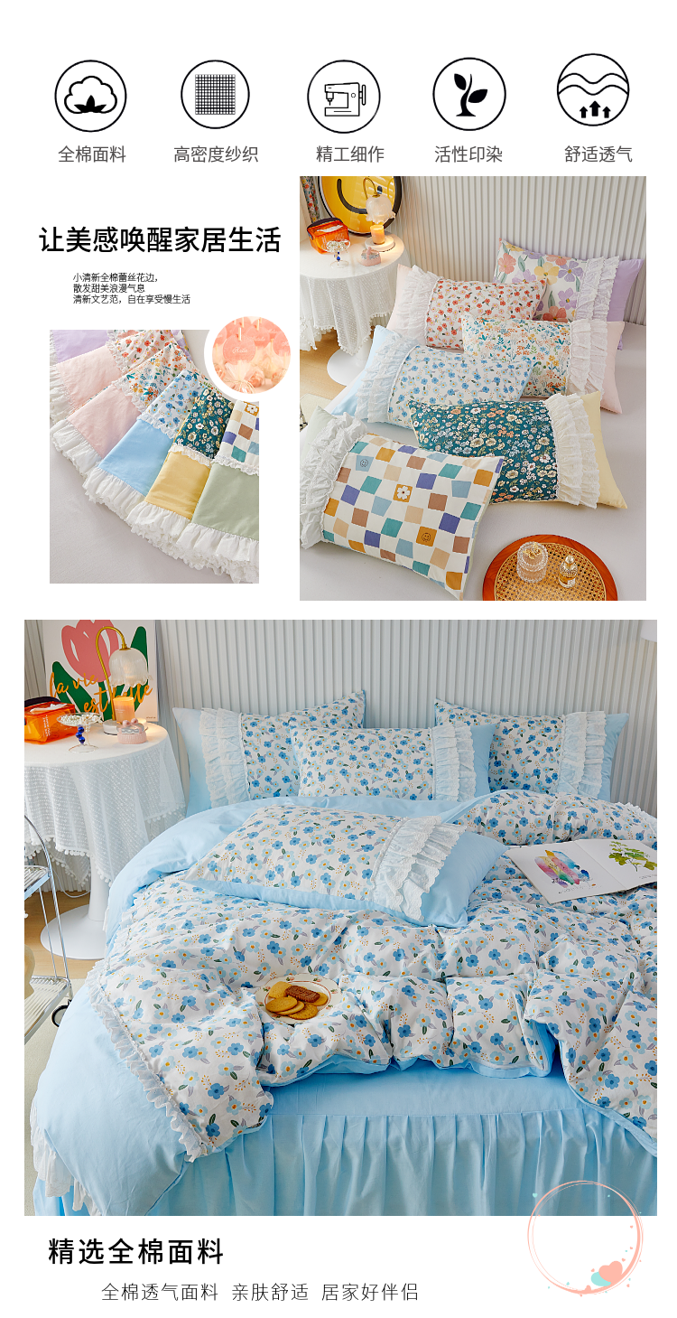 亲亲公主 2025全棉蕾丝花边床裙公主风四件套 甜心花园-蓝色