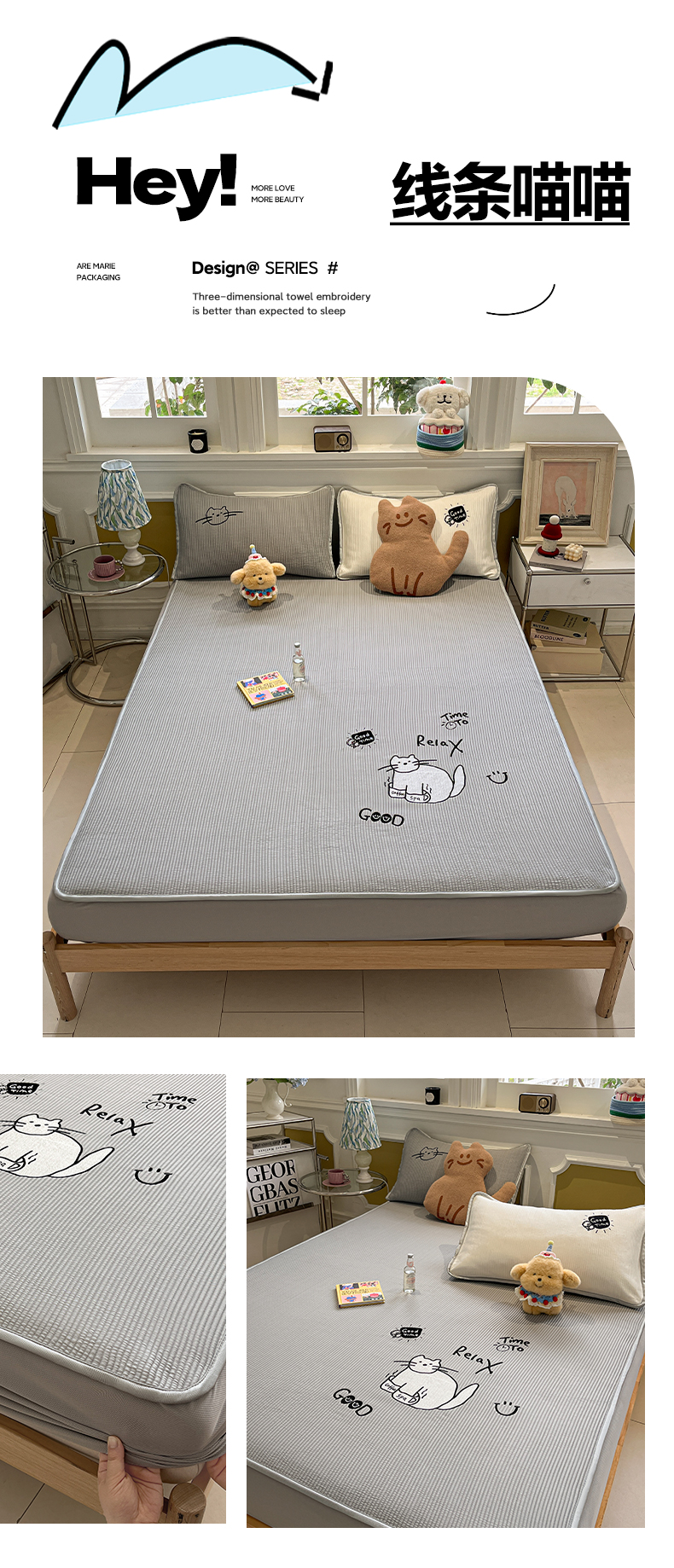 商品名称:如一 2025春夏新款A类卡通刺绣PE中分子冰豆豆凉感软席凉席席子 床笠款-可爱猫蓝