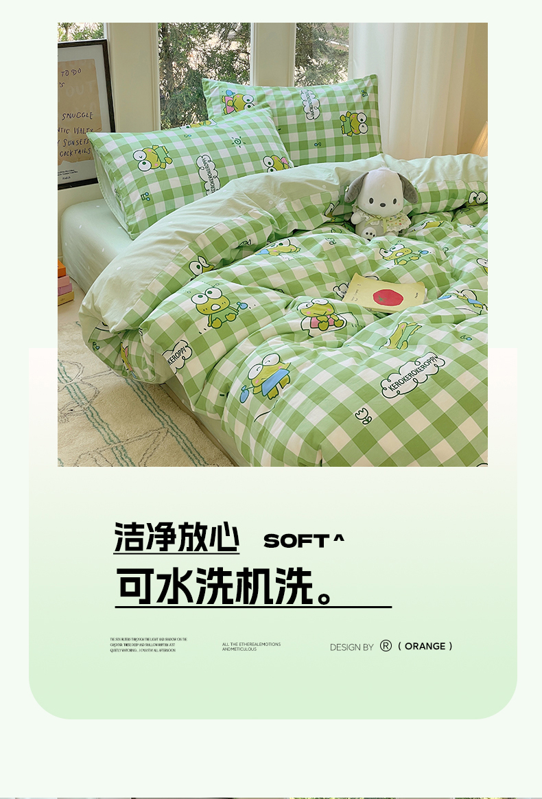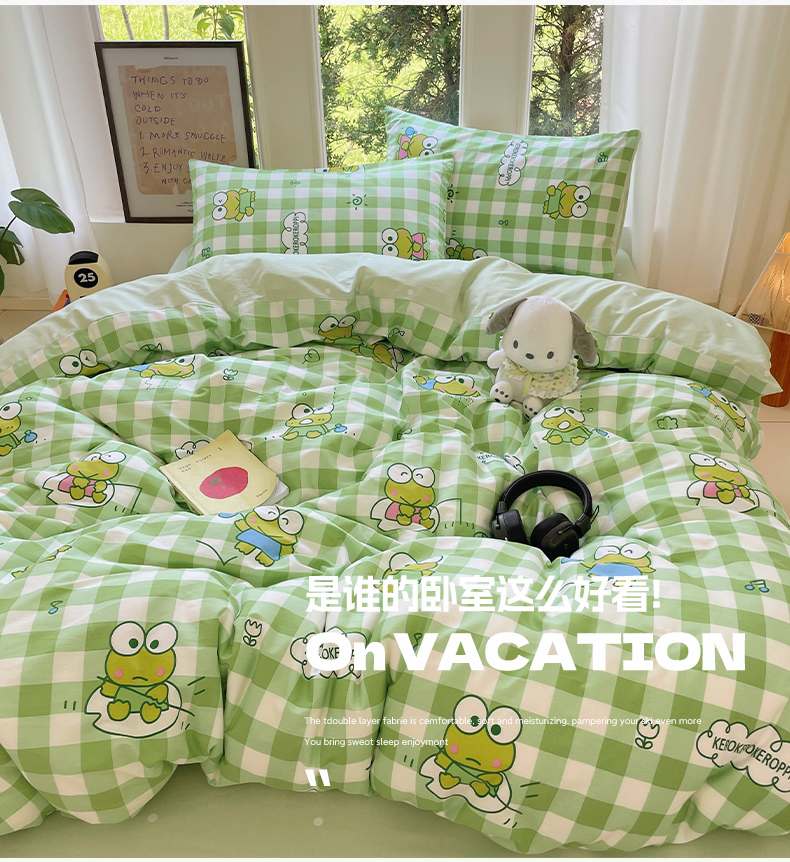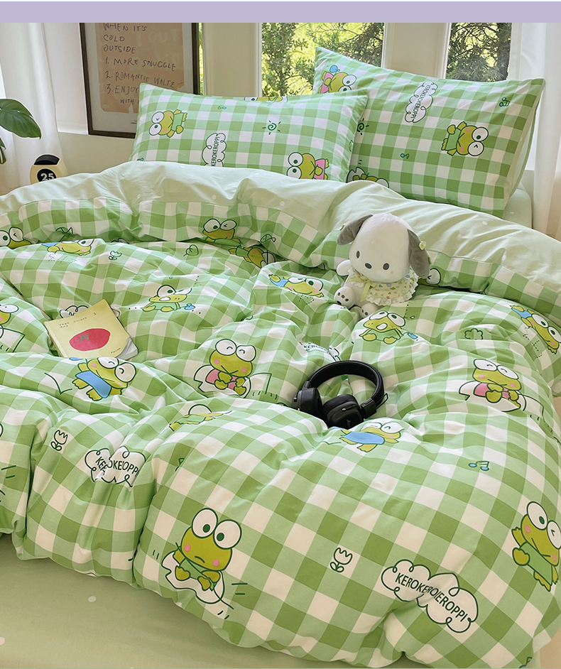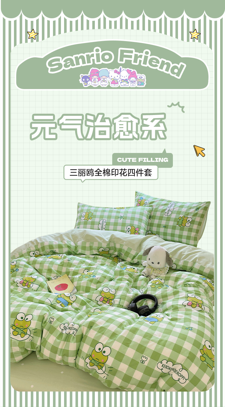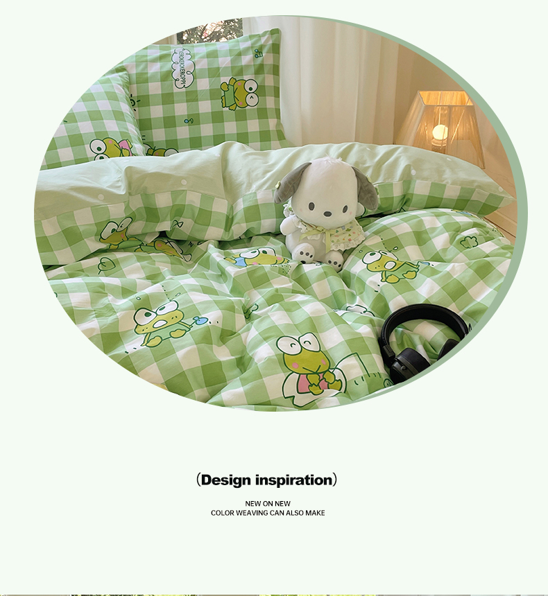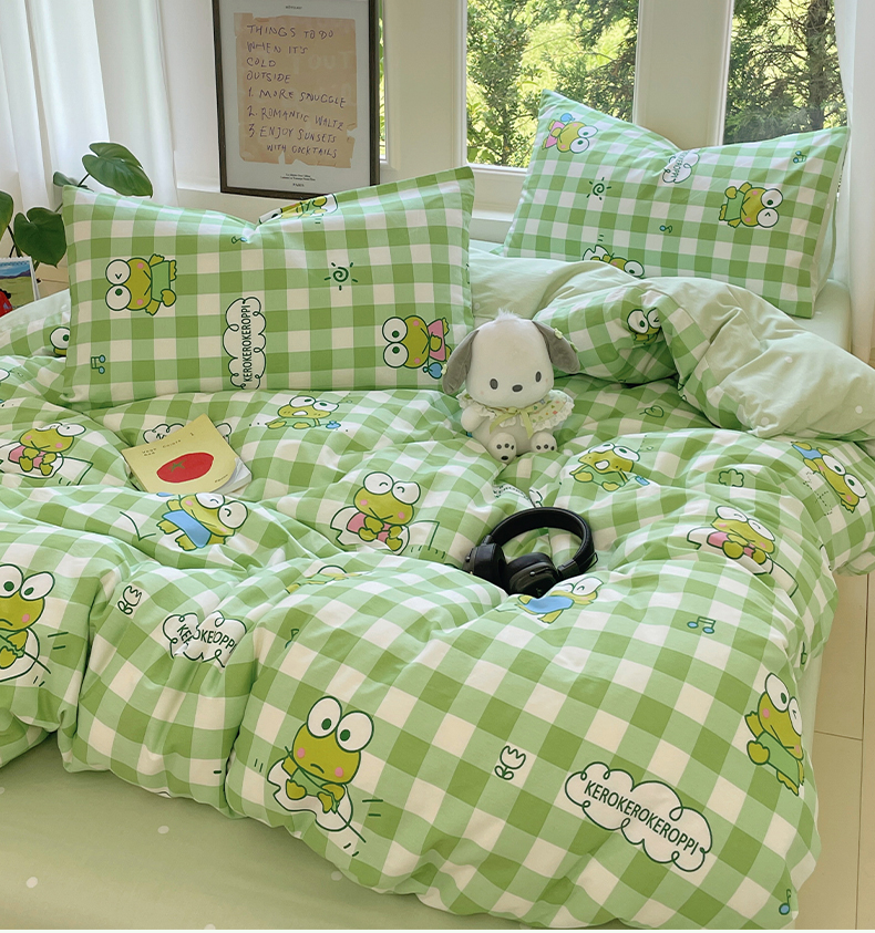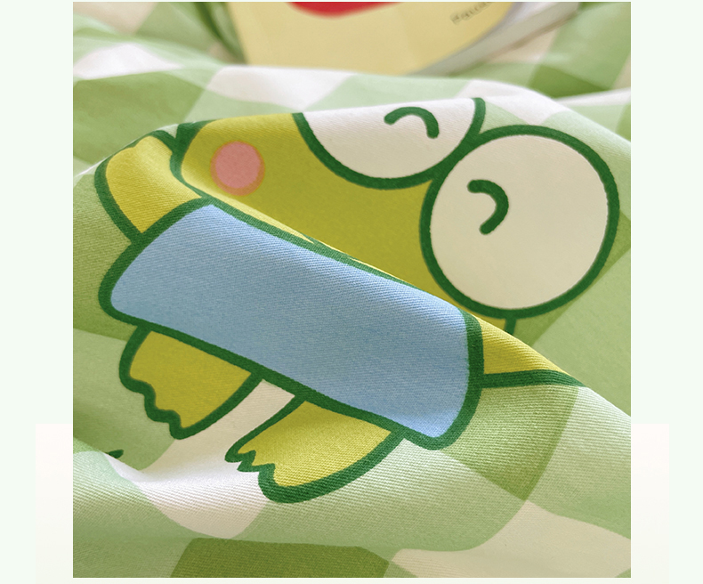 蓝邻家纺 2025年新款三丽鸥正版授权全棉印花四件套系列-大床图 格子大眼蛙