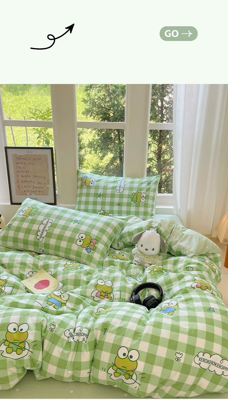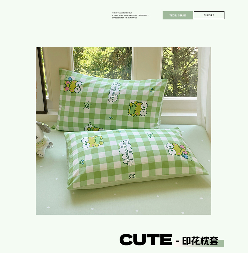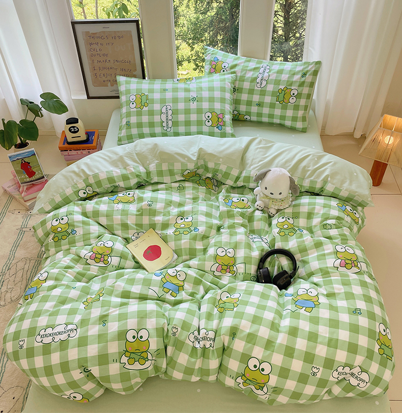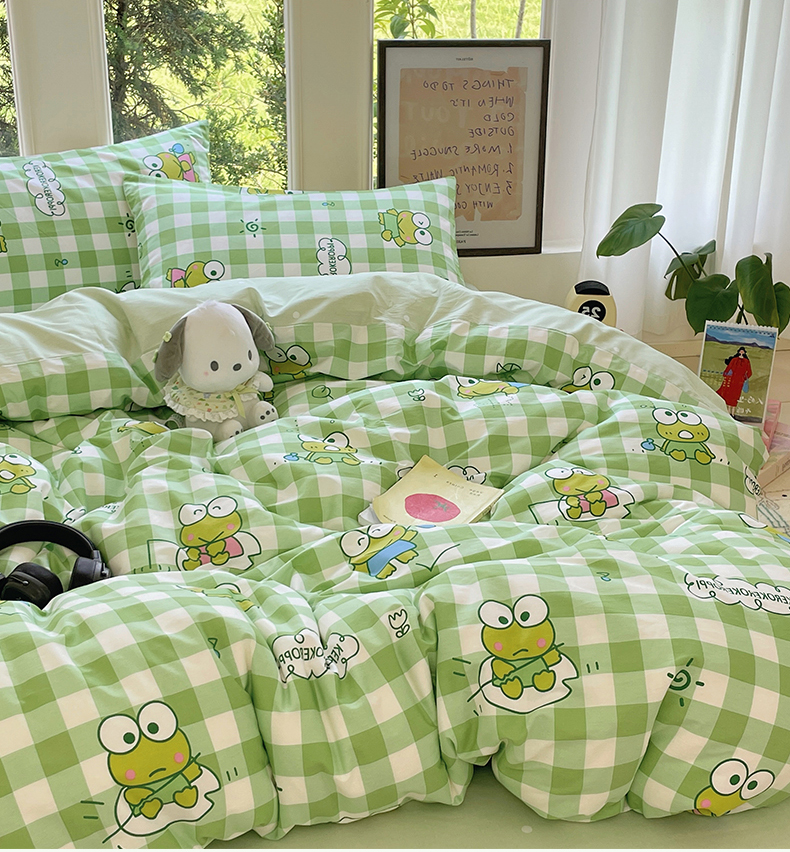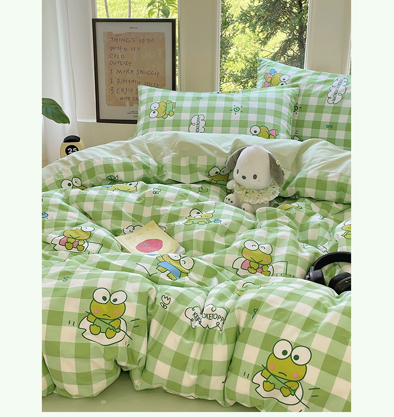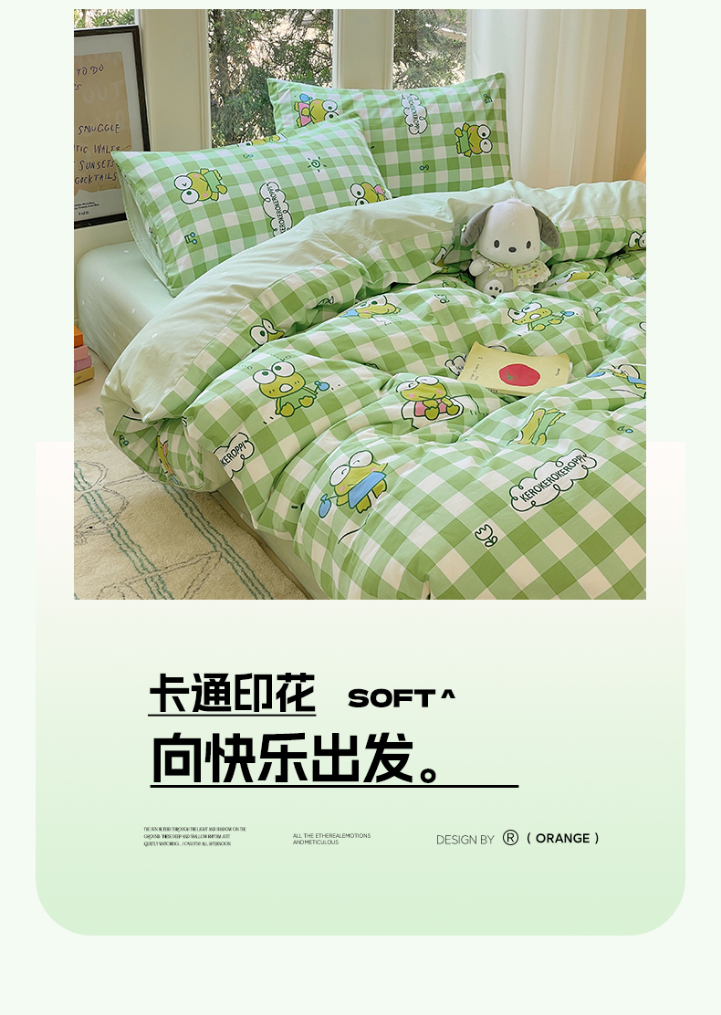 蓝邻家纺 2025年新款三丽鸥正版授权全棉印花四件套系列-大床图 格子大眼蛙