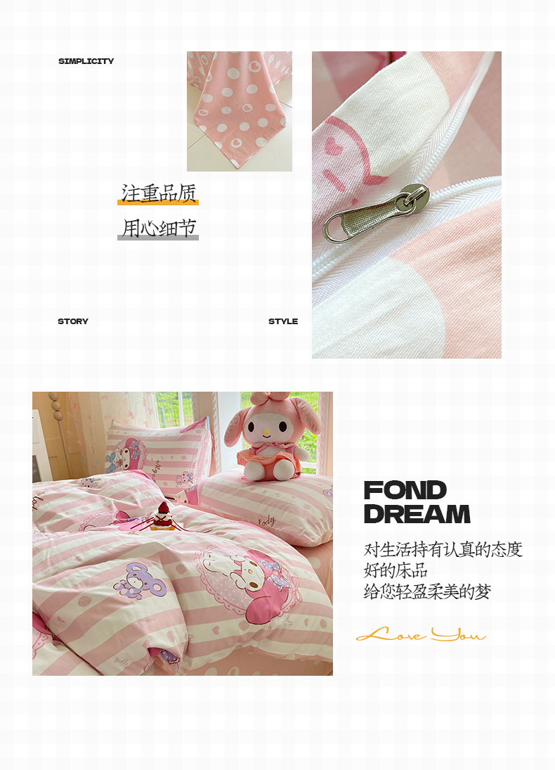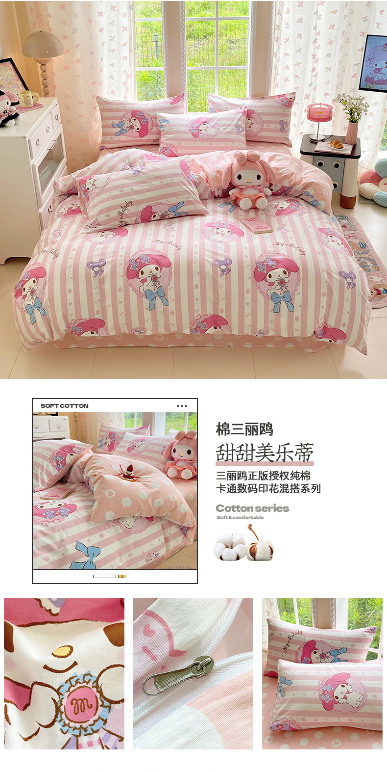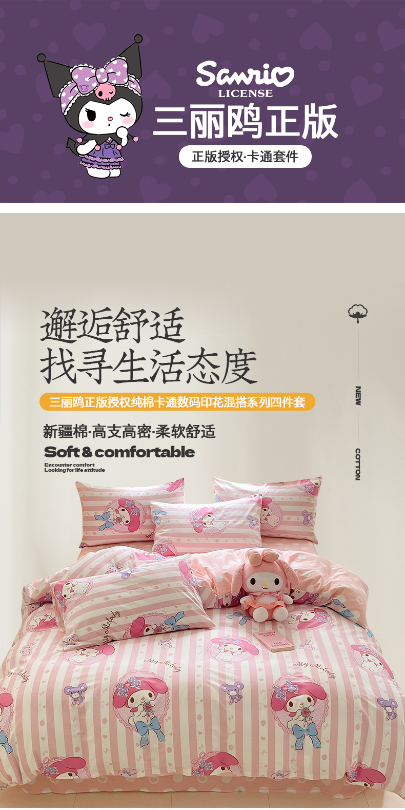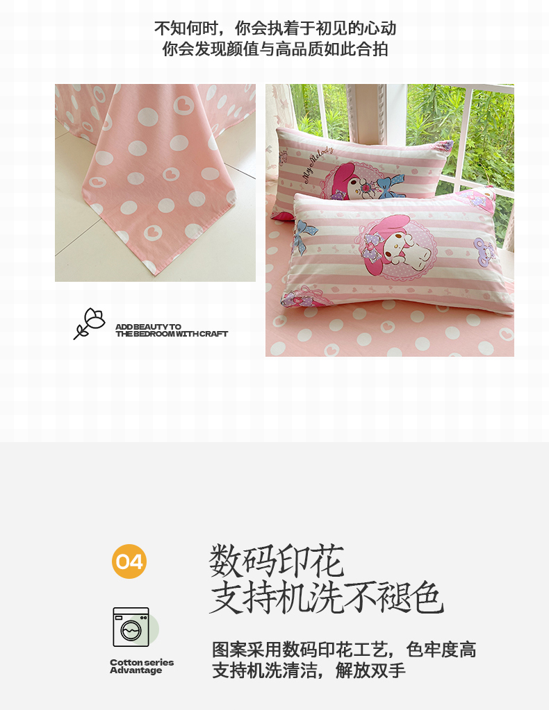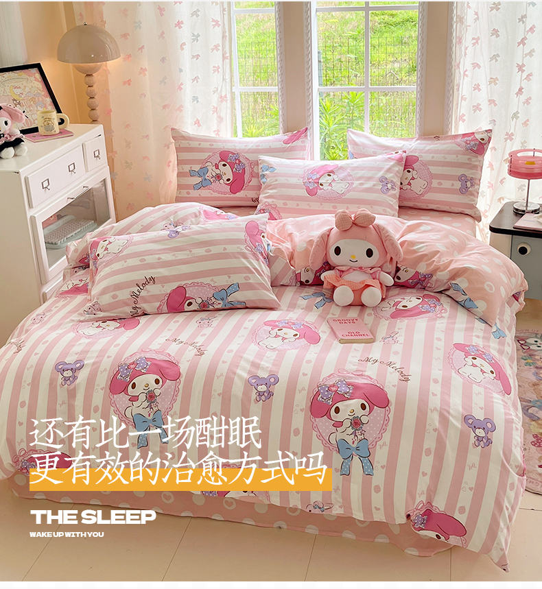 当前位置: 91家纺网 > 商品网购 > 床品套件 > 四件套 > 全棉普通四件套 > 金爱家2025新款三丽鸥正版授权卡通数码印花混搭纯棉印花系列四件套 棉三丽鸥-甜甜美乐蒂
