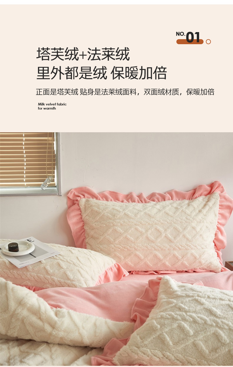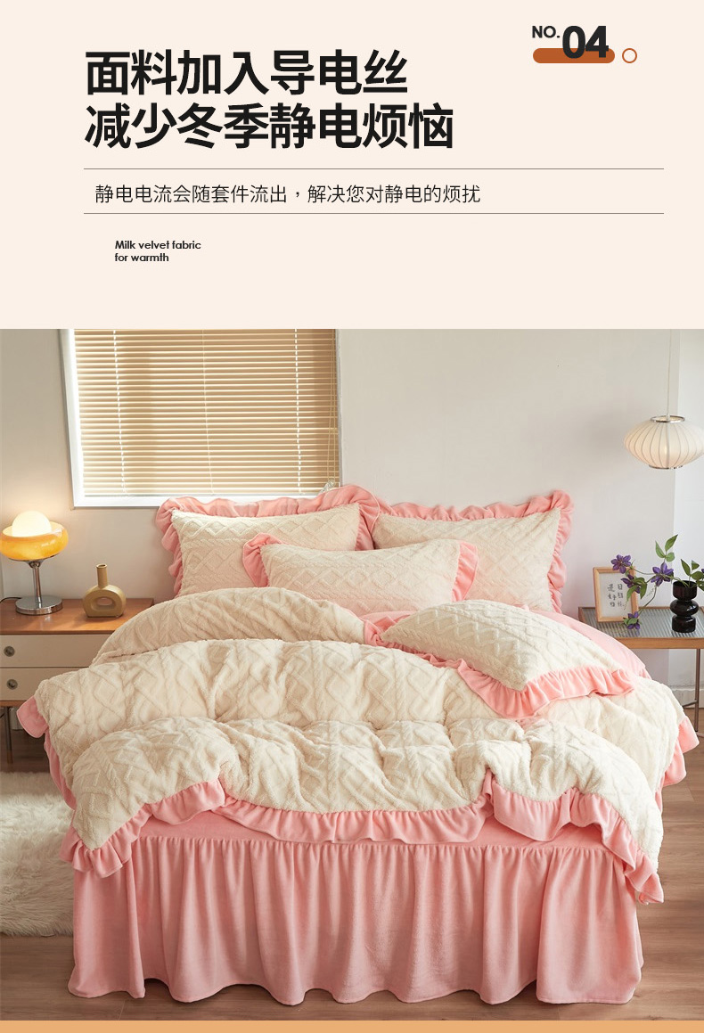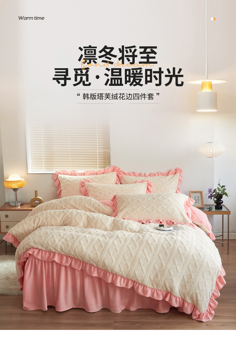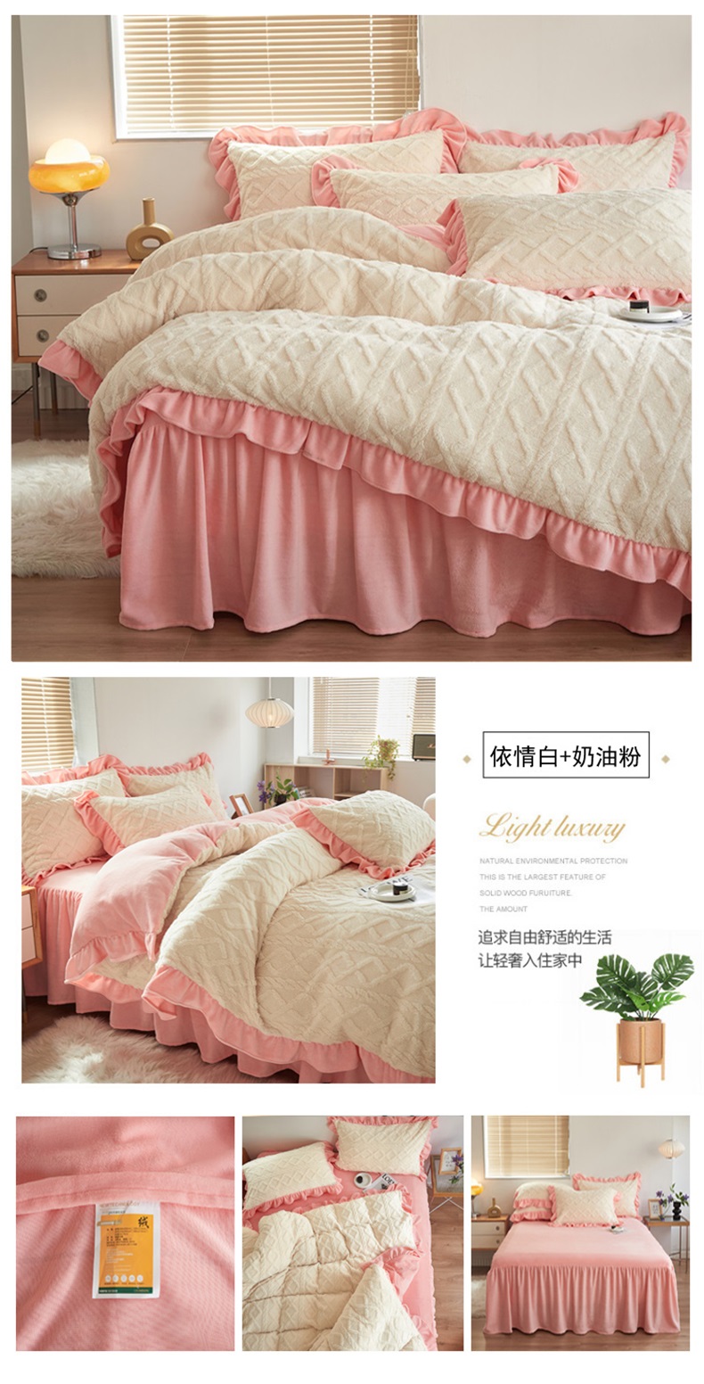 当前位置: 91家纺网 > 商品网购 > 床品套件 > 四件套 > 牛奶绒四件套 > 睡美人 2025新款韩版塔芙绒牛奶绒床单床裙床笠款四件套 依情白+奶油粉