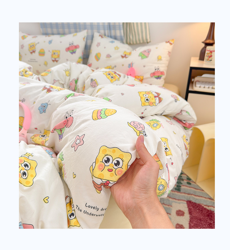 商品名称:罗亿家纺 2025新款软绵绵的双拼印花小清新水洗云朵棉四件套(含买家秀场景二)开心小海棉