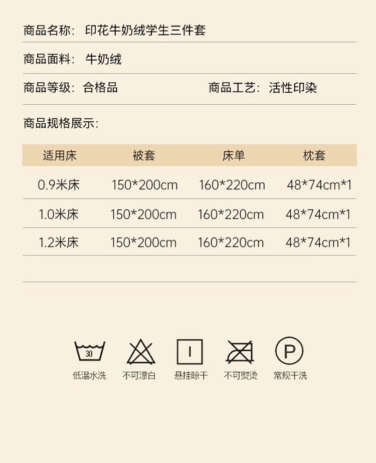 0.9m床-床单1.6X2.3,被套1.5x2.0 枕套1只