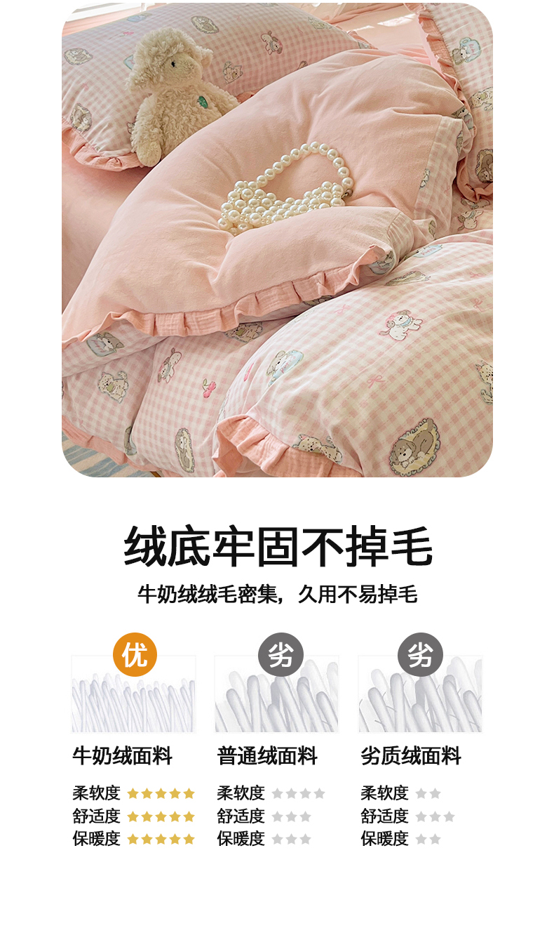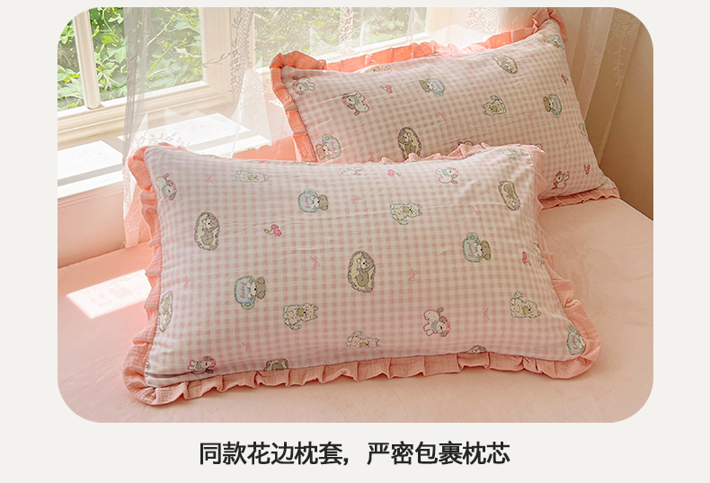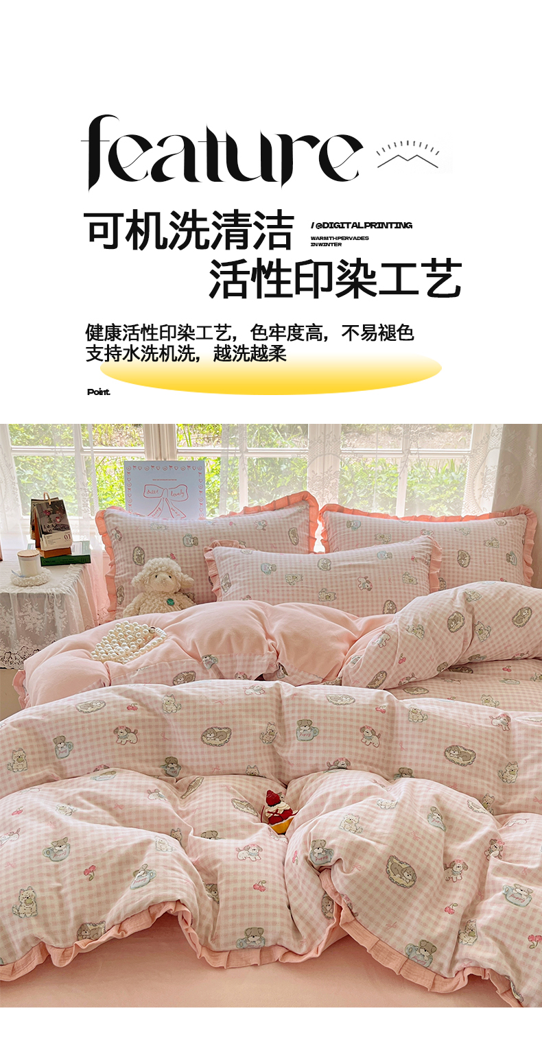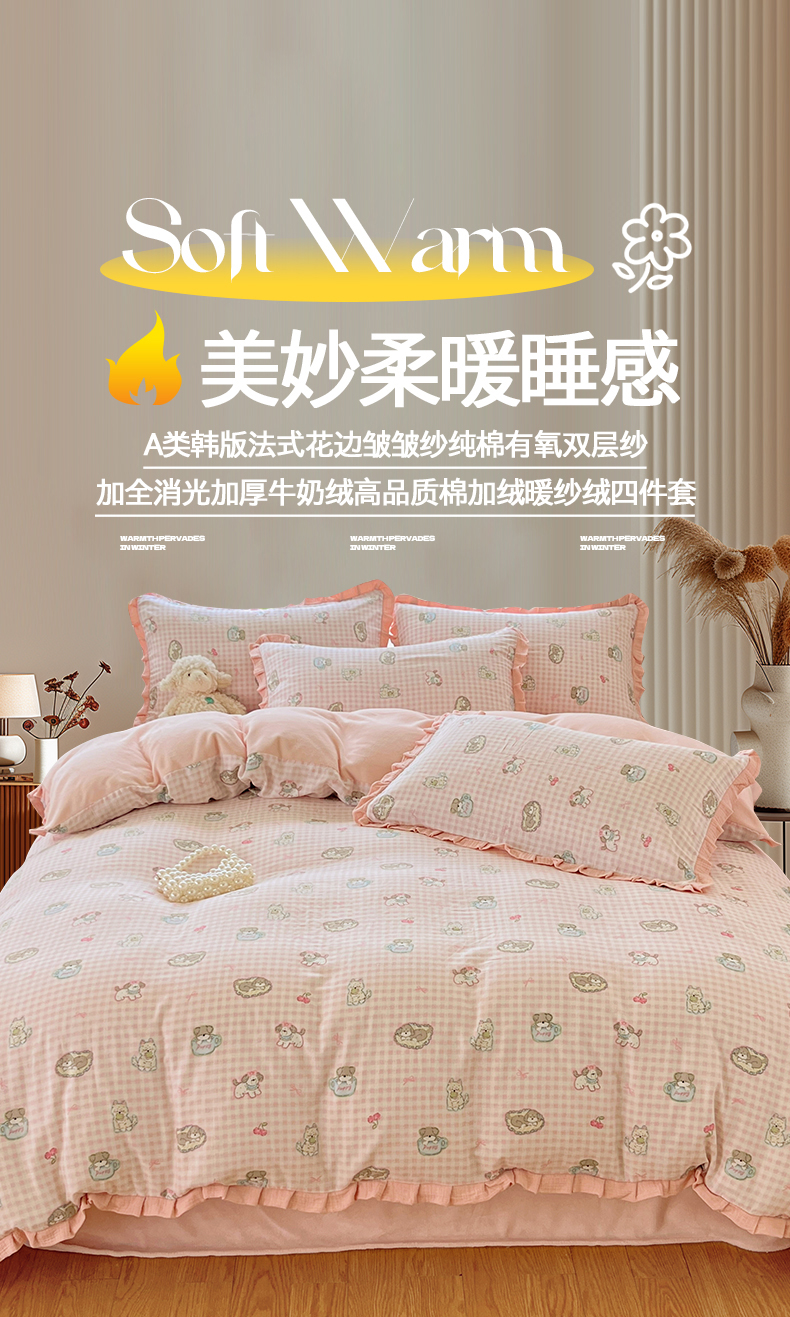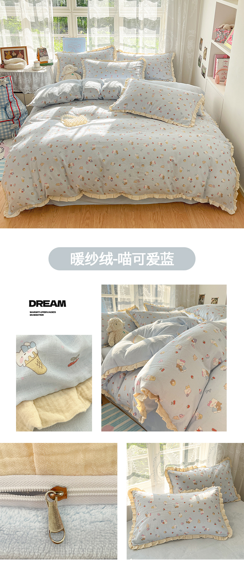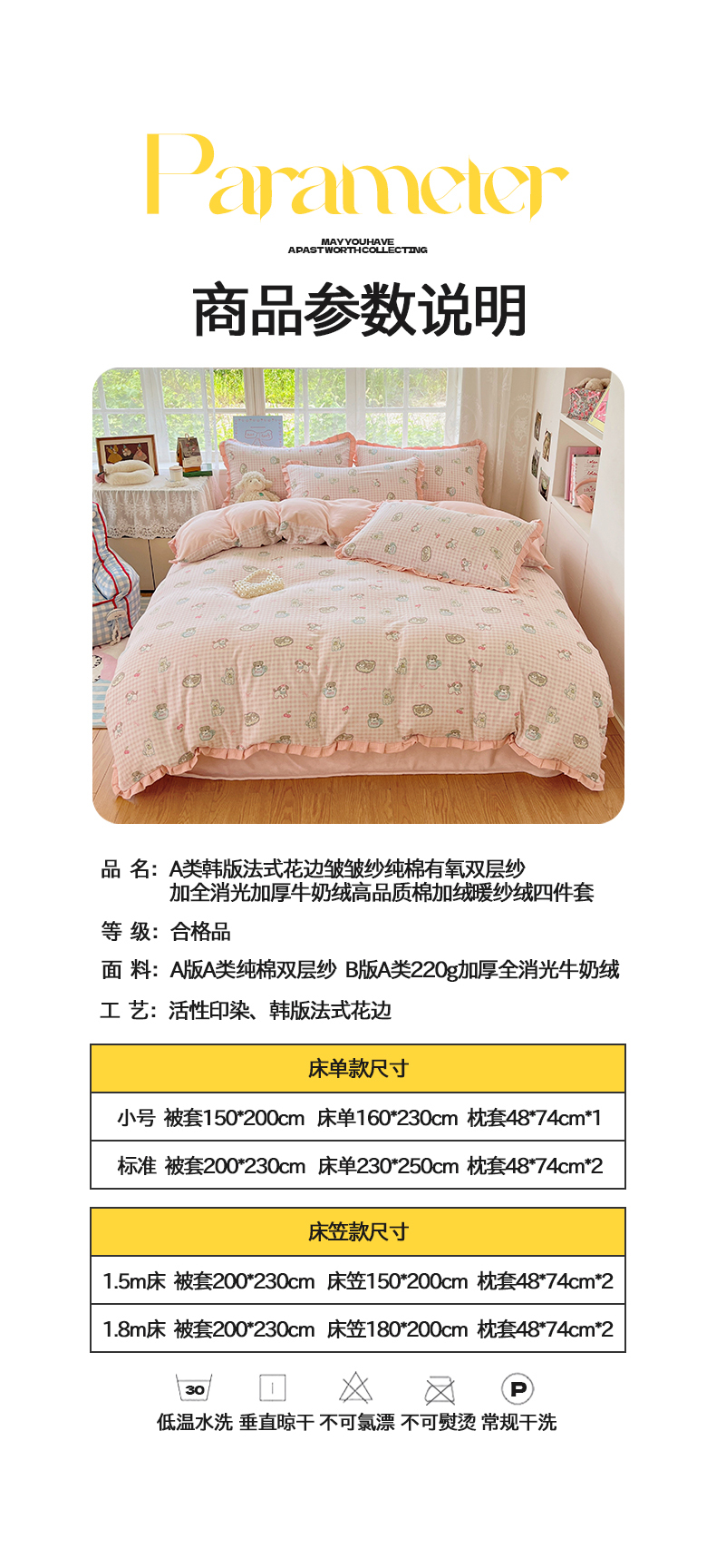 商品名称:桃子家居 2025新款A类韩版花边皱皱纱纯棉有氧双层纱加全消光加厚牛奶绒高品质棉加绒暖纱绒四件套 暖纱绒-小甜心