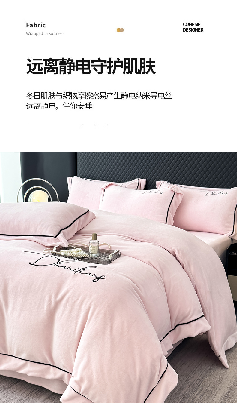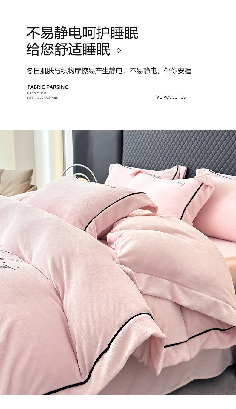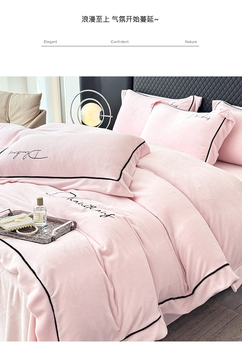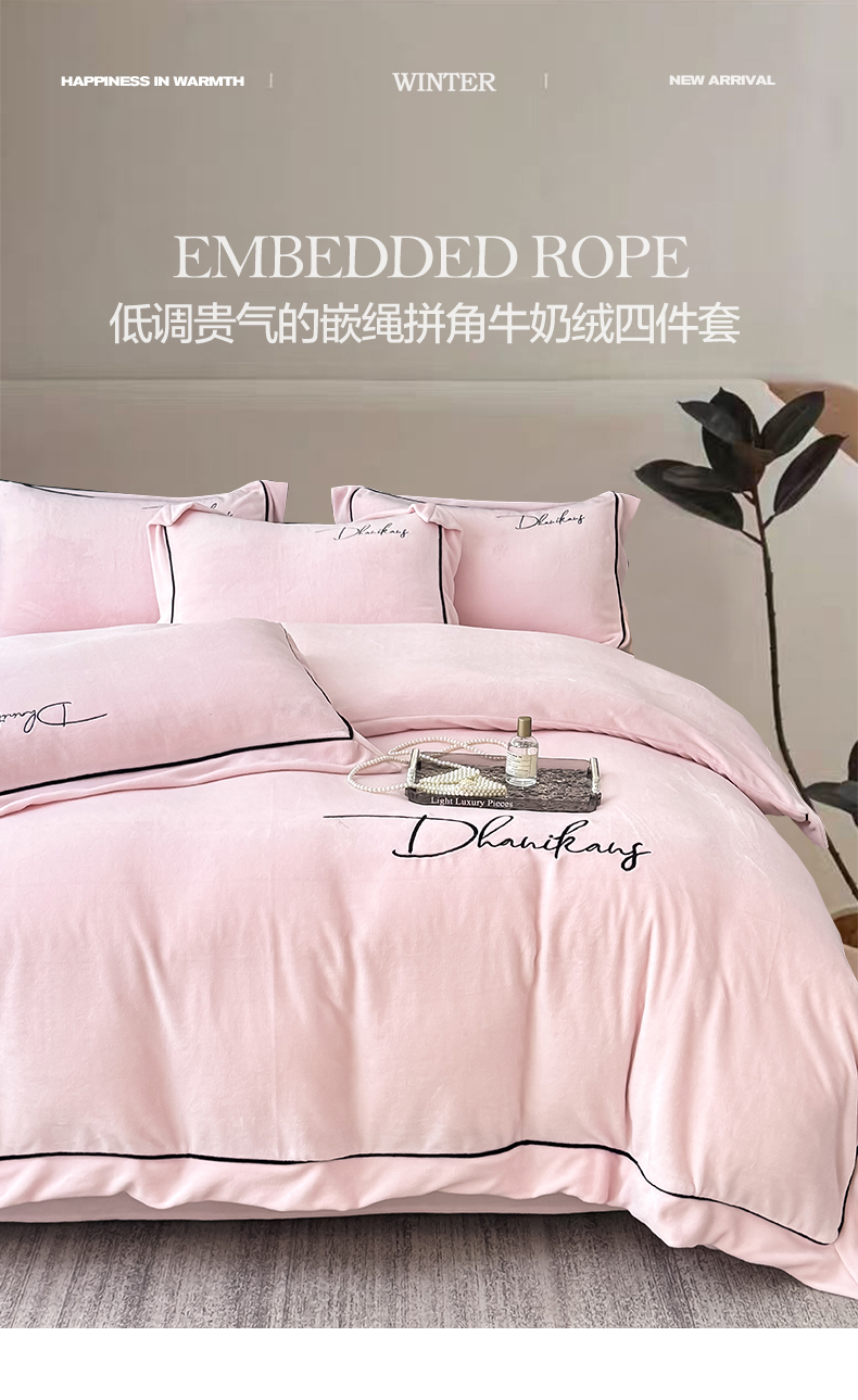 商品名称:KA家纺 2025新款冬轻奢刺绣款嵌绳大拼角牛奶绒四件套 轻奢牛奶绒-粉