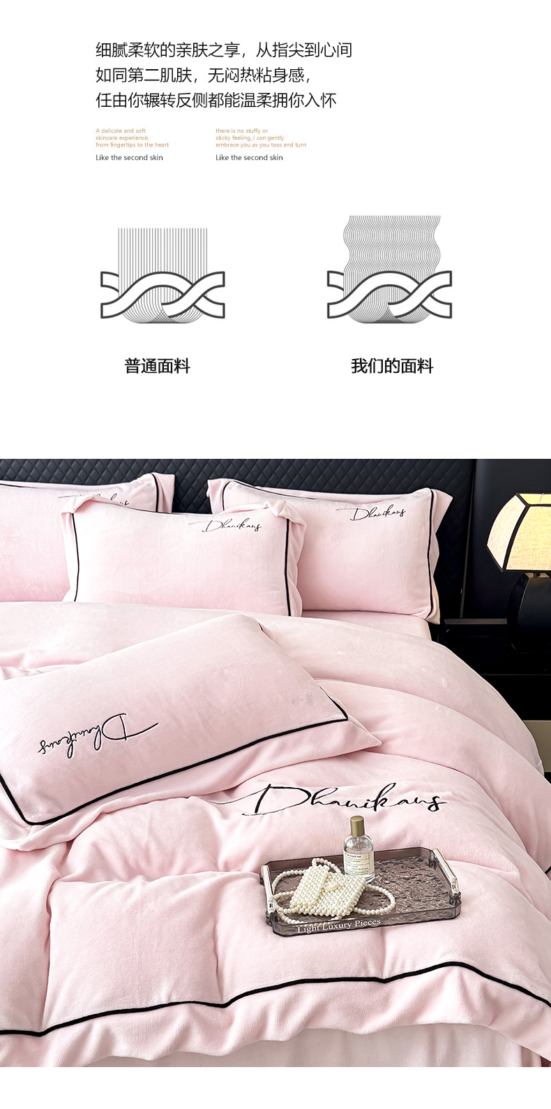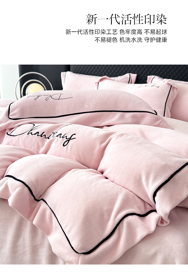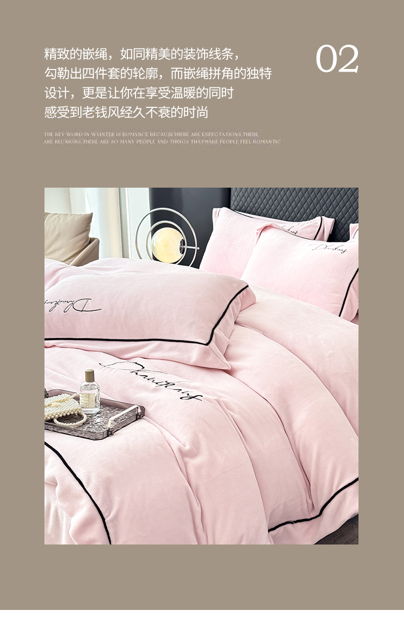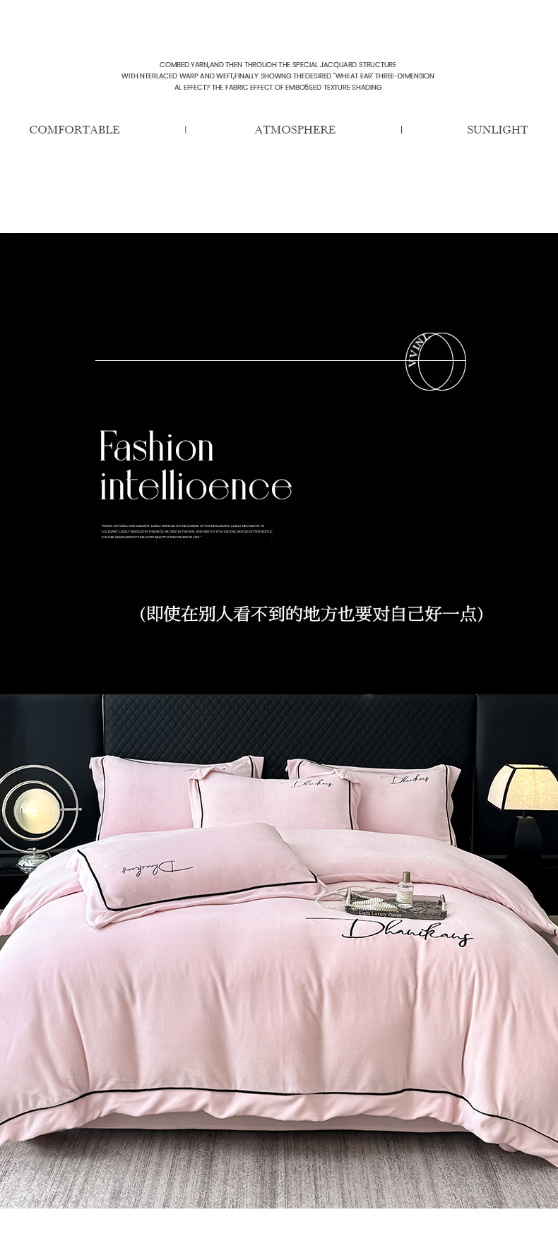 商品名称:KA家纺 2025新款冬轻奢刺绣款嵌绳大拼角牛奶绒四件套 轻奢牛奶绒-粉