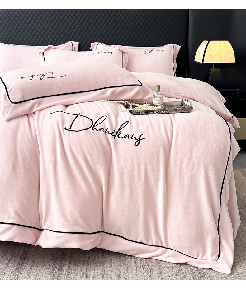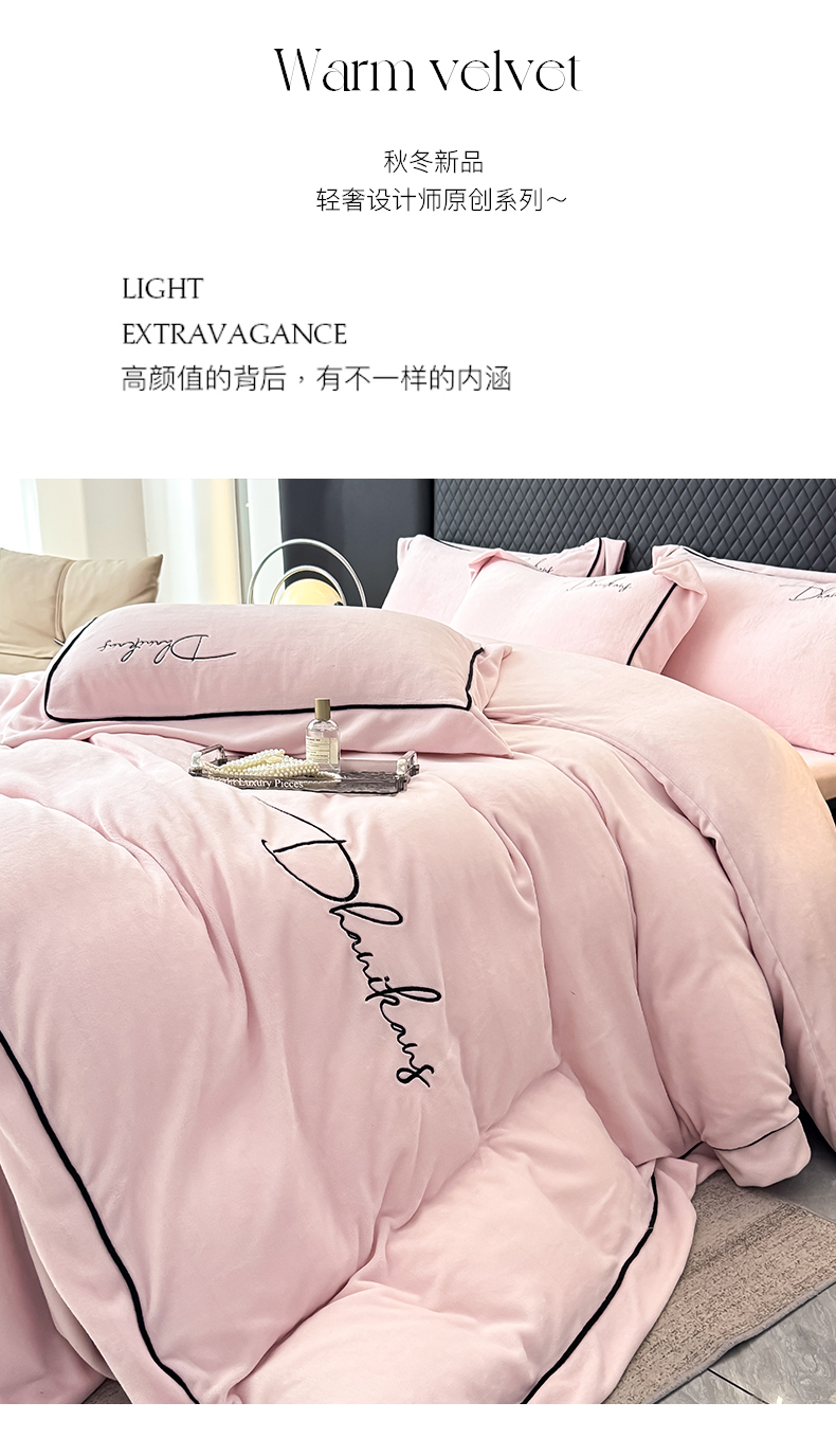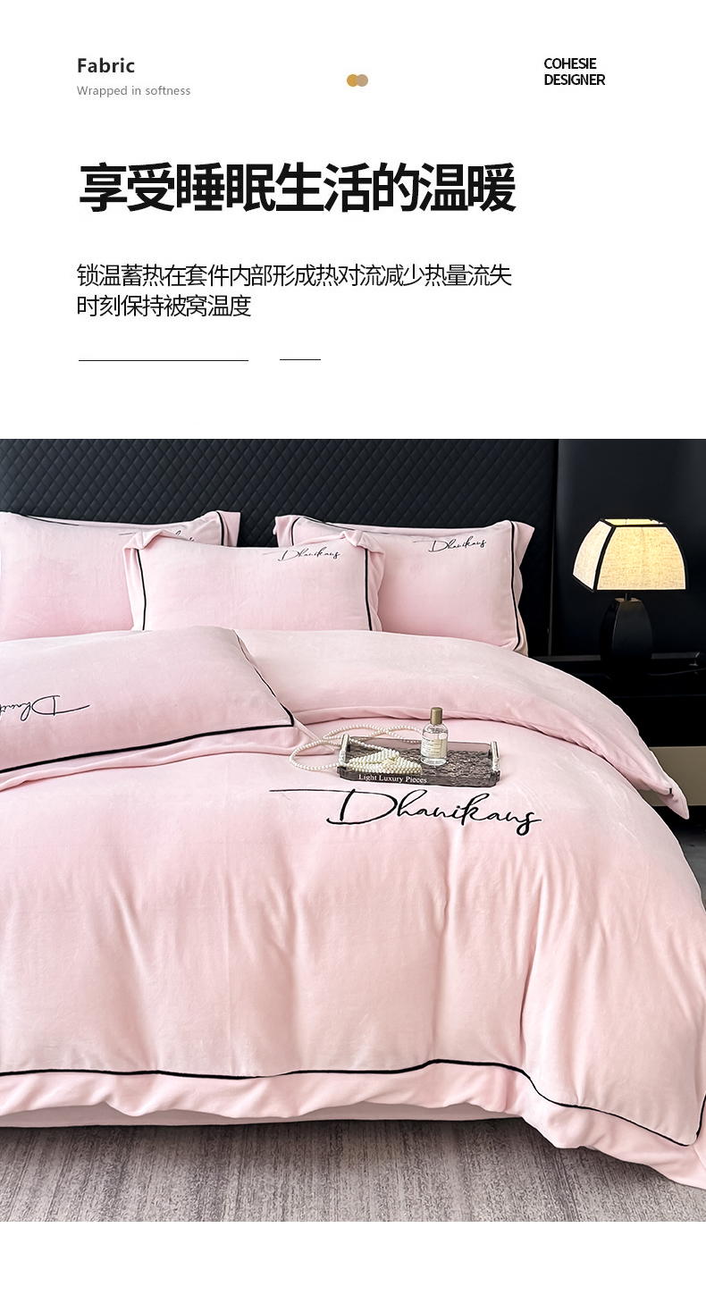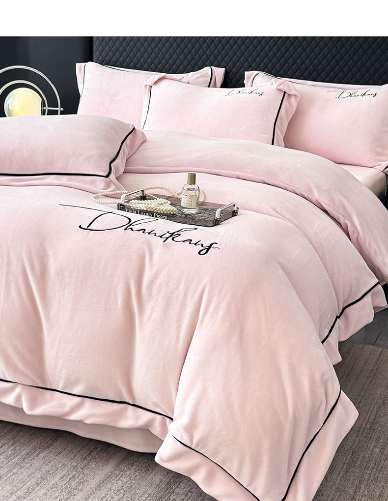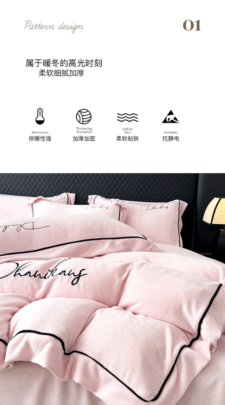 商品名称:KA家纺 2025新款冬轻奢刺绣款嵌绳大拼角牛奶绒四件套 轻奢牛奶绒-粉