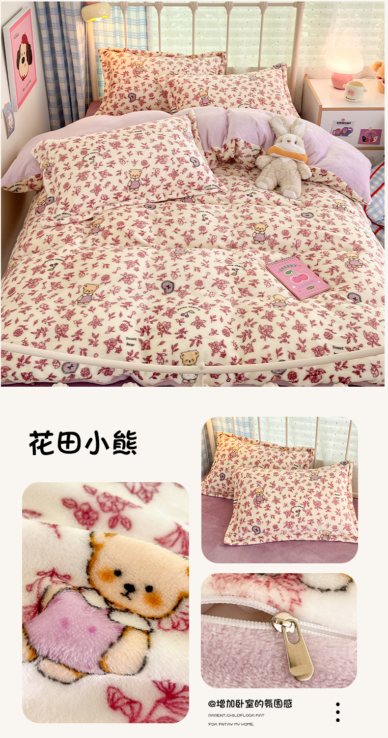 当前位置: 91家纺网 > 商品网购 > 床品套件 > 四件套 > 牛奶绒四件套 > 川悦生活 2025新款加厚牛奶绒印花四件套 花田小熊