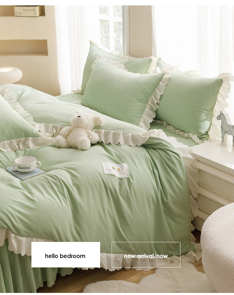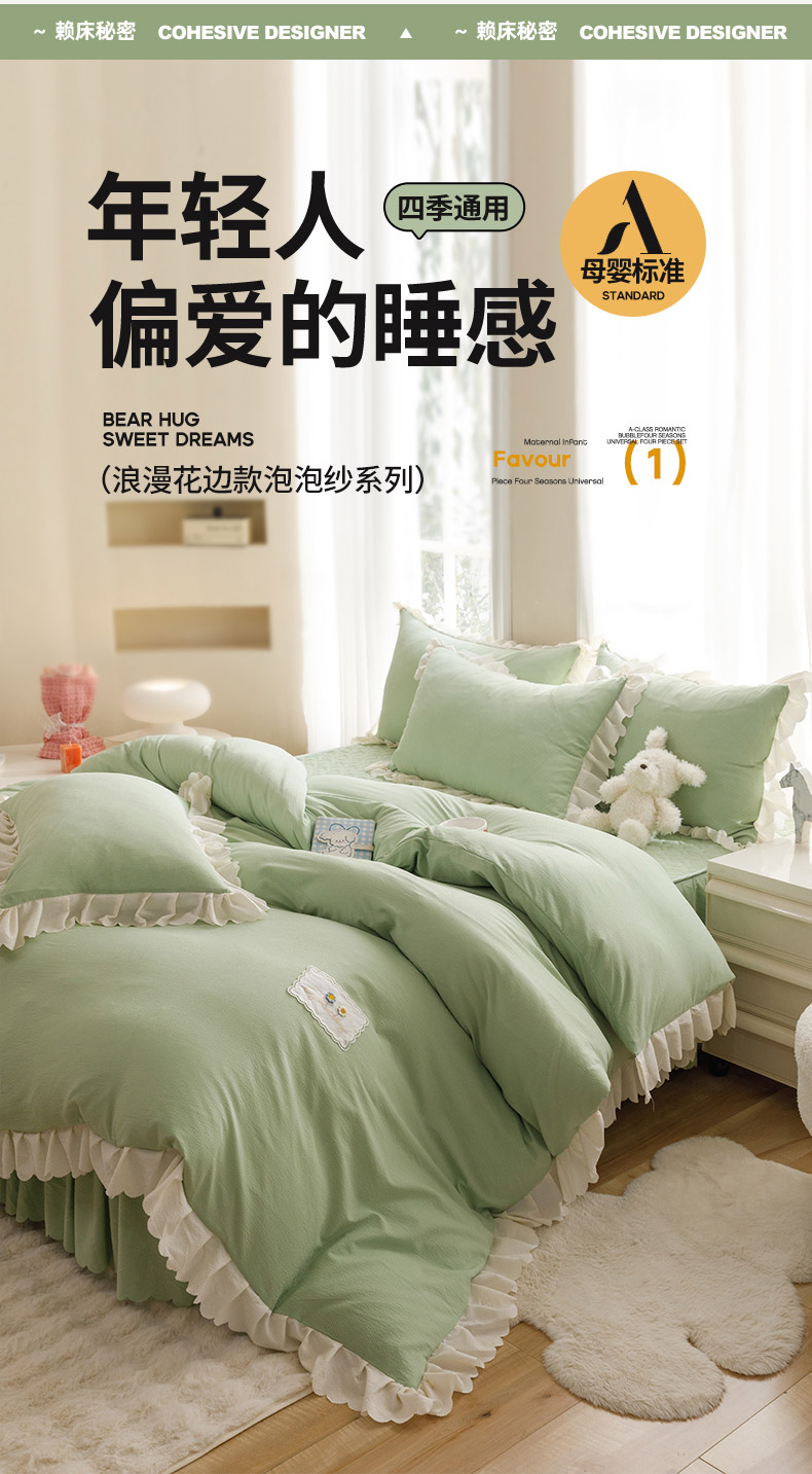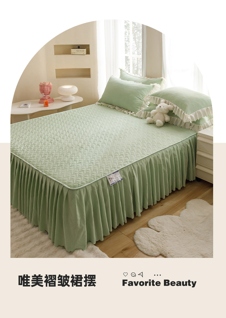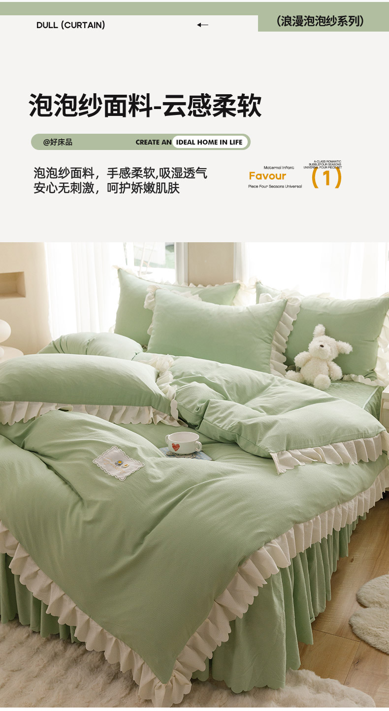 当前位置: 91家纺网 > 商品网购 > 床品套件 > 四件套 > 其它四件套 > 丝印良品 2025新款四季款夹棉泡泡纱床裙床笠被套四件套系列 豆绿