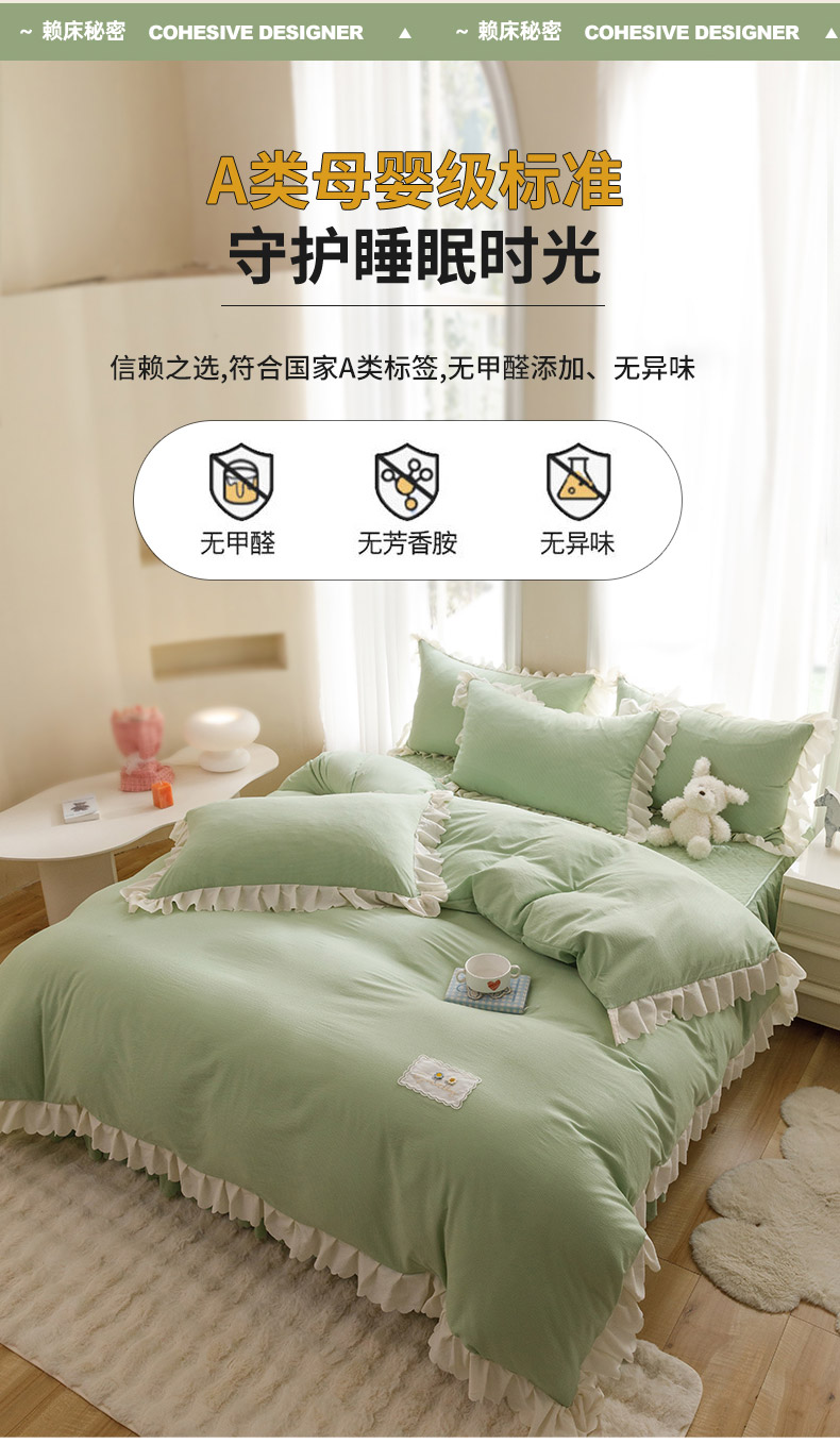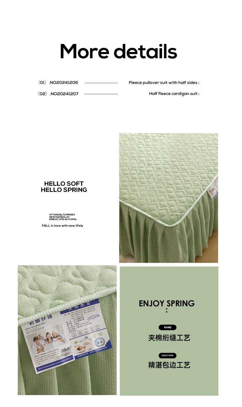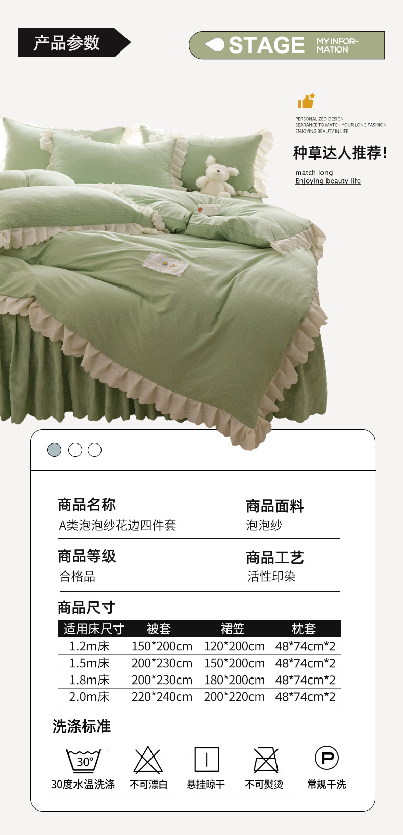当前位置: 91家纺网 > 商品网购 > 床品套件 > 四件套 > 其它四件套 > 丝印良品 2025新款四季款夹棉泡泡纱床裙床笠被套四件套系列 豆绿